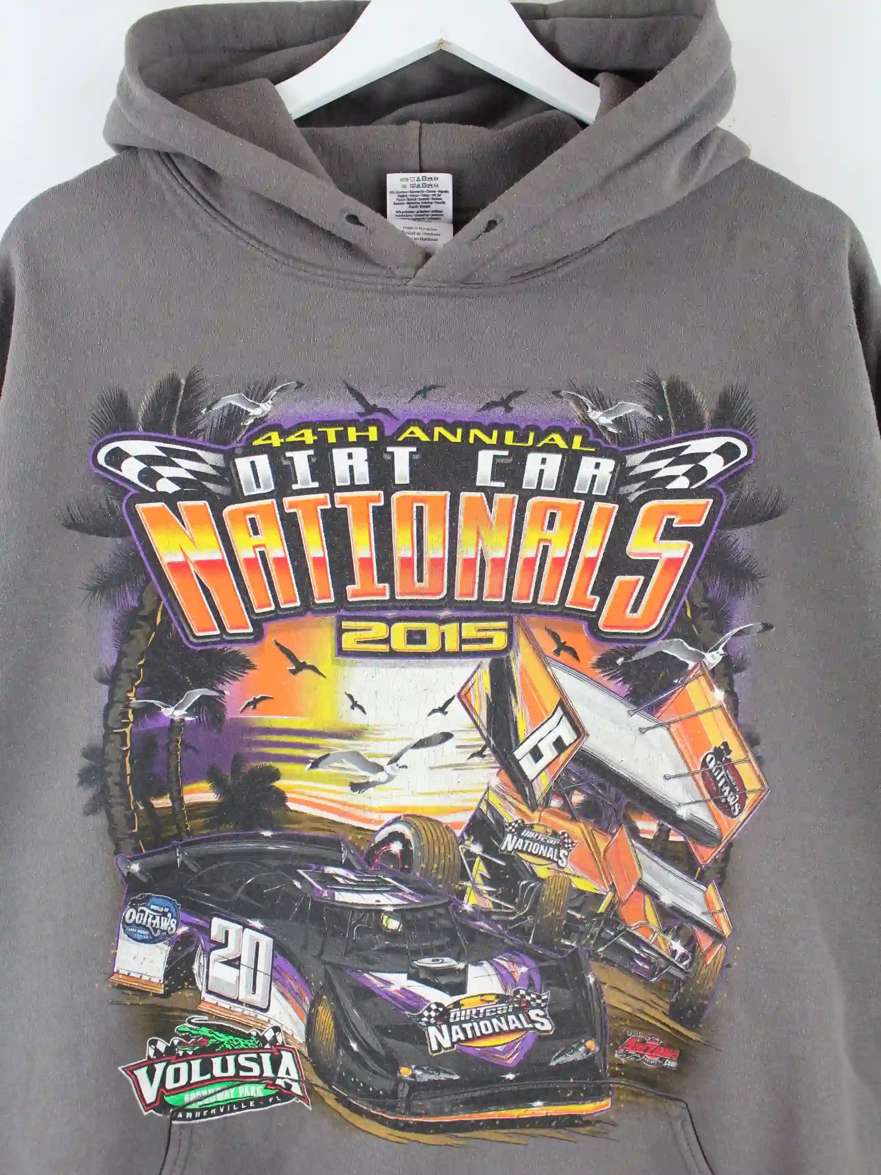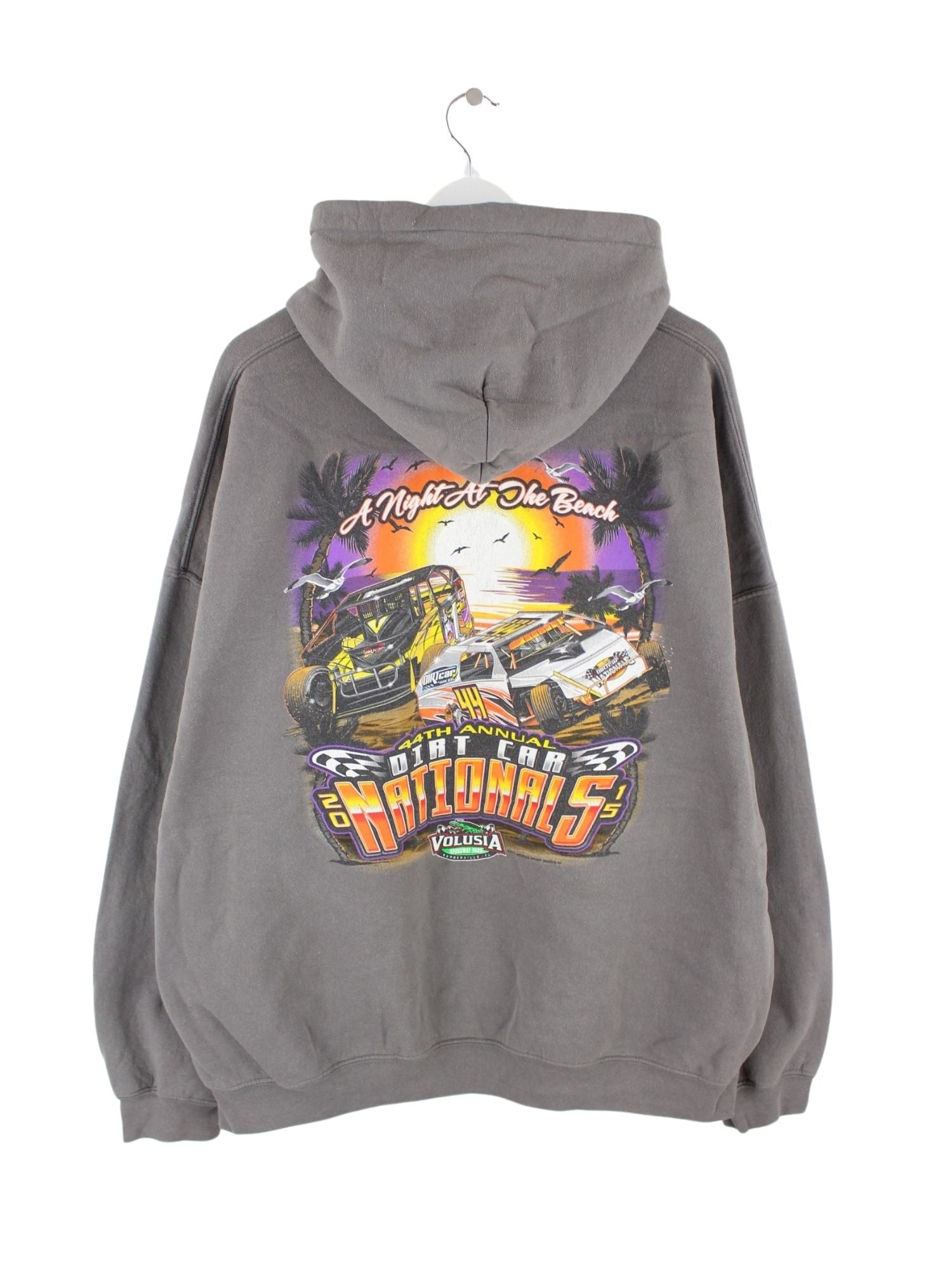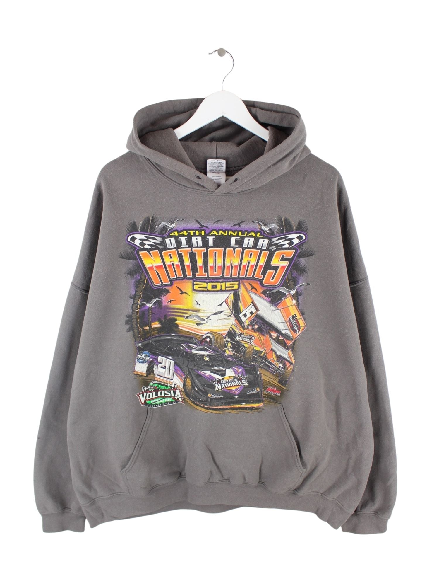 Grauer Hoodie des Labels Gildan in Größe 3XL. Er ist aus einer Baumwollmischung hergestellt. Den Zustand würden wir als 'In Ordnung' bezeichnen (vergl. Bilder).Mit tollem Racing Print.