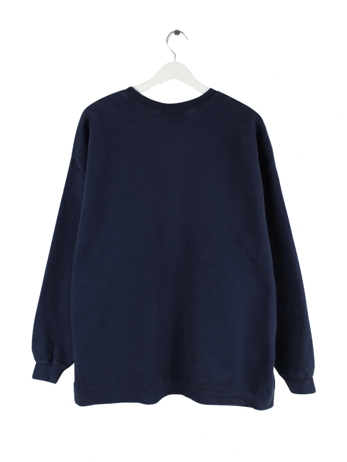 Blauer Sweater mit Stickereien von Hanes in Größe XL. Er ist aus einer Baumwollmischung und in sehr gutem Zustand bei uns vorrätig.