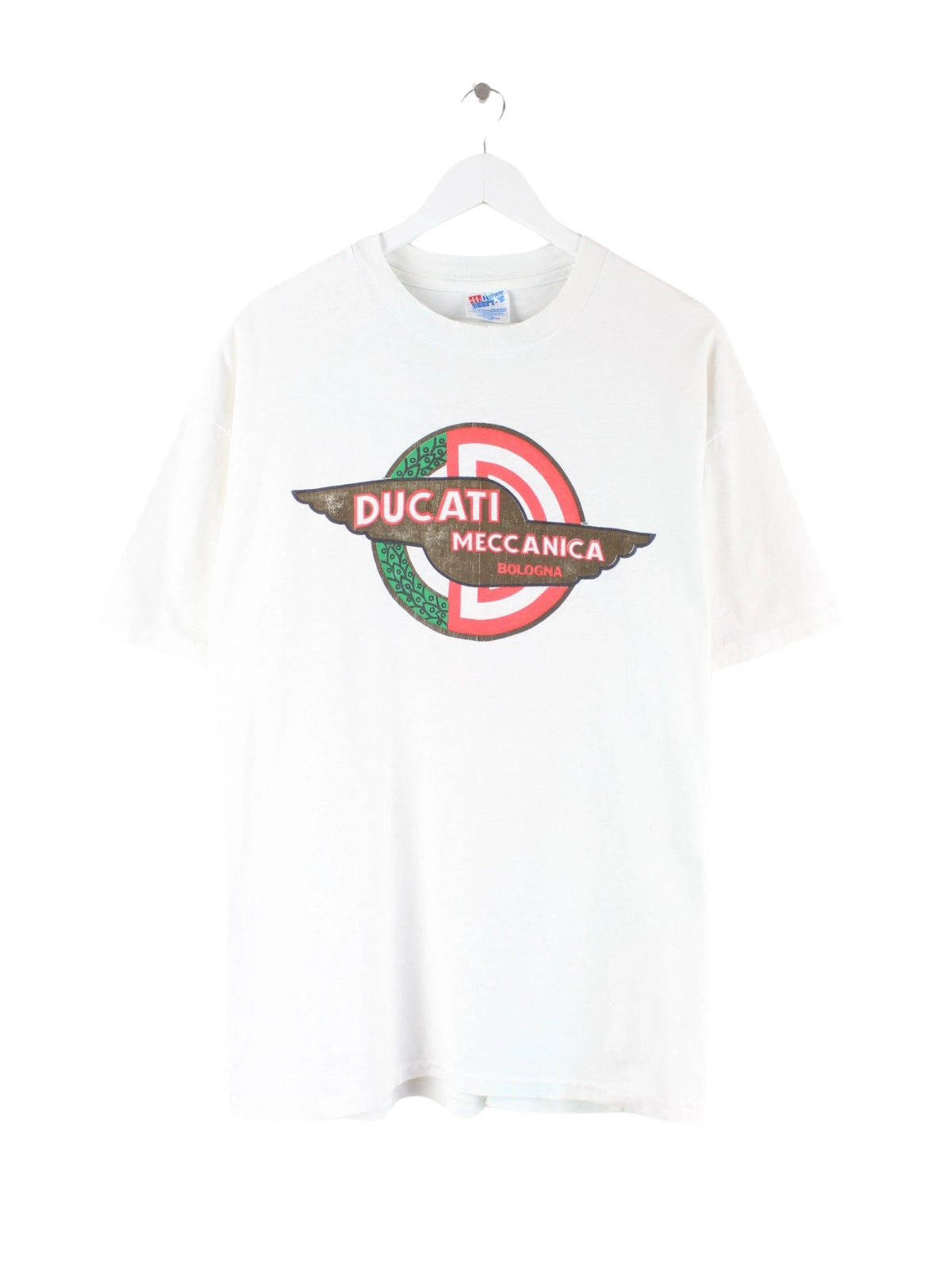 T-Shirt der Marke Hanes in Größe XL aus den 90'ern. Es ist aus Baumwolle hergestellt und in Weiß im Angebot. Mit tollem Ducati Print.