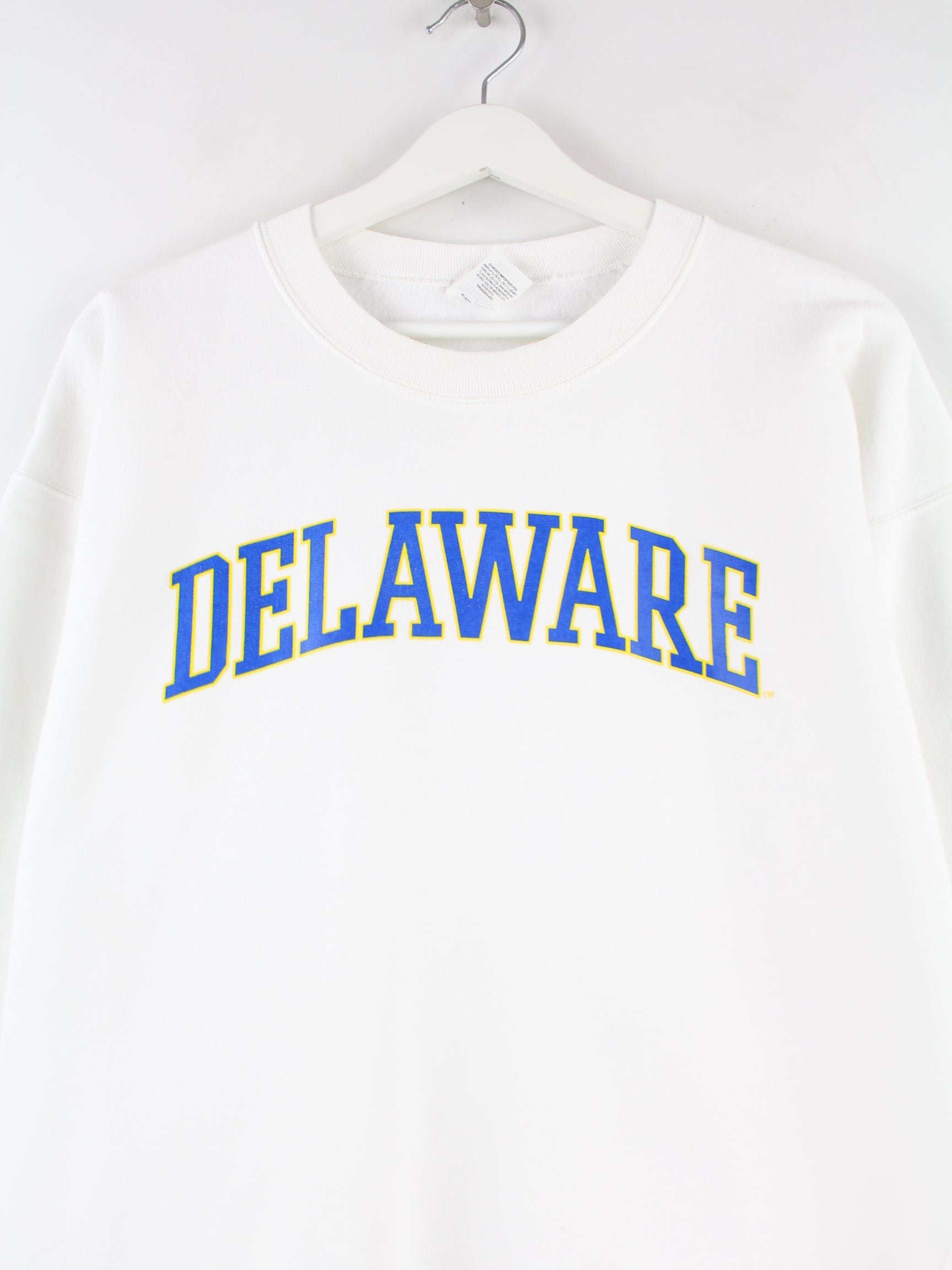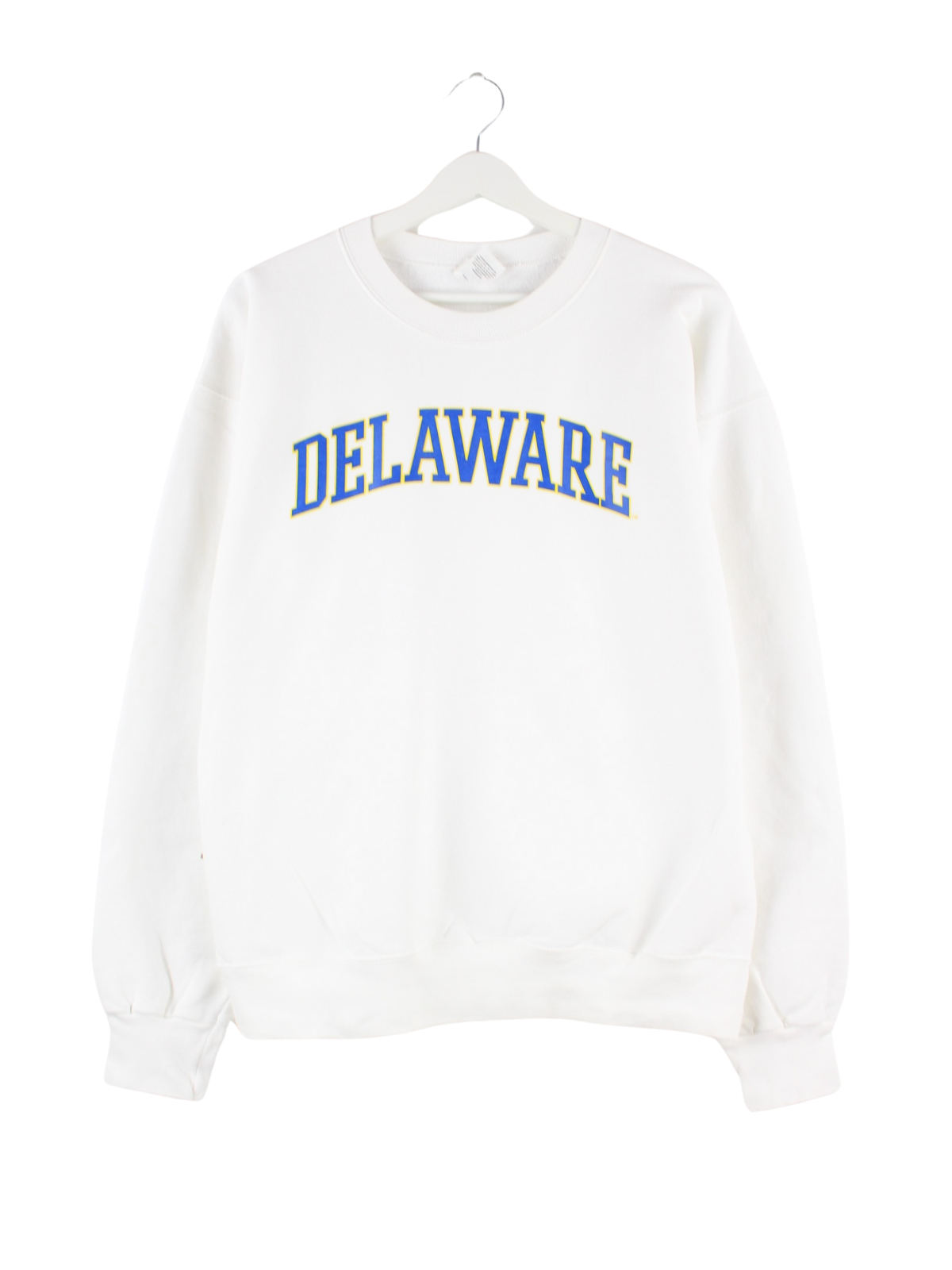 Sweater der Brand Hanes in Größe M aus den 90'ern. Er ist aus einer Baumwollmischung gemacht und in Weiß im Angebot. Mit seltenem Delaware Print.