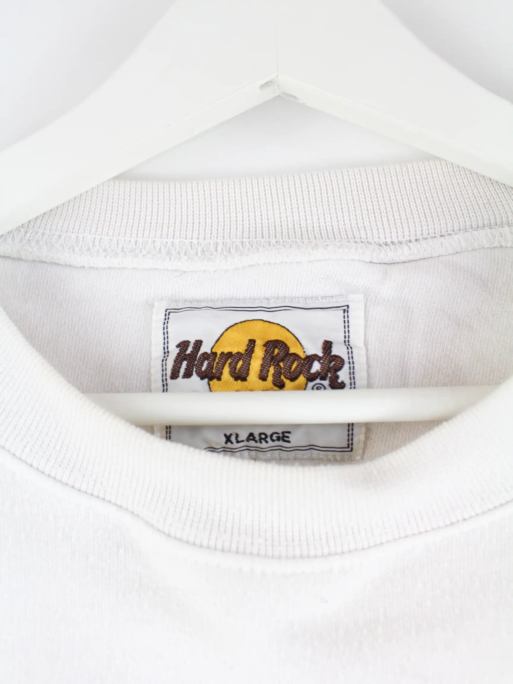 Vintage Sweater der Marke Hard Rock Cafe in Größe XL aus den 90'ern mit großem Logo Aufdruck. Er ist aus einer Baumwollmischung produziert und in Weiß zu haben.
