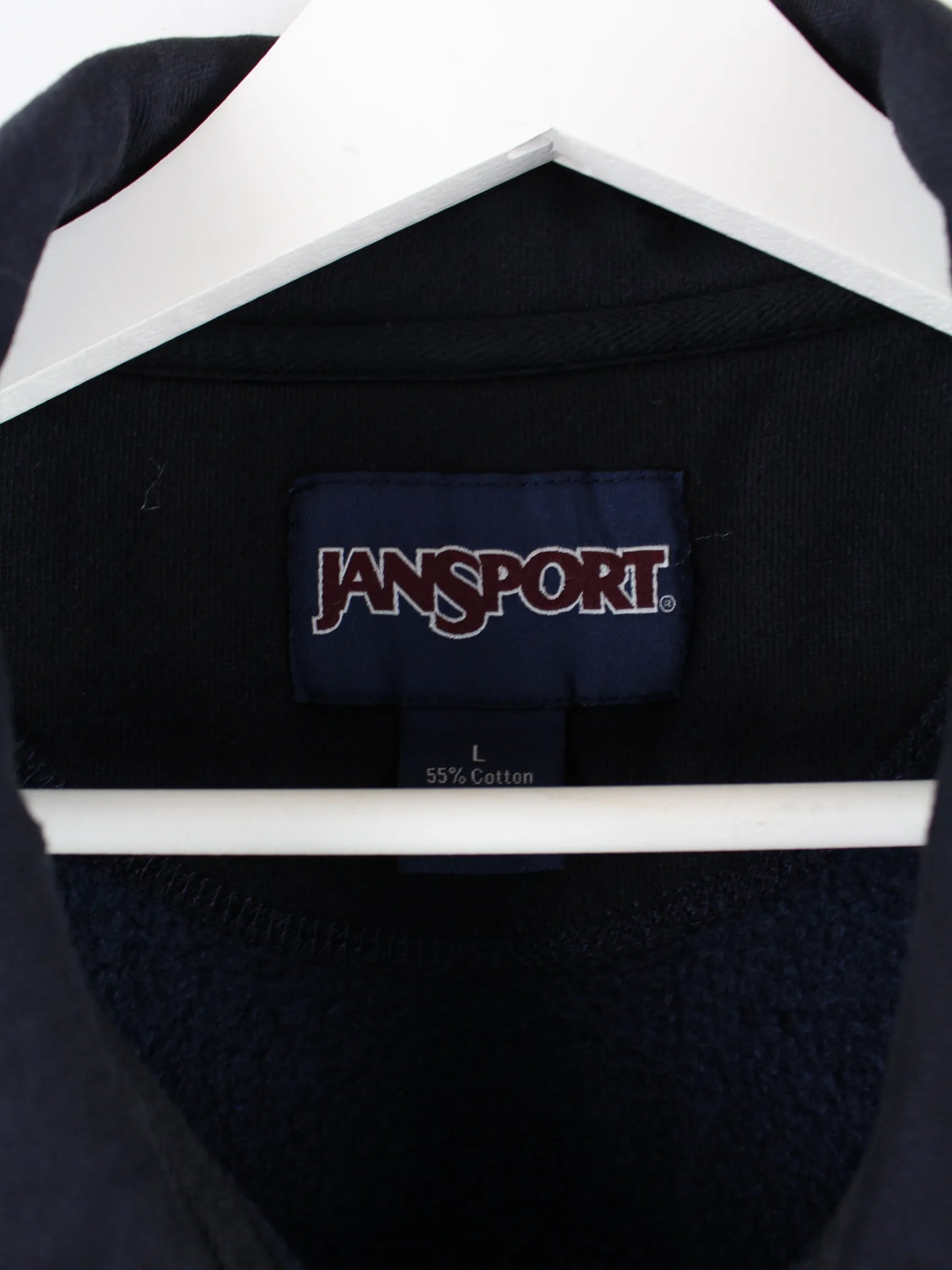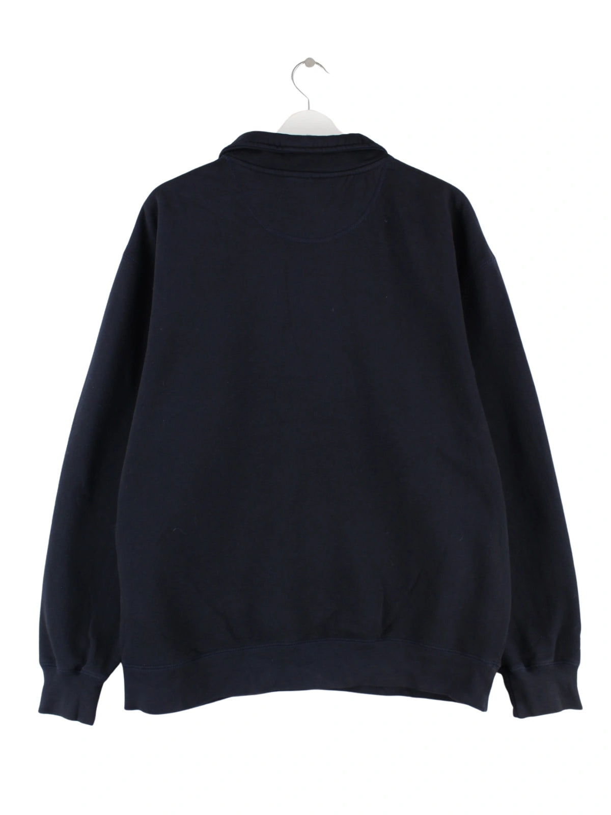 Blauer Sweater mit Stickereien und halbem Reißverschluß des Labels Jansport in Größe L. Er ist aus einer Baumwollmischung gefertigt und in sehr gutem Zustand bei uns vorrätig.