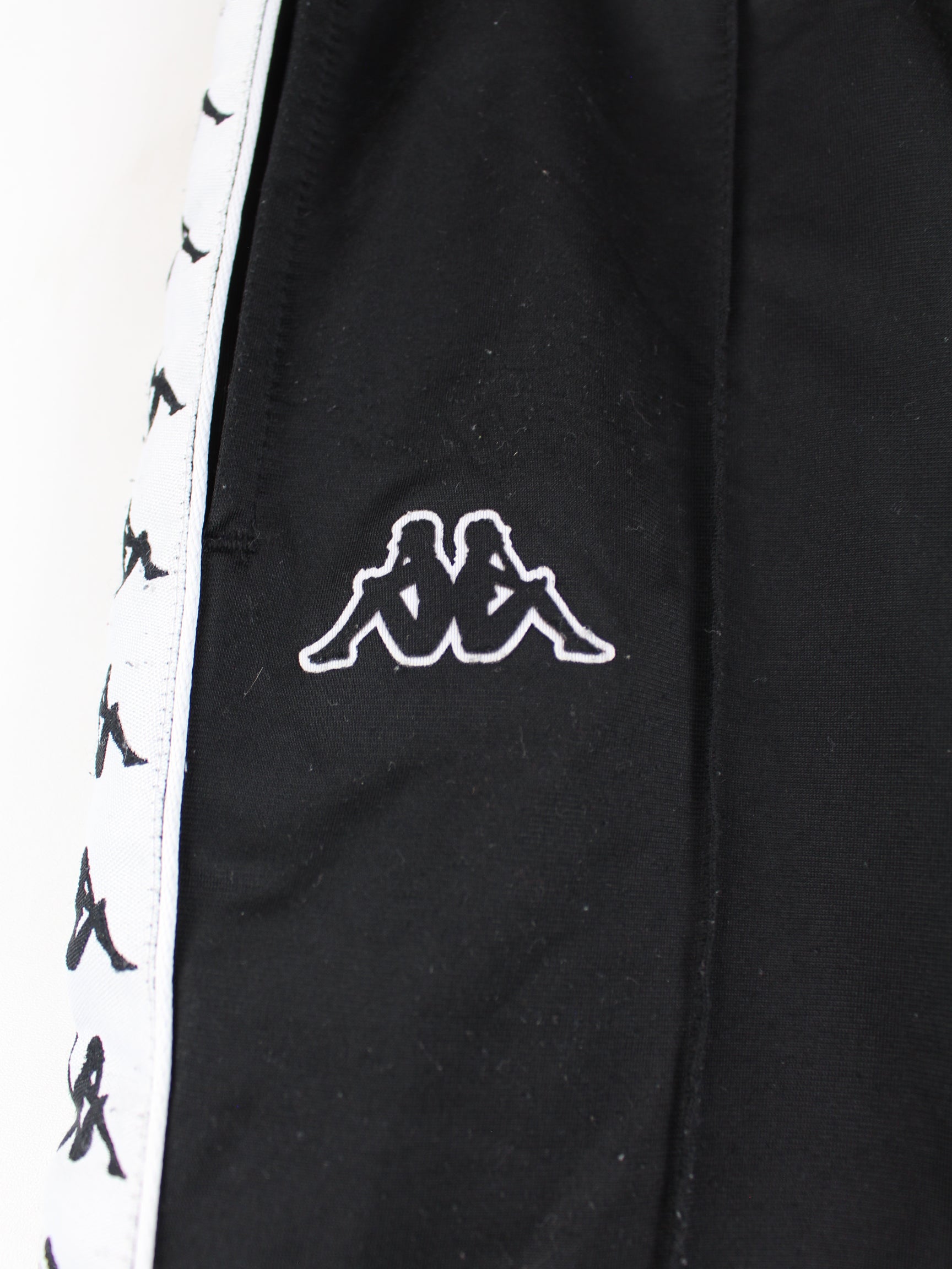 Schwarze Track Pants vom Brand Kappa in Größe S. Sie sind aus Synthetik gefertigt und in gutem Zustand bei uns zu bekommen.