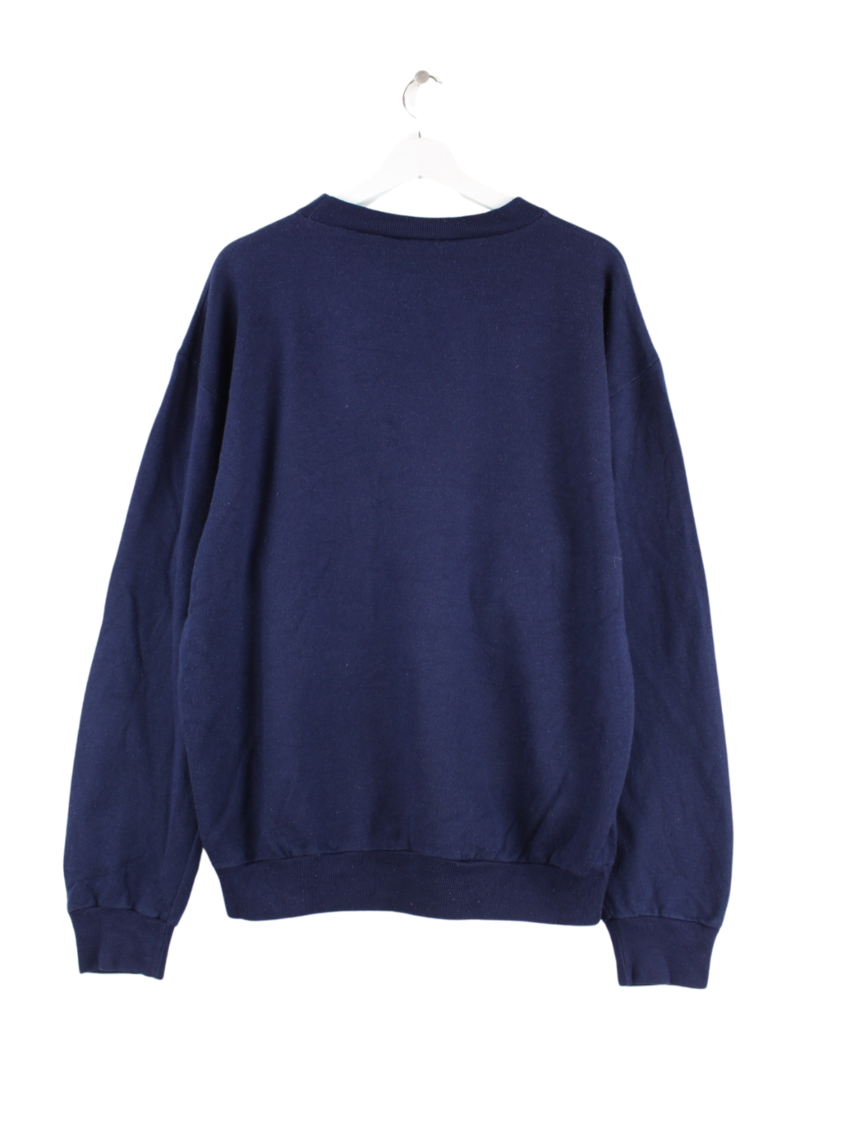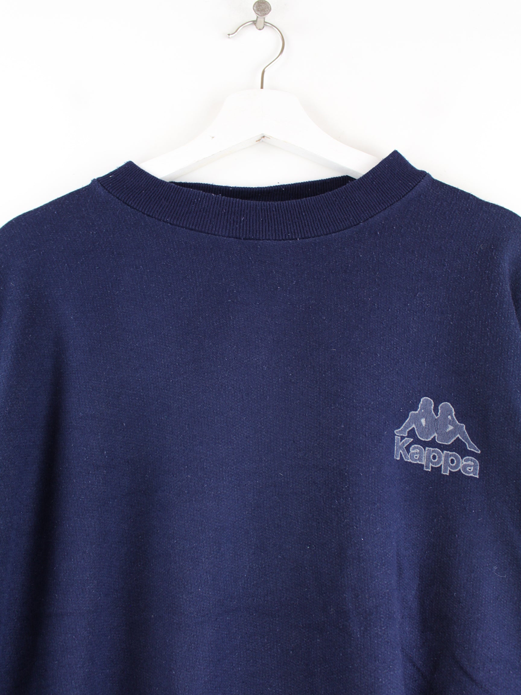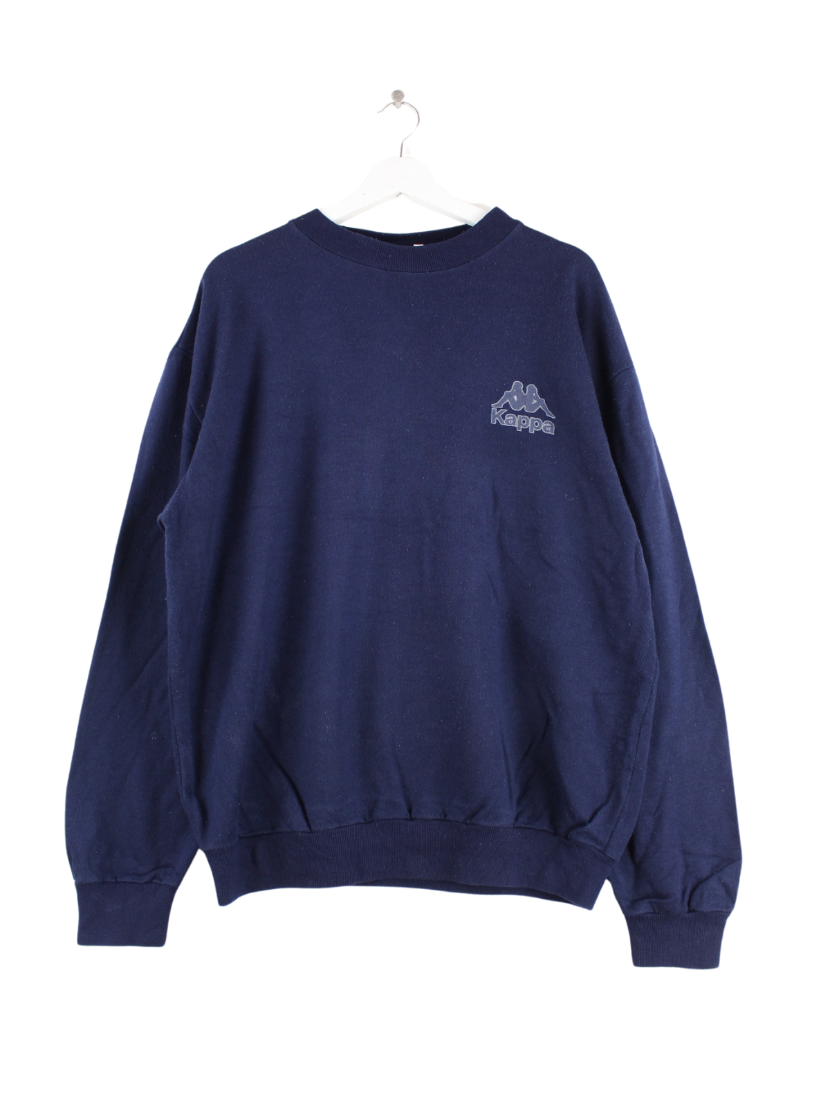 Sweater vom Label Kappa in Größe L aus den 80'ern. Er ist aus einer Baumwollmischung gemacht und in Blau zu haben. Mit chiquem Vintage Print.