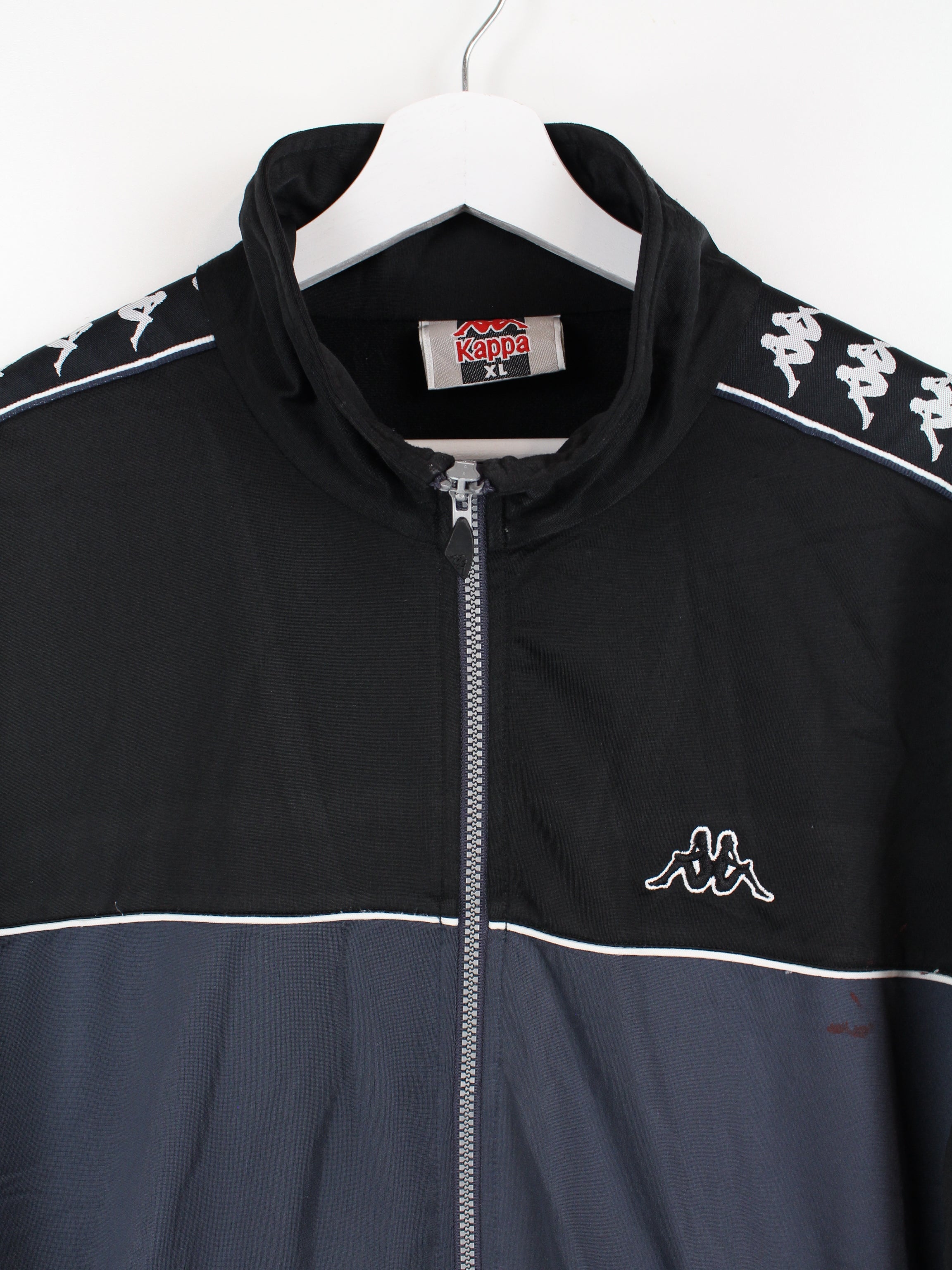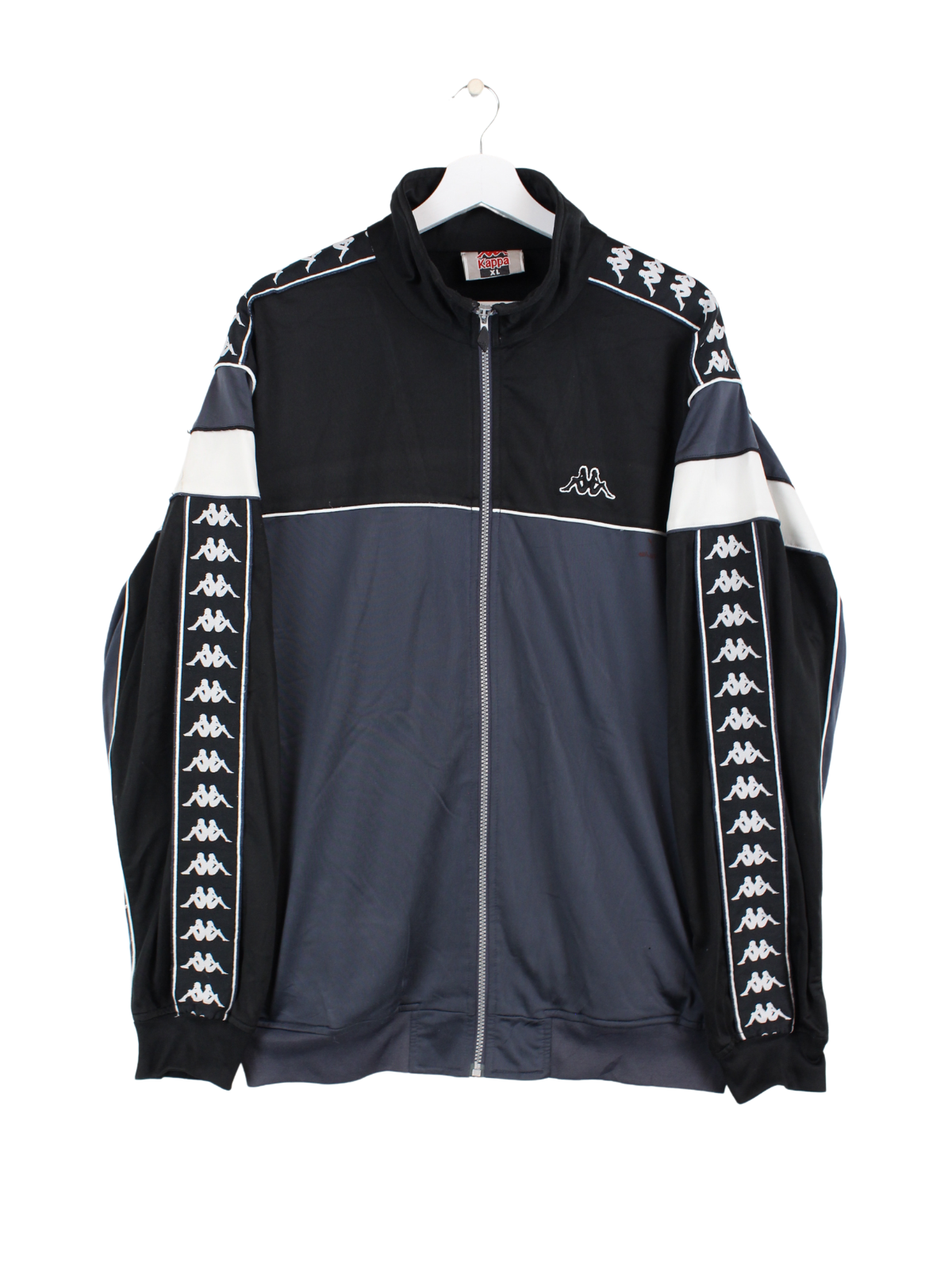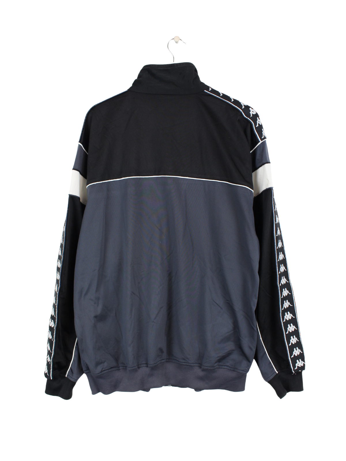 Graue Kappa Trainingsjacke mit Tape Muster auf den Ärmeln.