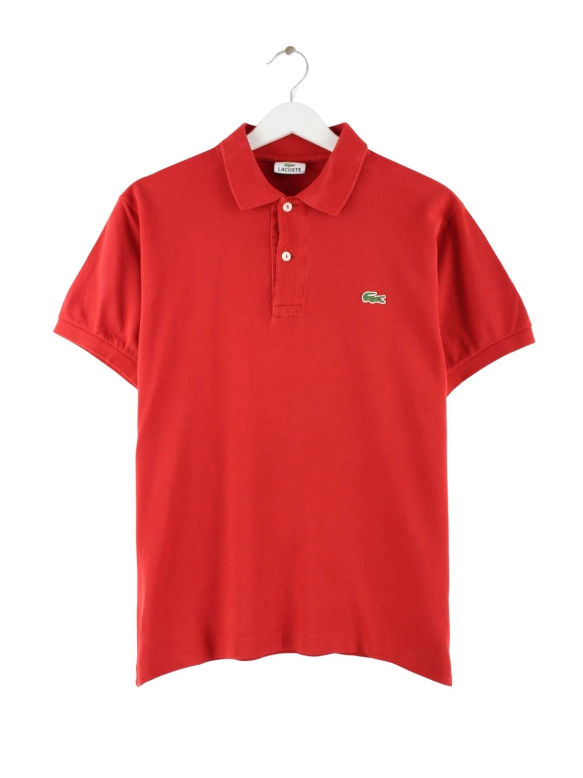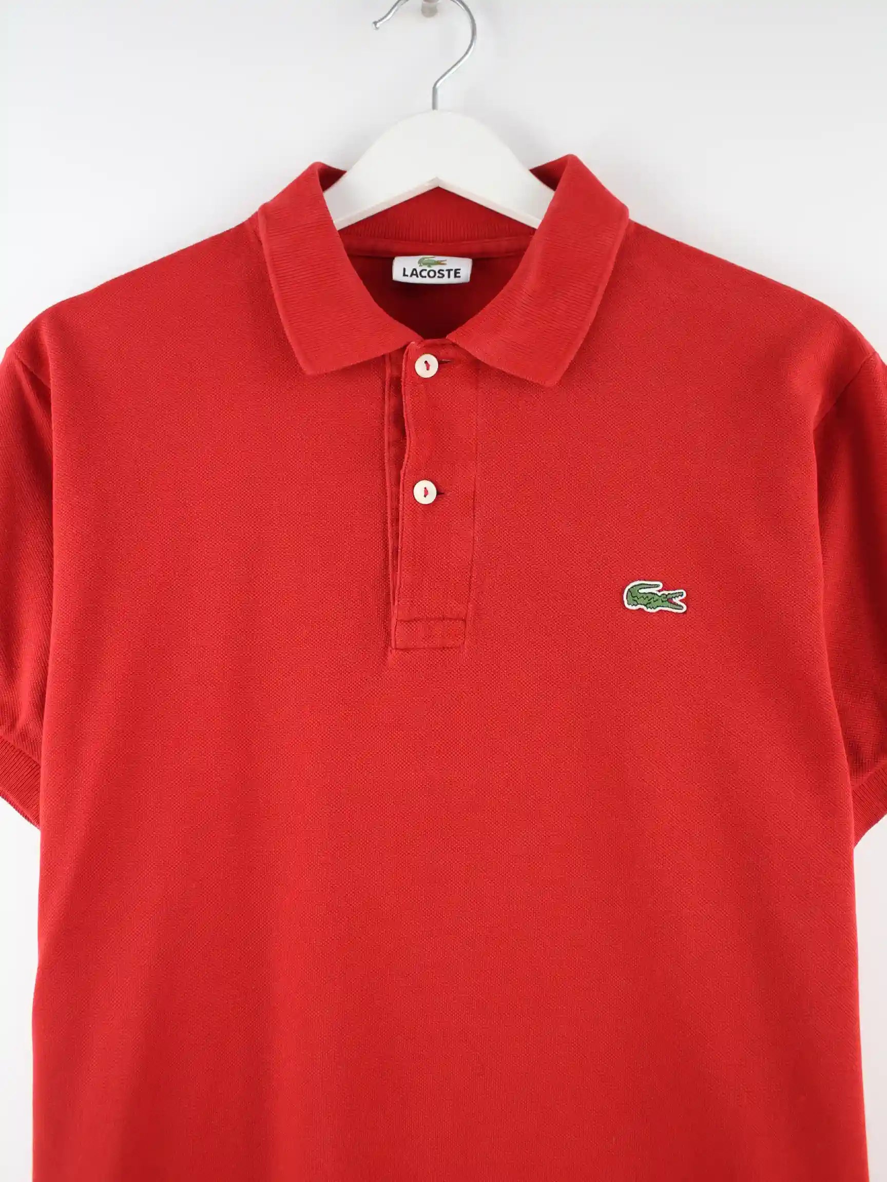 Rotes Poloshirt von Lacoste in Größe S. Es ist aus Baumwolle angefertigt. Den Zustand würden wir als 'In Ordnung' bezeichnen (vergl. Bilder).