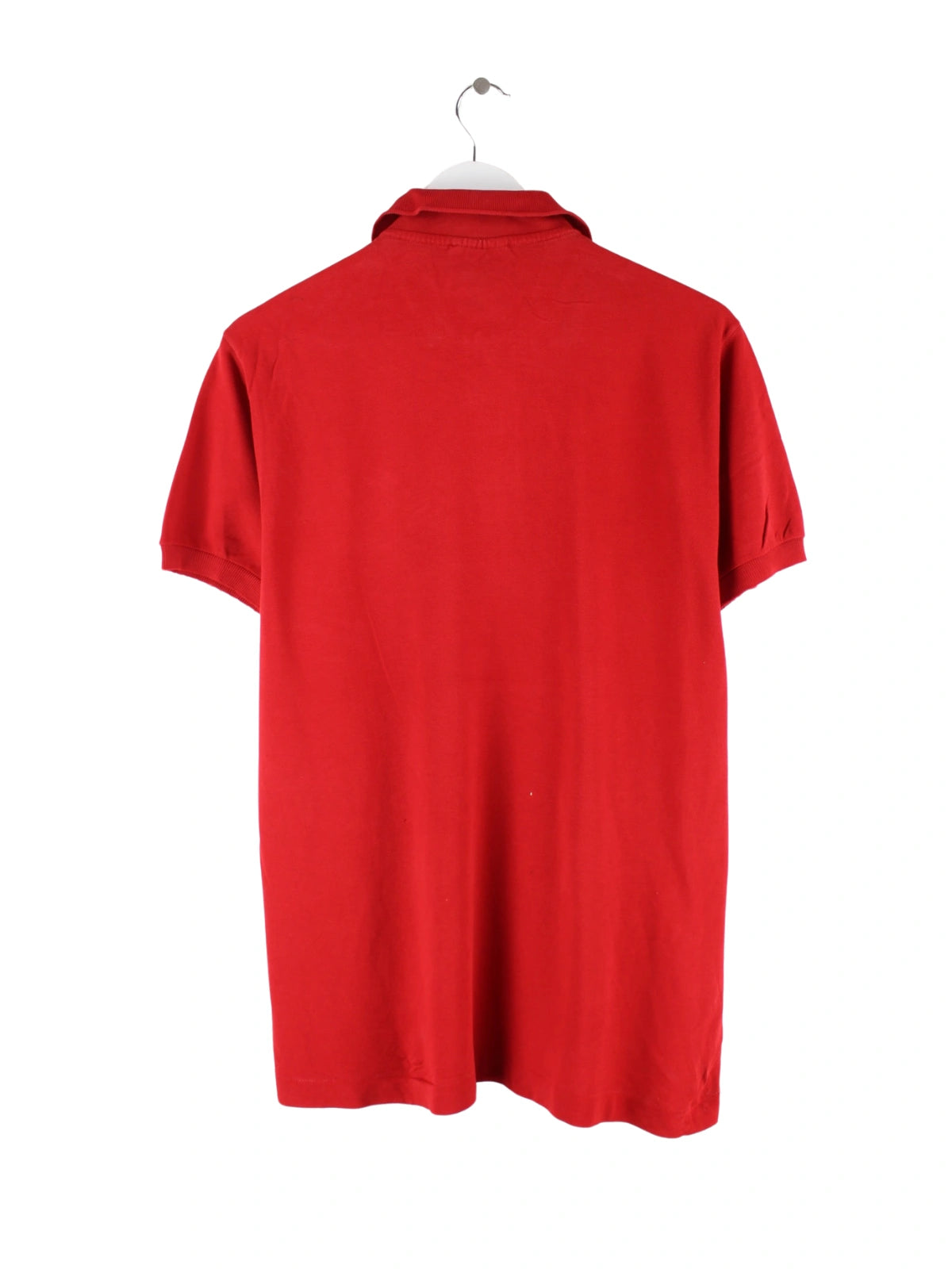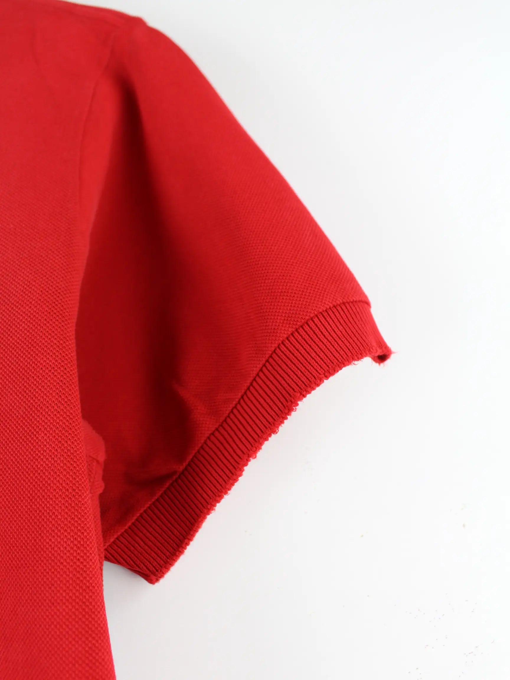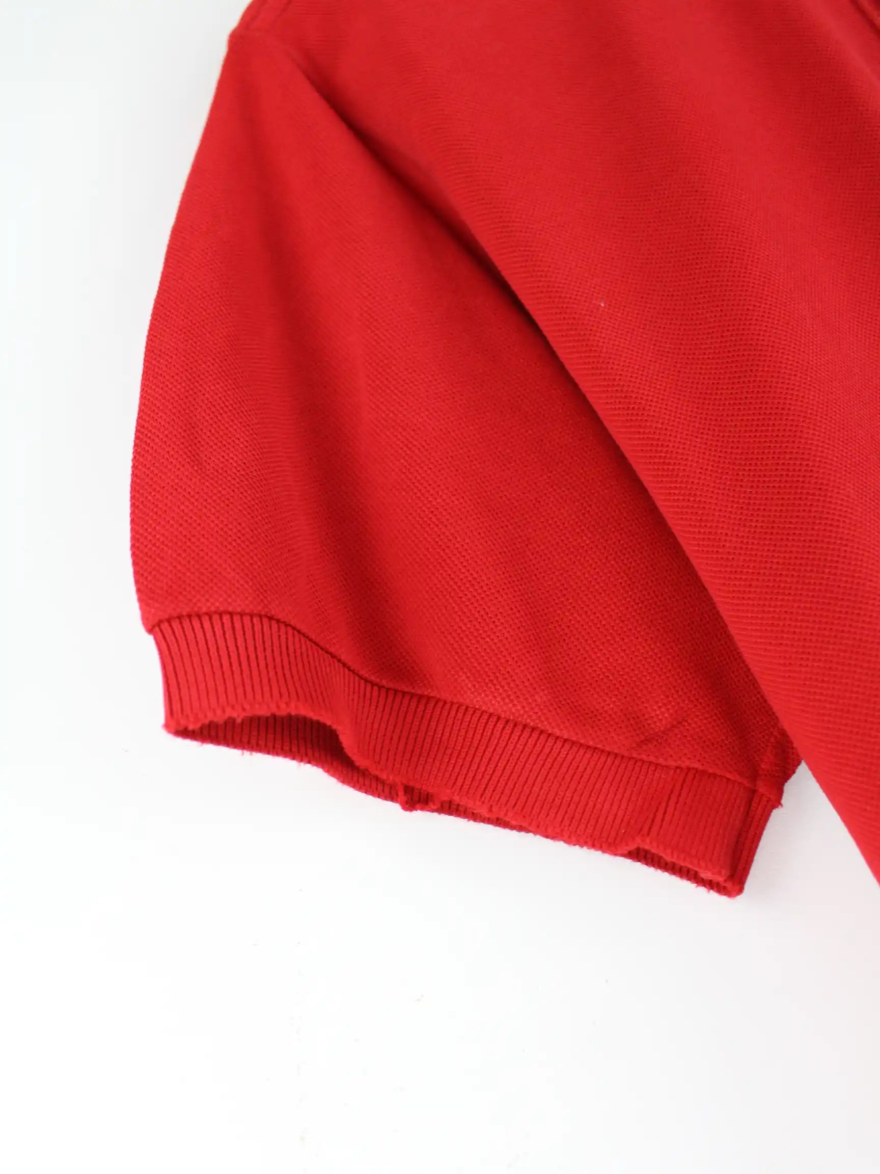 Rotes Poloshirt vom Label Lacoste aus den 90'ern in Größe M. Es ist aus einer Baumwollmischung gemacht und in gutem Zustand lieferbar.