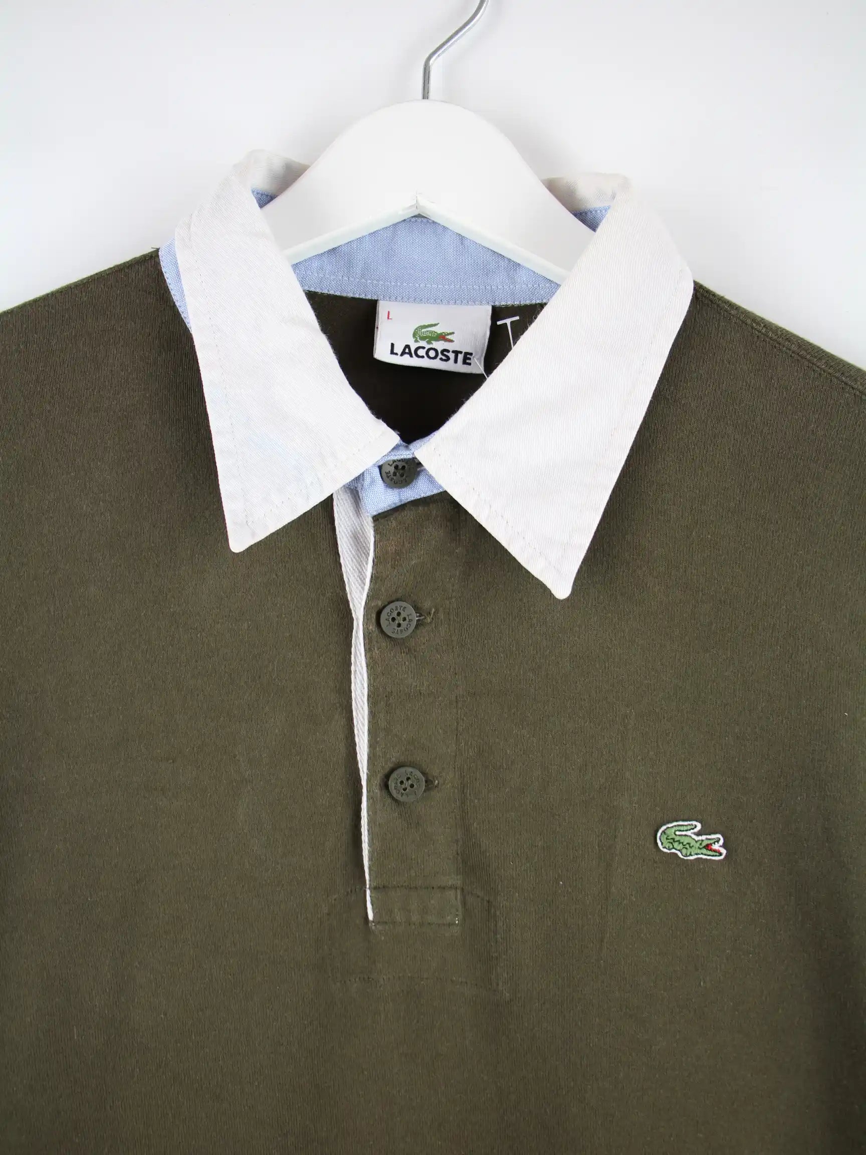 Grünes Poloshirt vom Label Lacoste in Größe L. Es ist aus Baumwolle hergestellt und in gutem Zustand im Bestand.