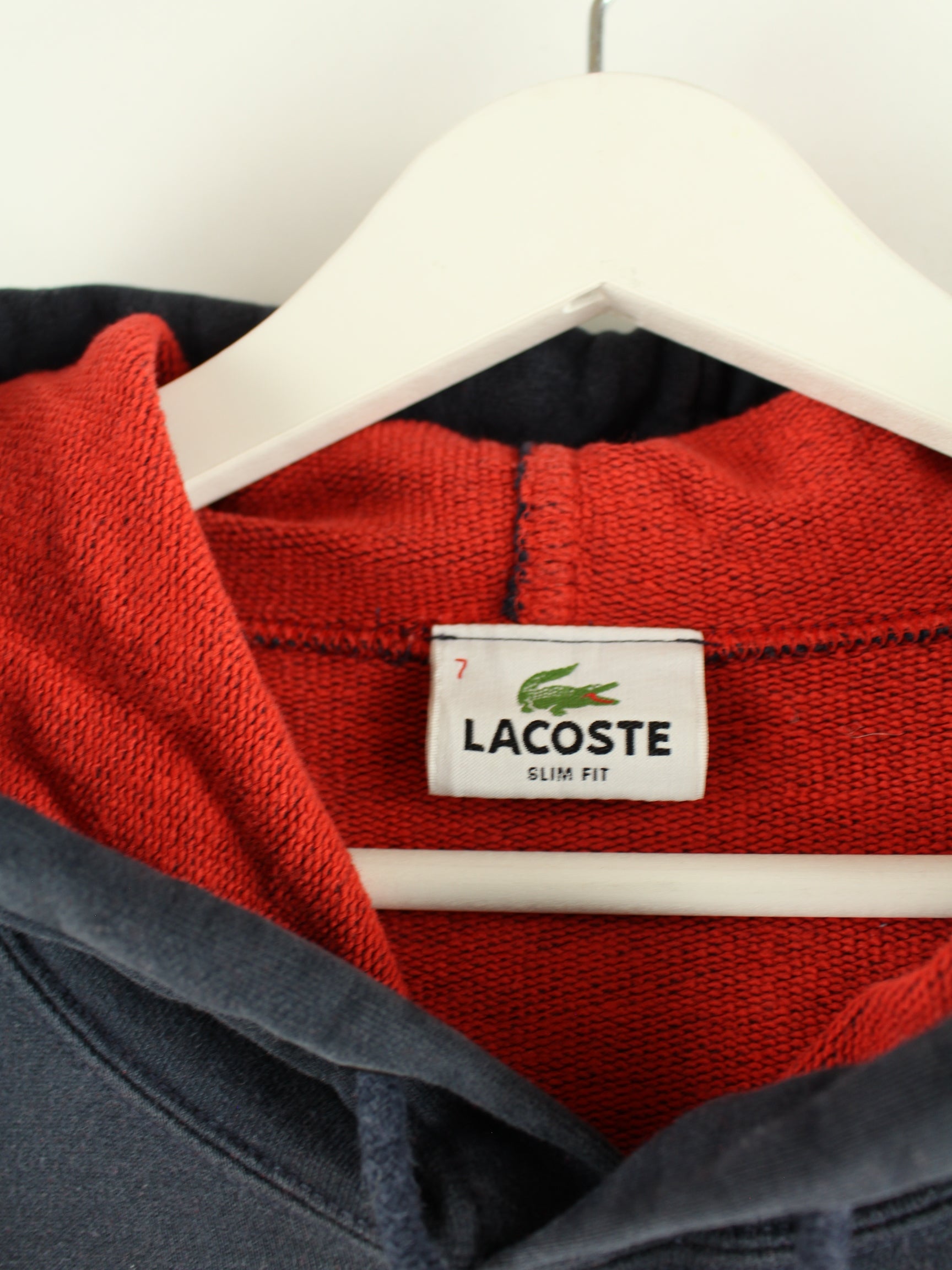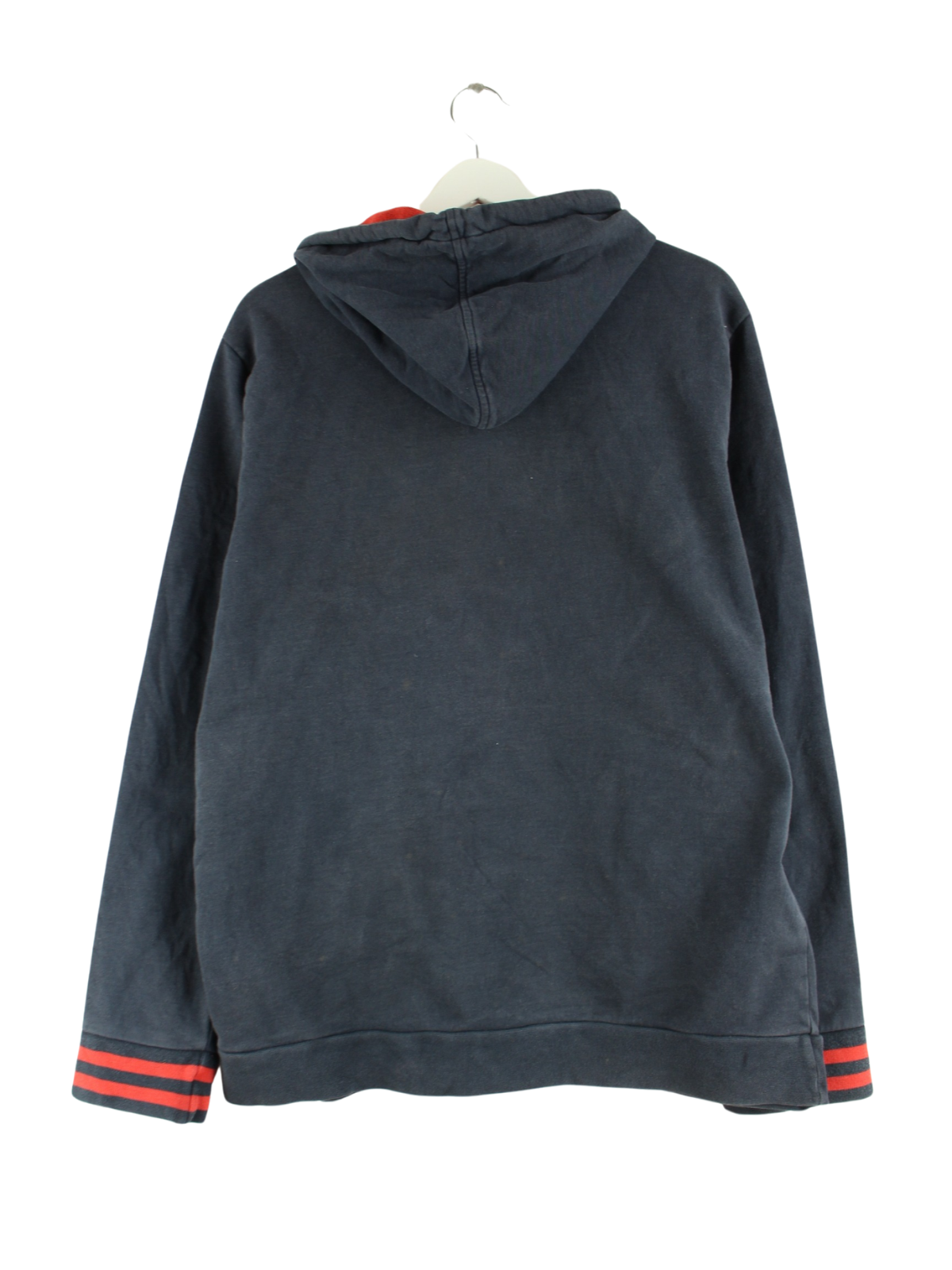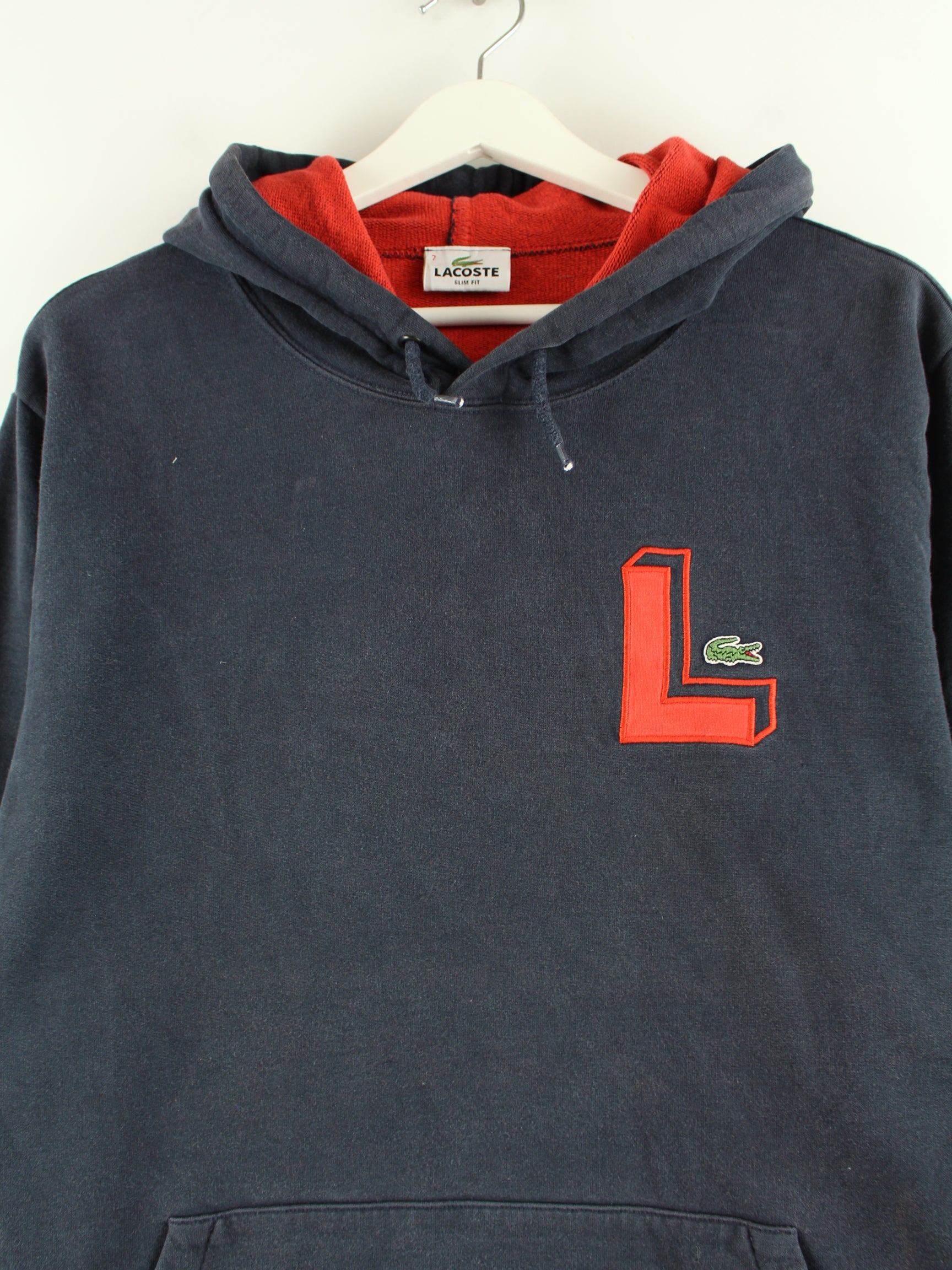 Hoodie der Brand Lacoste mit Stickereien in Größe L aus Anfang der 2000'er. Er ist aus einer Baumwollmischung gefertigt und in Blau zu haben.
