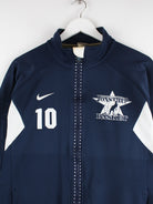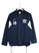 Blaue Trainingsjacke der Brand Nike in Größe S. Sie ist aus Synthetik hergestellt. Den Zustand würden wir als 'In Ordnung' bezeichnen (vergl. Bilder).Mit tollem Team Print.