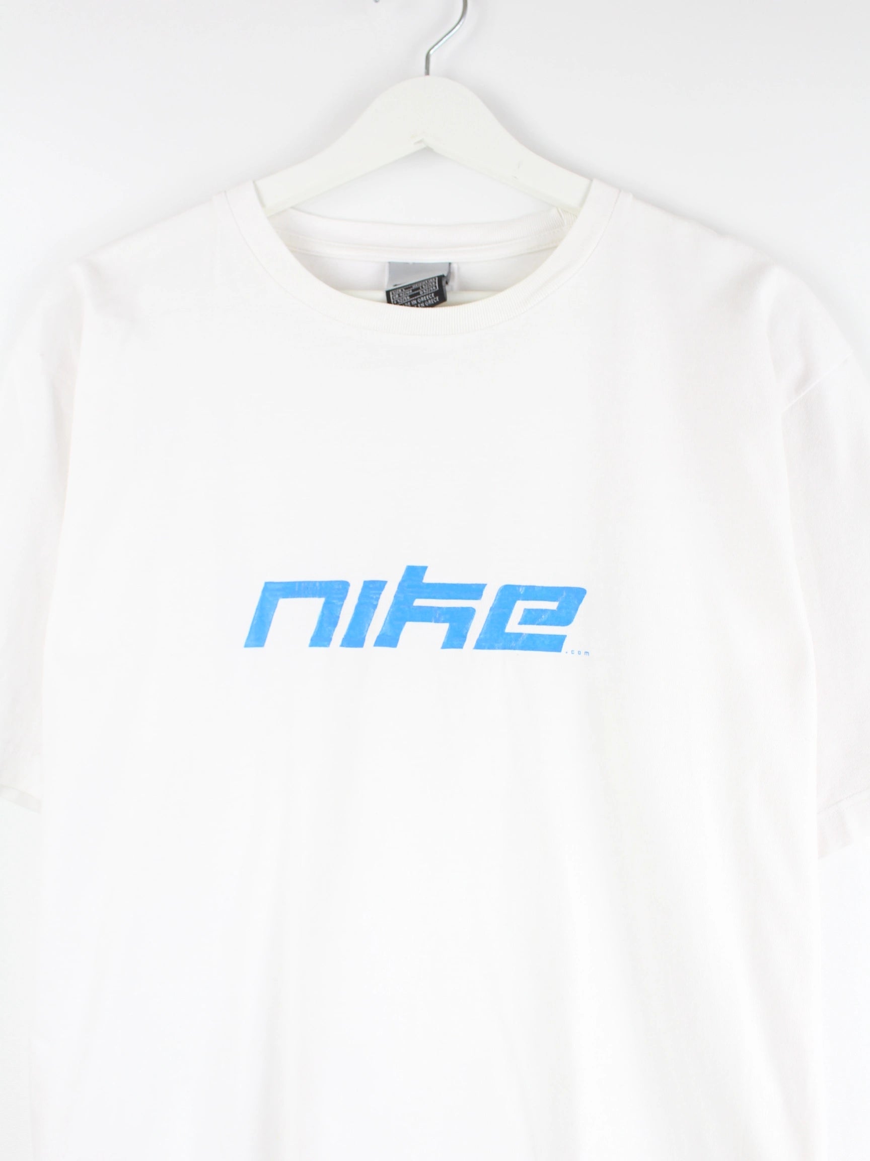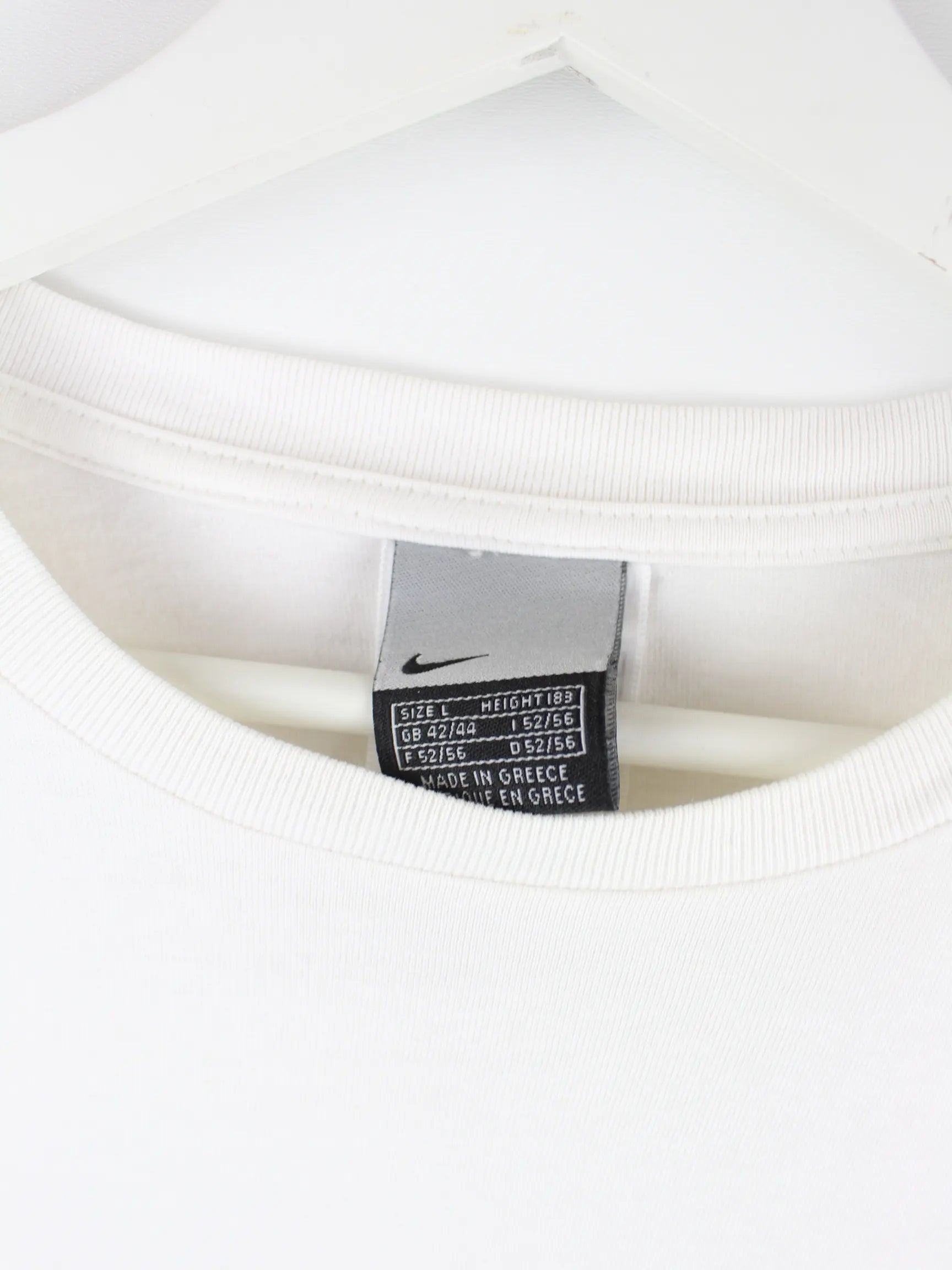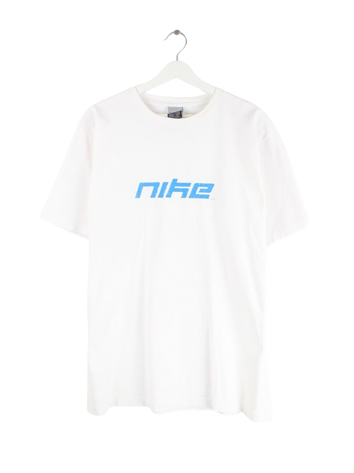 Weißes T-Shirt der Brand Nike in Größe L. Es ist aus Baumwolle angefertigt und in gutem Zustand im Angebot. Mit schickem Spellout Print.