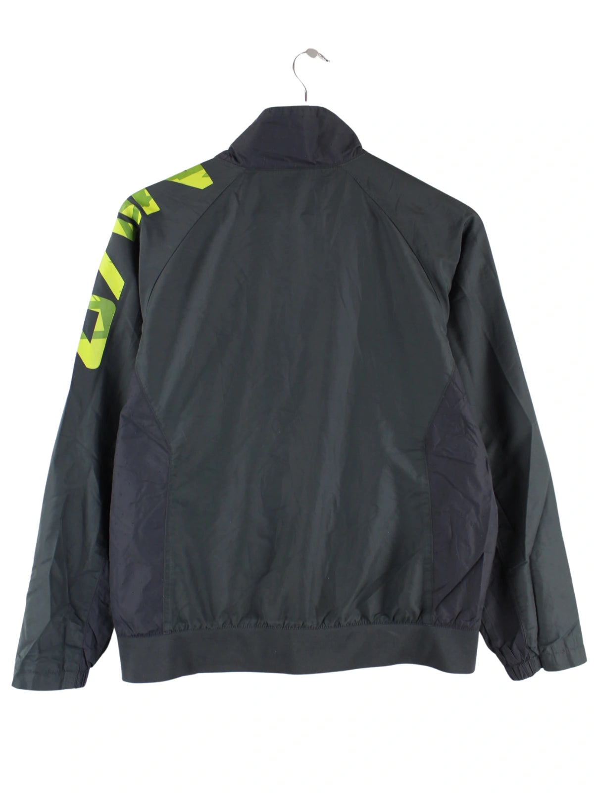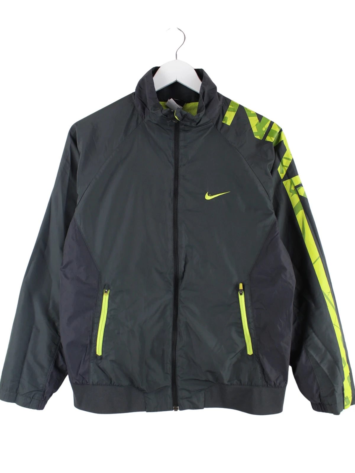 Graue Trainingsjacke von Nike in Größe XL. Sie ist aus Synthetik angefertigt und in sehr gutem Zustand bei uns zu bekommen. Mit chiquem Swoosh Print.