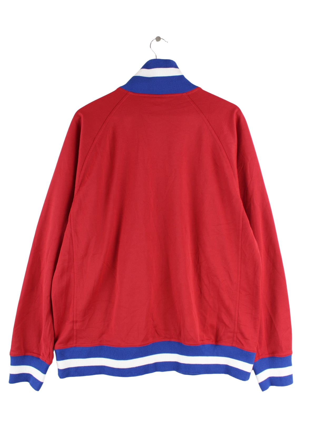 Rote Sweatjacke mit Stick vom Label Nike in Größe XL. Sie ist aus einer Synthetikmischung und in gutem Zustand bei uns zu bekommen.