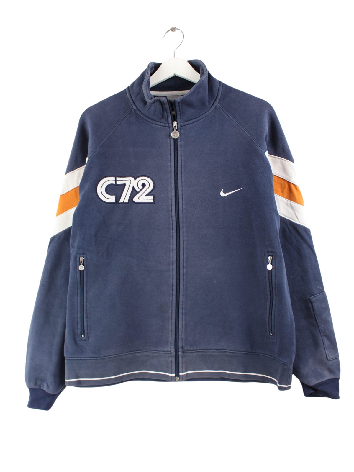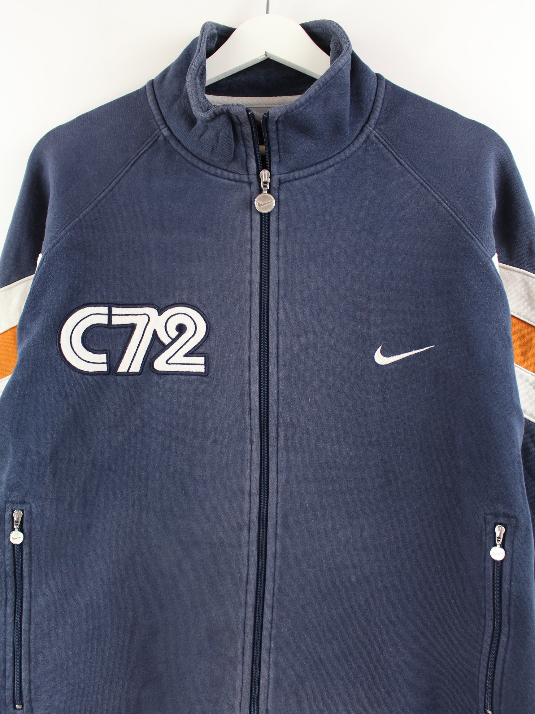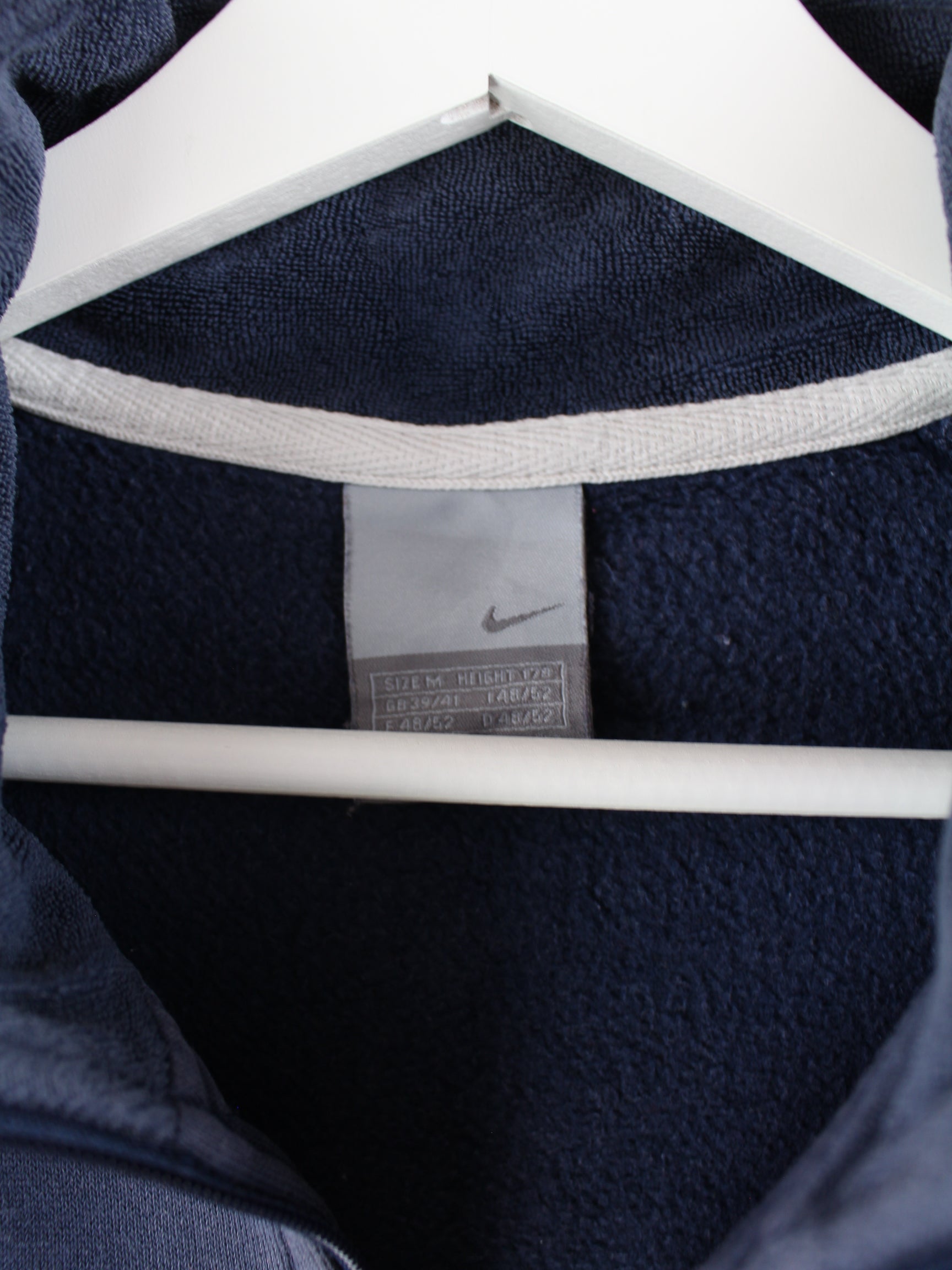 Blaue Sweatjacke mit Stickereien vom Label Nike aus Anfang der 2000'er in Größe M. Sie ist aus einer Baumwollmischung gefertigt. Den Zustand würden wir als 'In Ordnung' bezeichnen (vergl. Bilder).