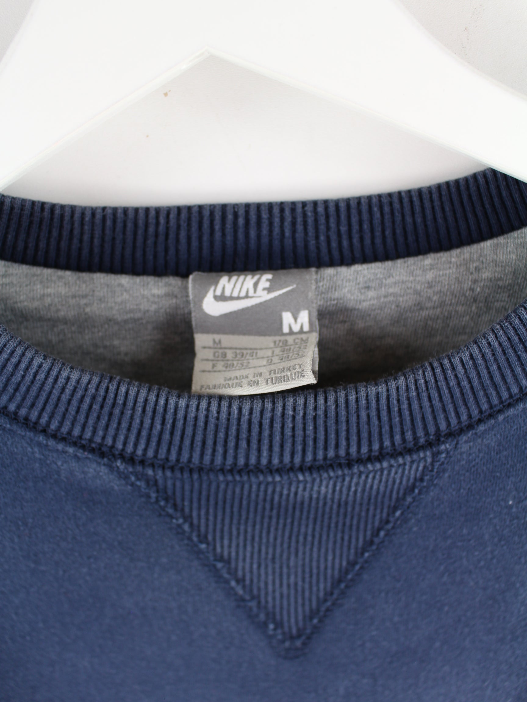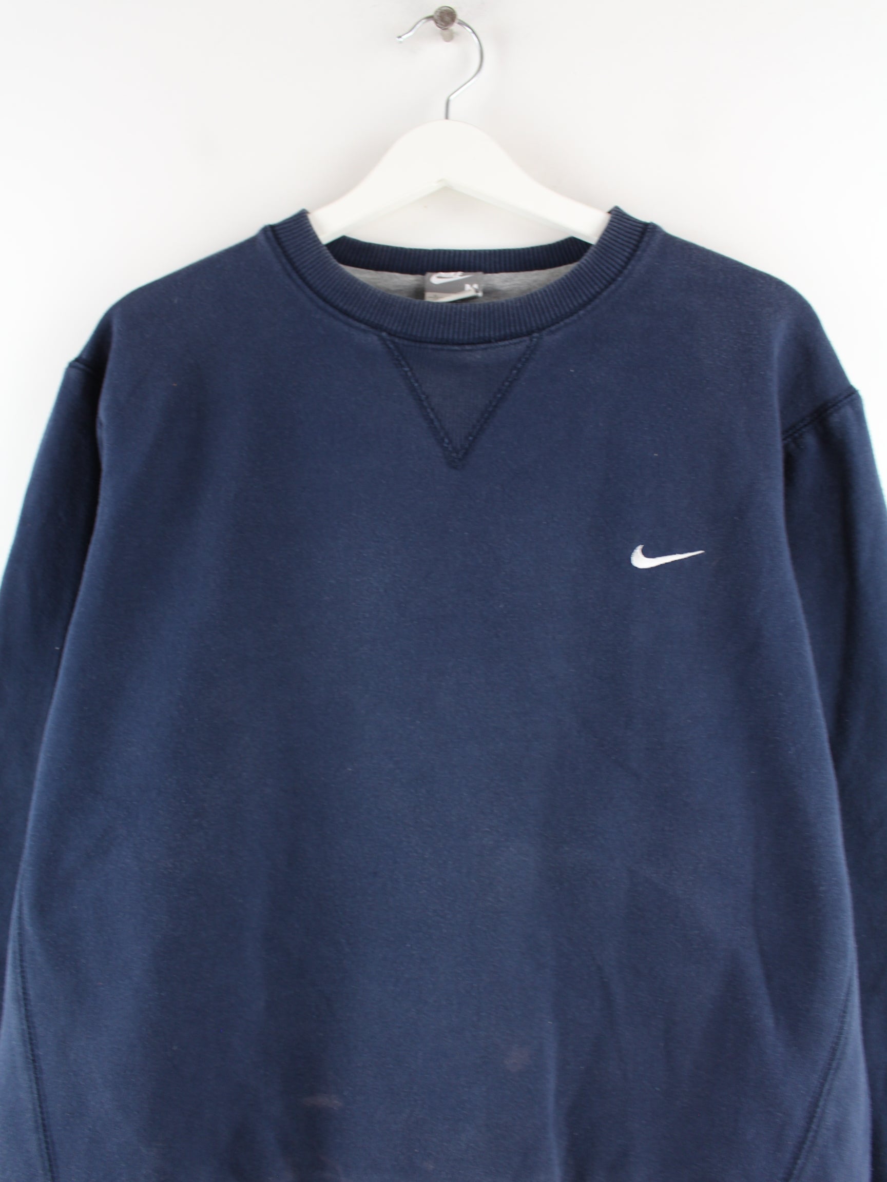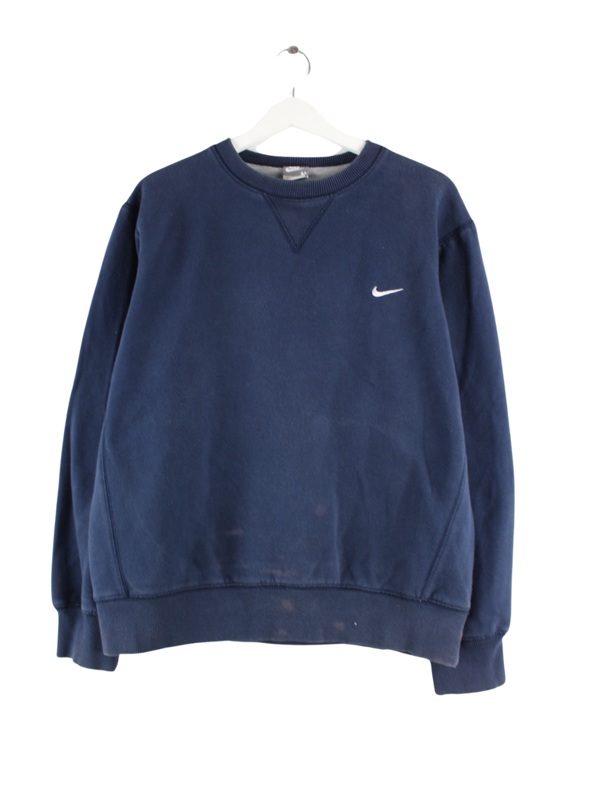 Blauer Sweater vom Brand Nike aus Anfang der 2000'er in Größe M. Er ist aus einer Baumwollmischung hergestellt und in gutem Zustand vorrätig.
