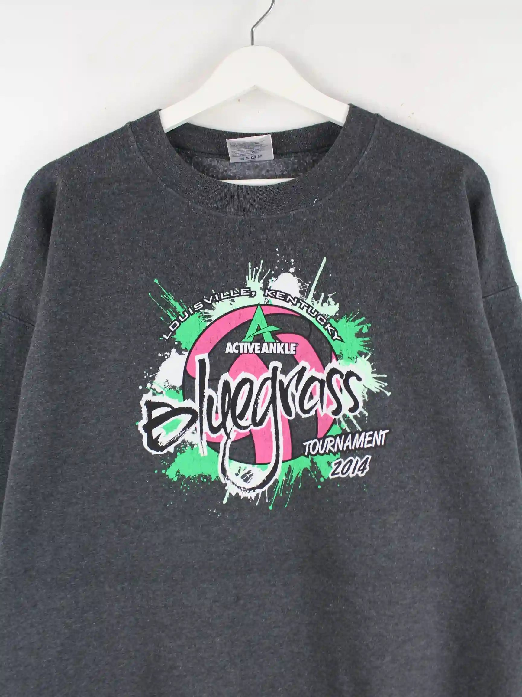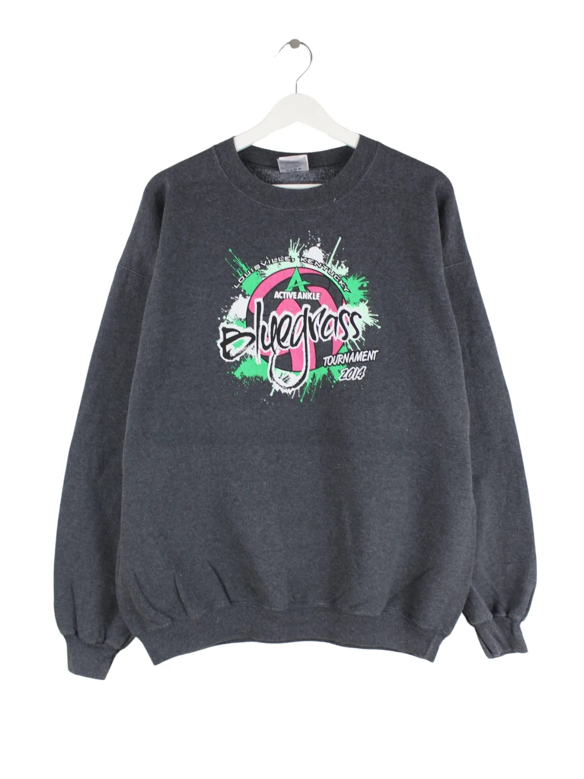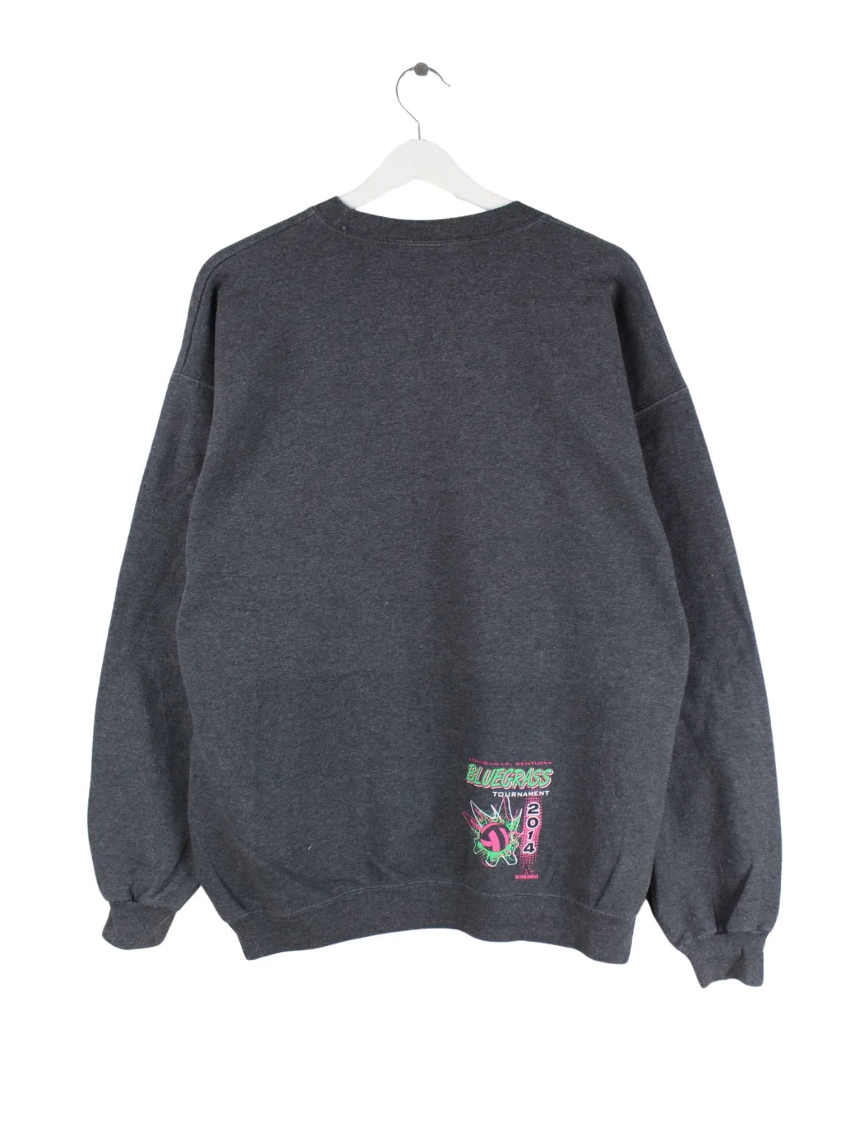 Grauer Sweater der Marke Port & Company in Größe L. Er ist aus einer Baumwollmischung gemacht und in sehr gutem Zustand auf Lager. Mit chiquem Tournament Print.