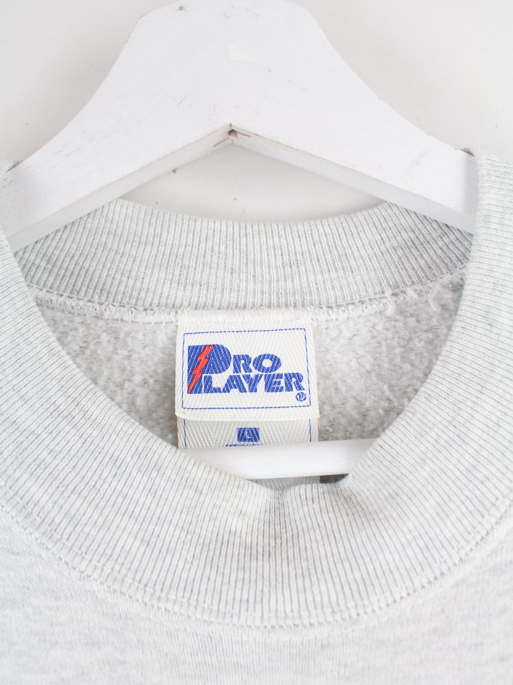 Grauer Sweater aus dem Hause Pro Player aus den 90'ern in Größe L. Er ist aus einer Baumwollmischung angefertigt und in gutem Zustand bei uns zu bekommen. Mit schönem Wildcats Print.