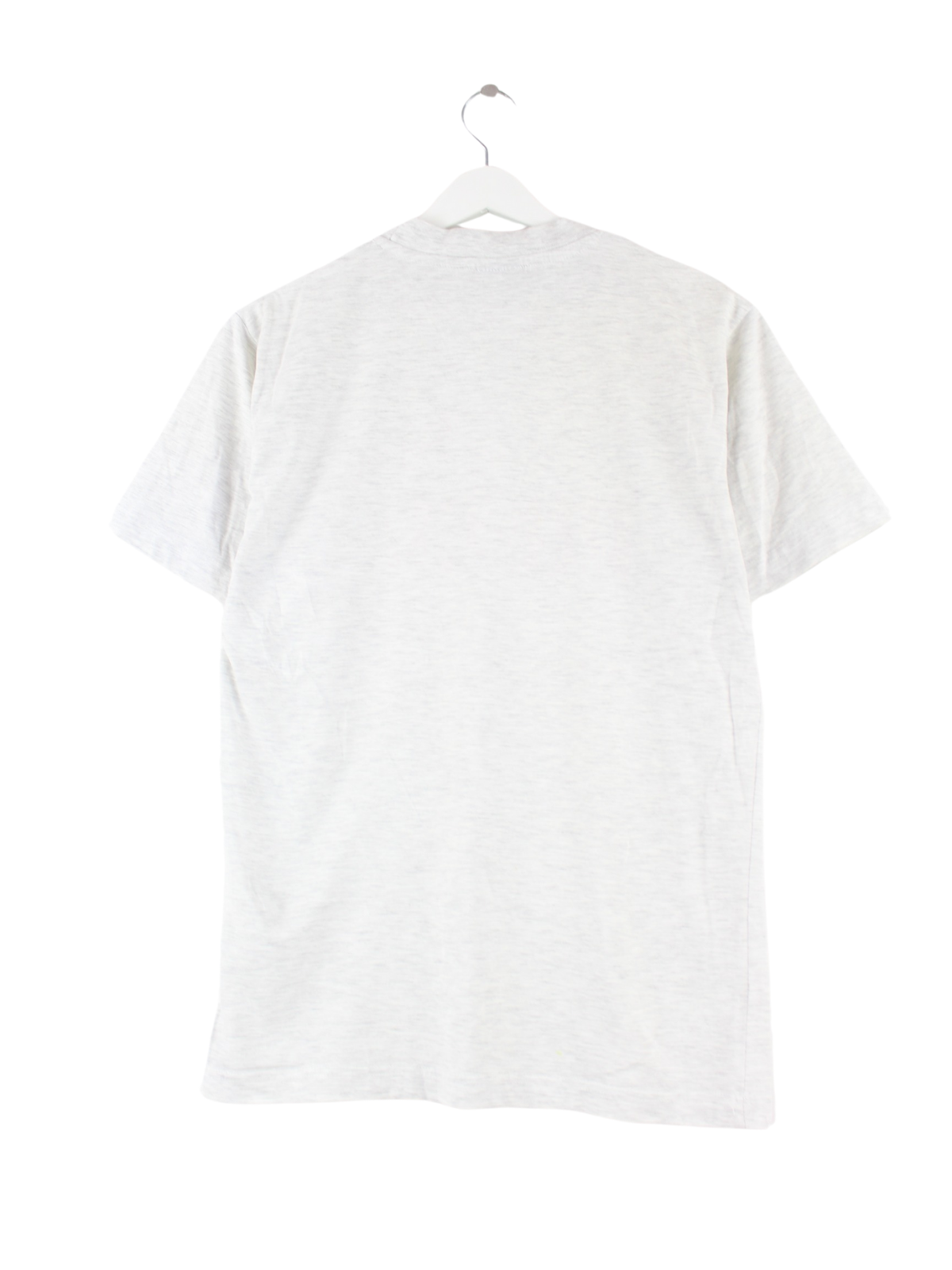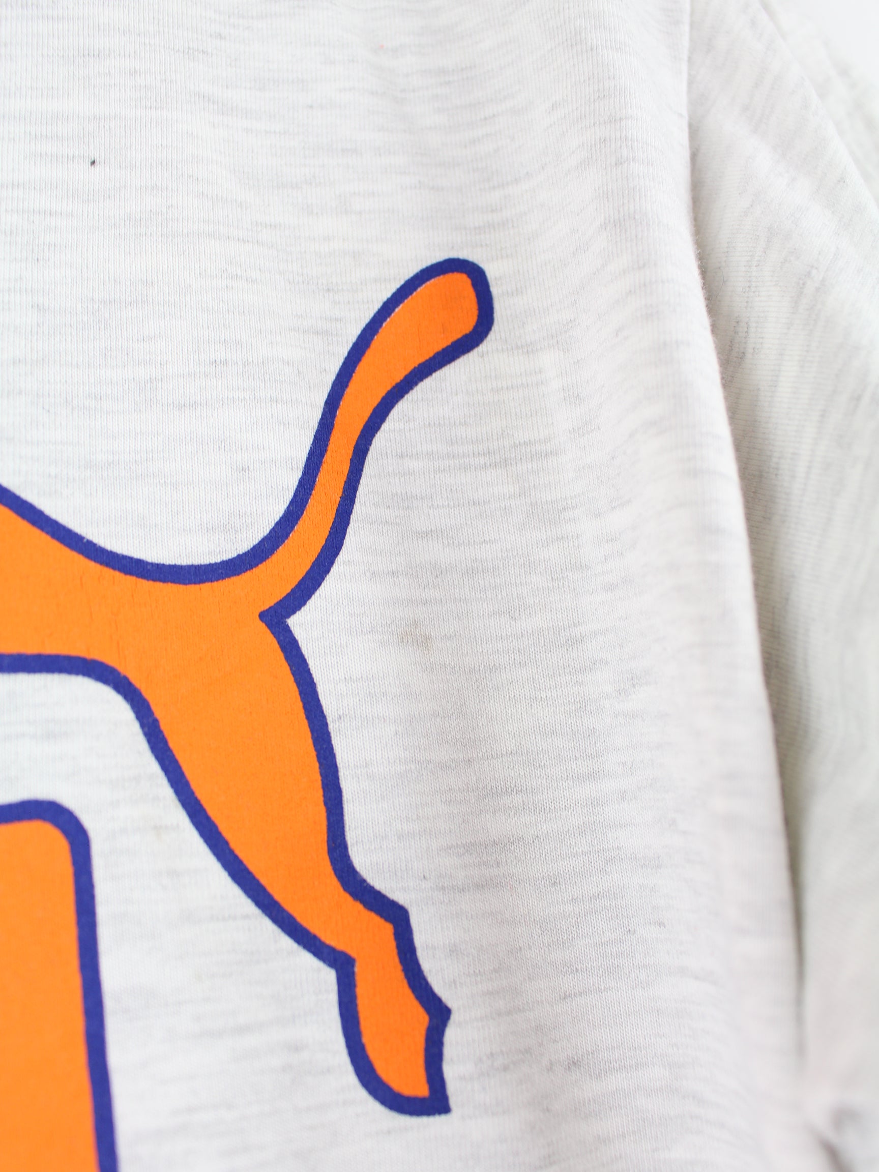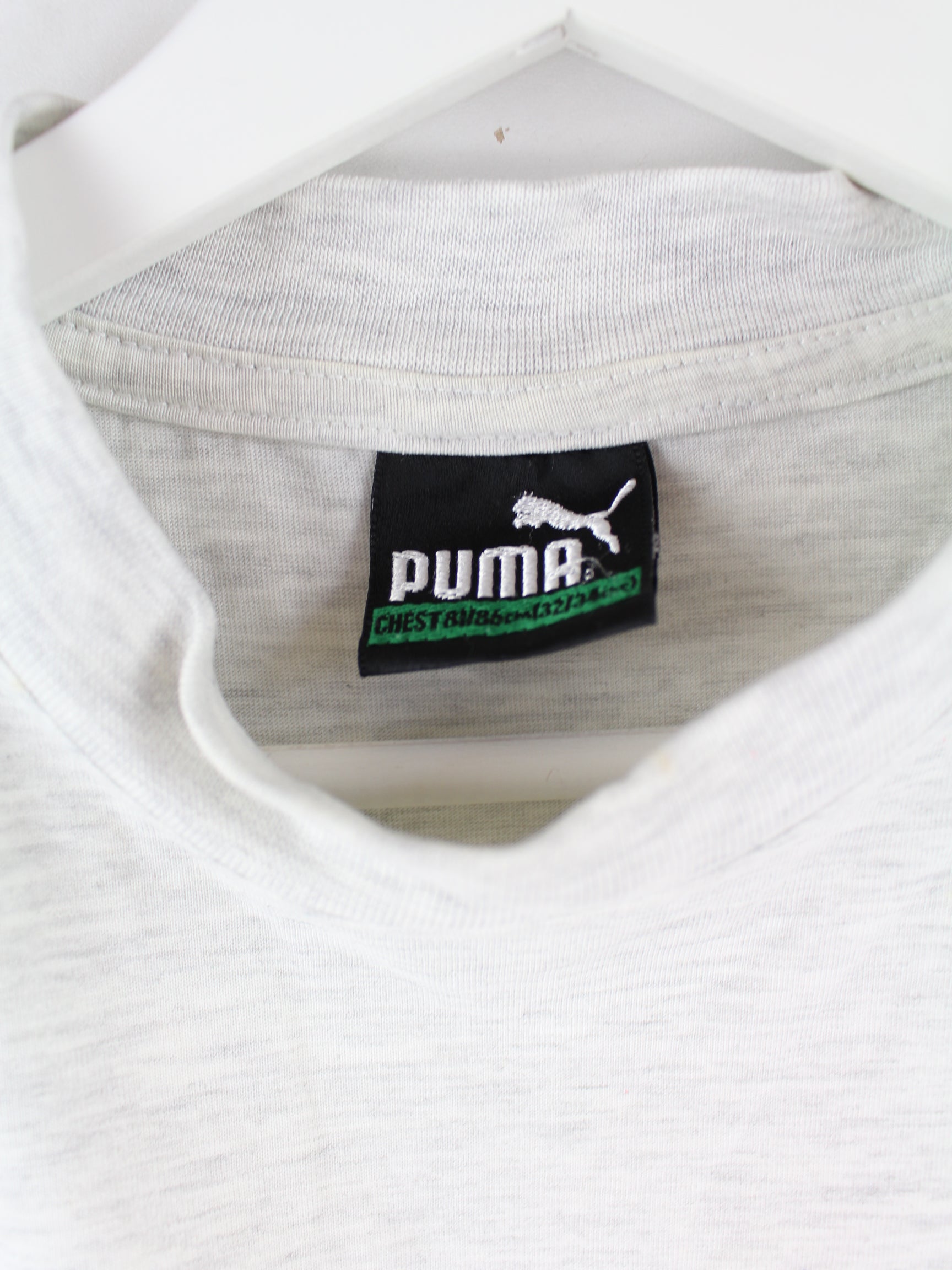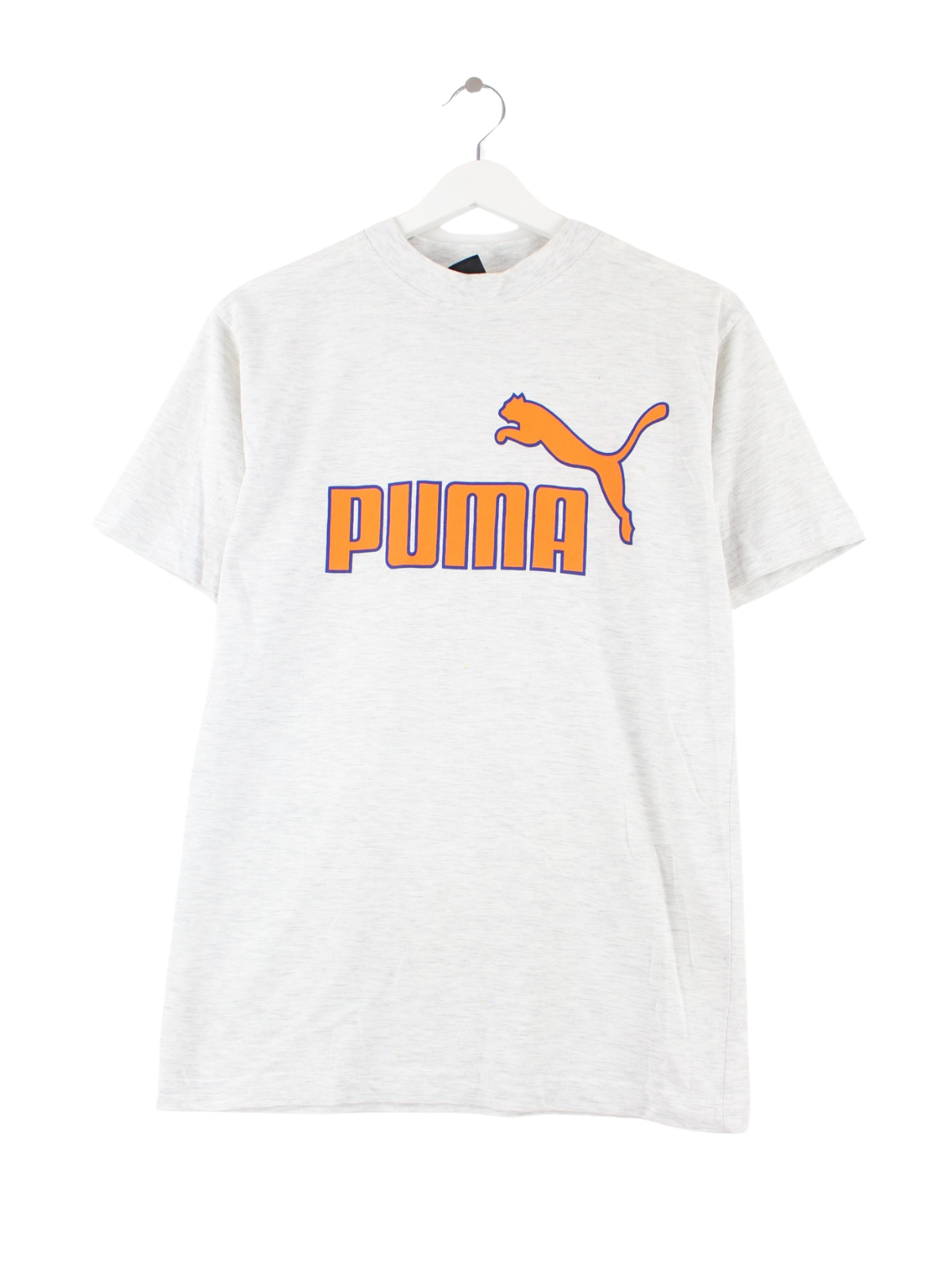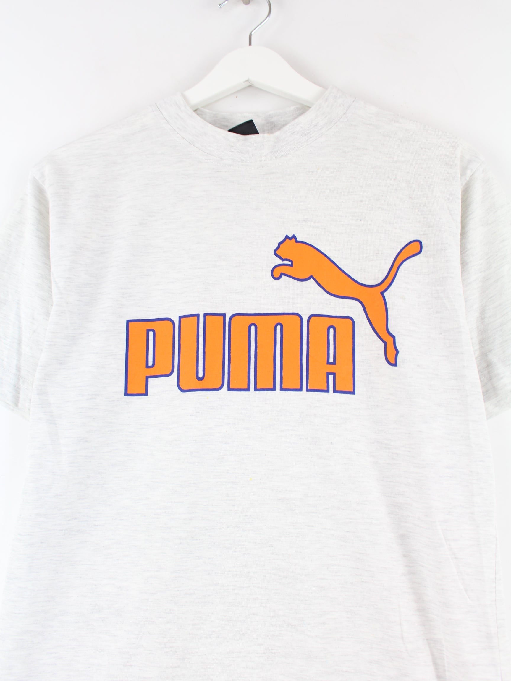 Graues T-Shirt des Labels Puma in Größe S. Es ist aus Baumwolle und in gutem Zustand in Stock. Mit tollem Vintage Print.