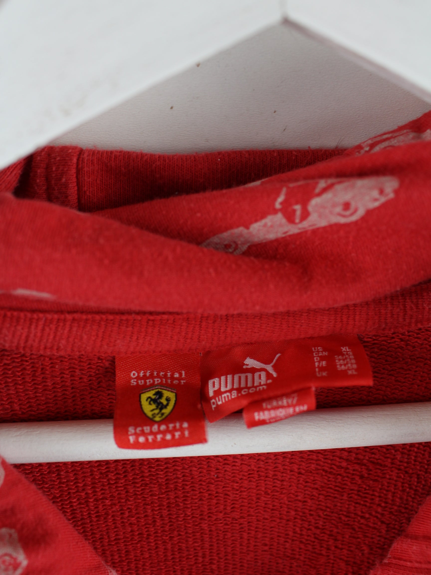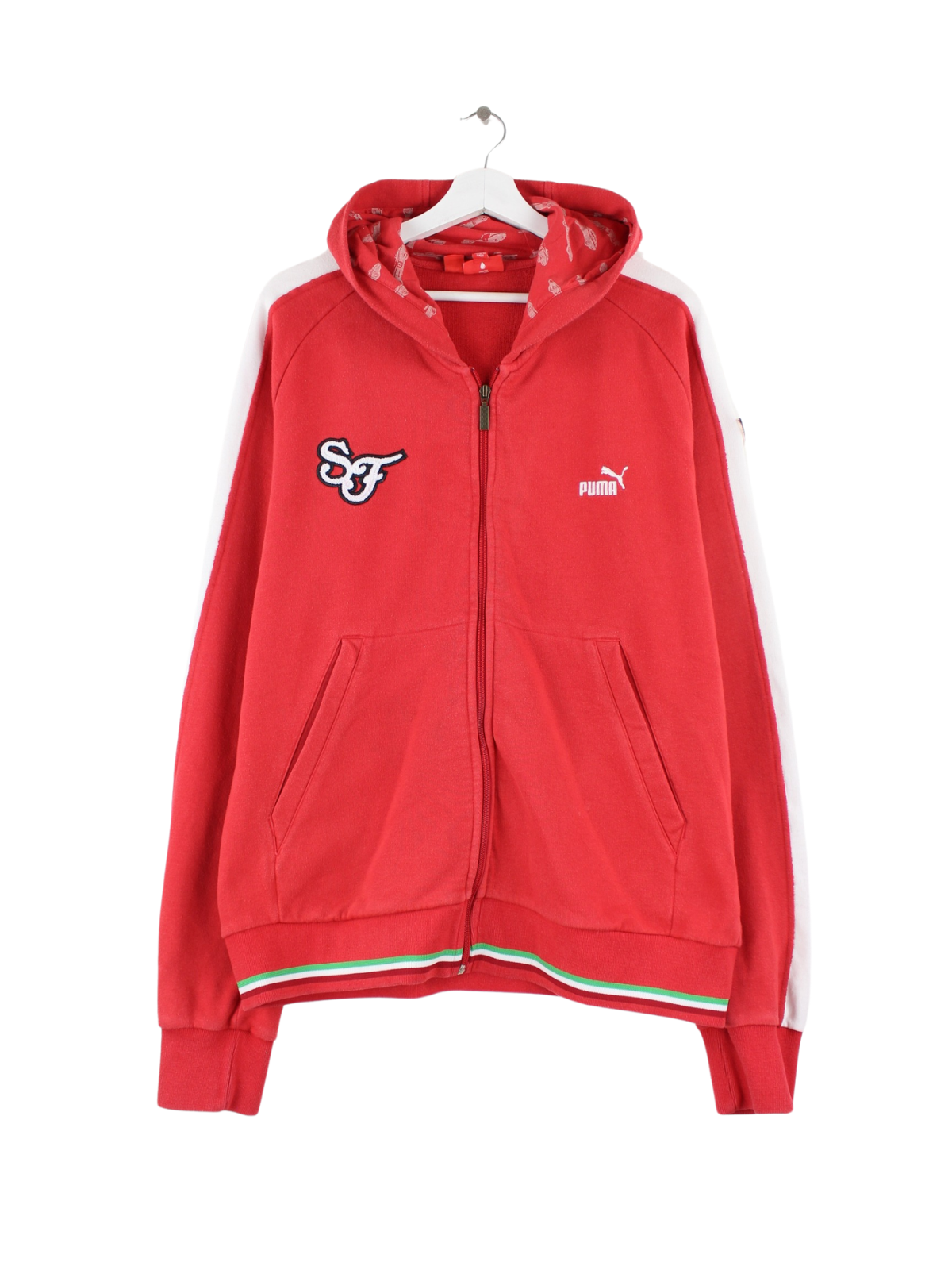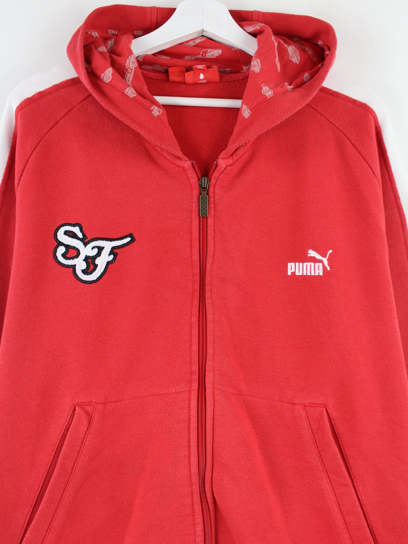 Roter Hoodie mit gestickten Motiven und Reißverschluß der Brand Puma in Größe XL. Er ist aus einer Baumwollmischung gefertigt und in gutem Zustand bei uns vorrätig.