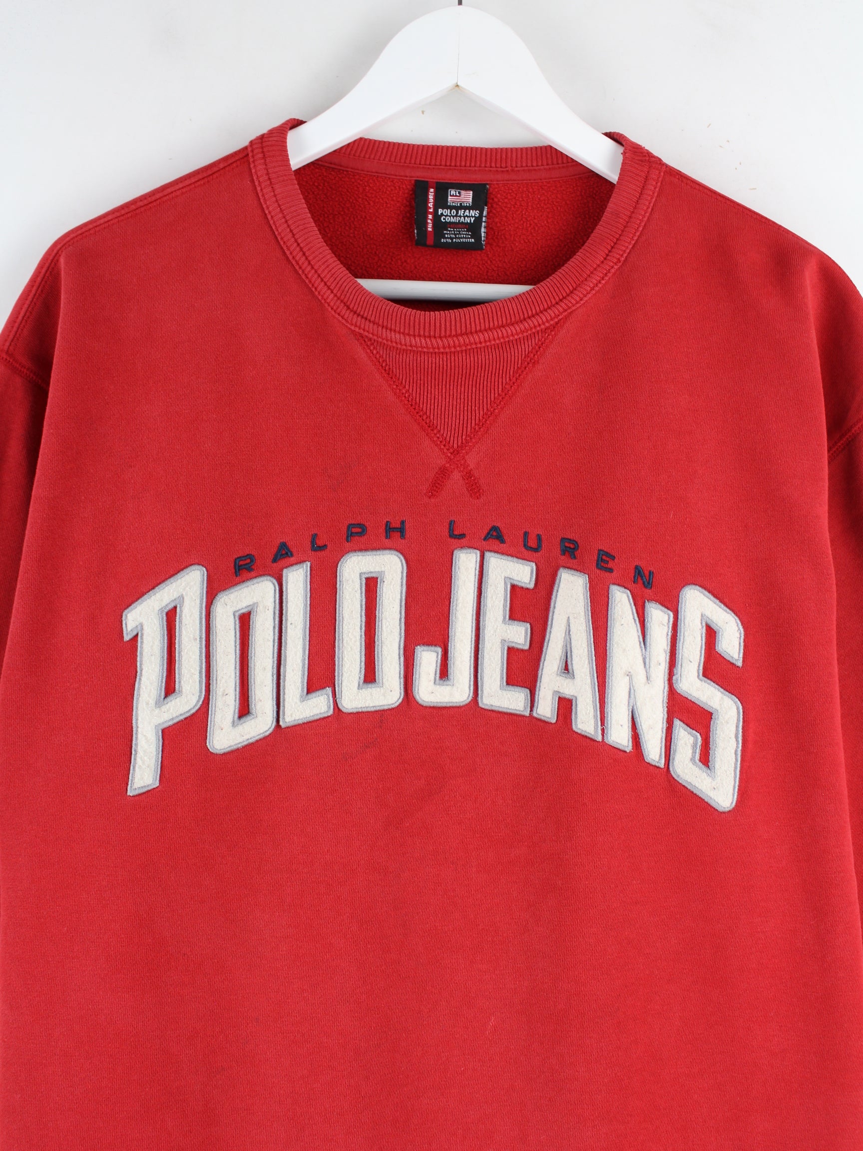 Roter Sweater mit Stickereien von Ralph Lauren in Größe L. Er ist aus einer Baumwollmischung produziert. Den Zustand würden wir als 'In Ordnung' bezeichnen (vergl. Bilder).