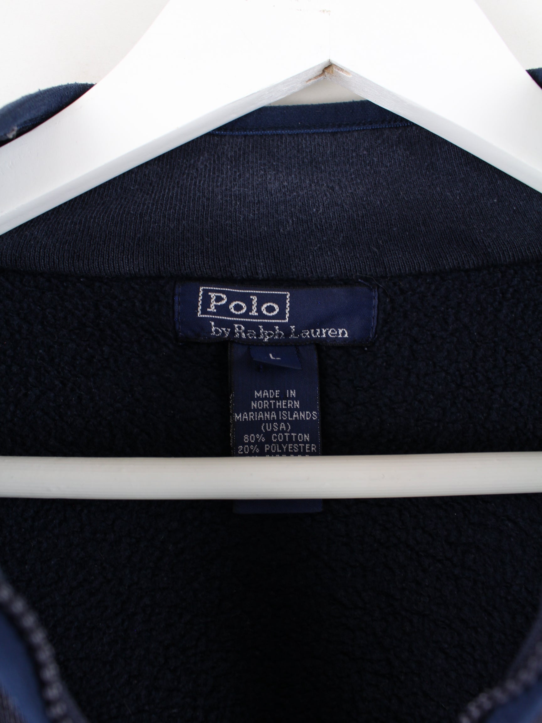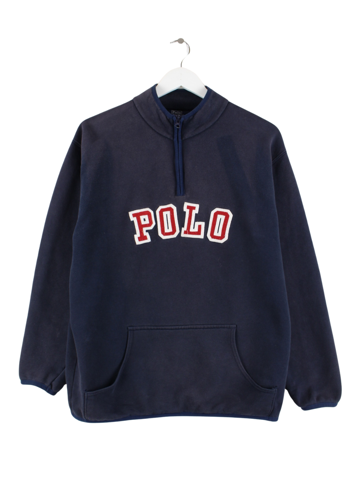 Sweater vom Label Ralph Lauren mit gesticktem Logo und kurzem Reißverschluß in Größe S aus den 90'ern. Er ist aus einer Baumwollmischung gemacht und in Blau auf Lager.