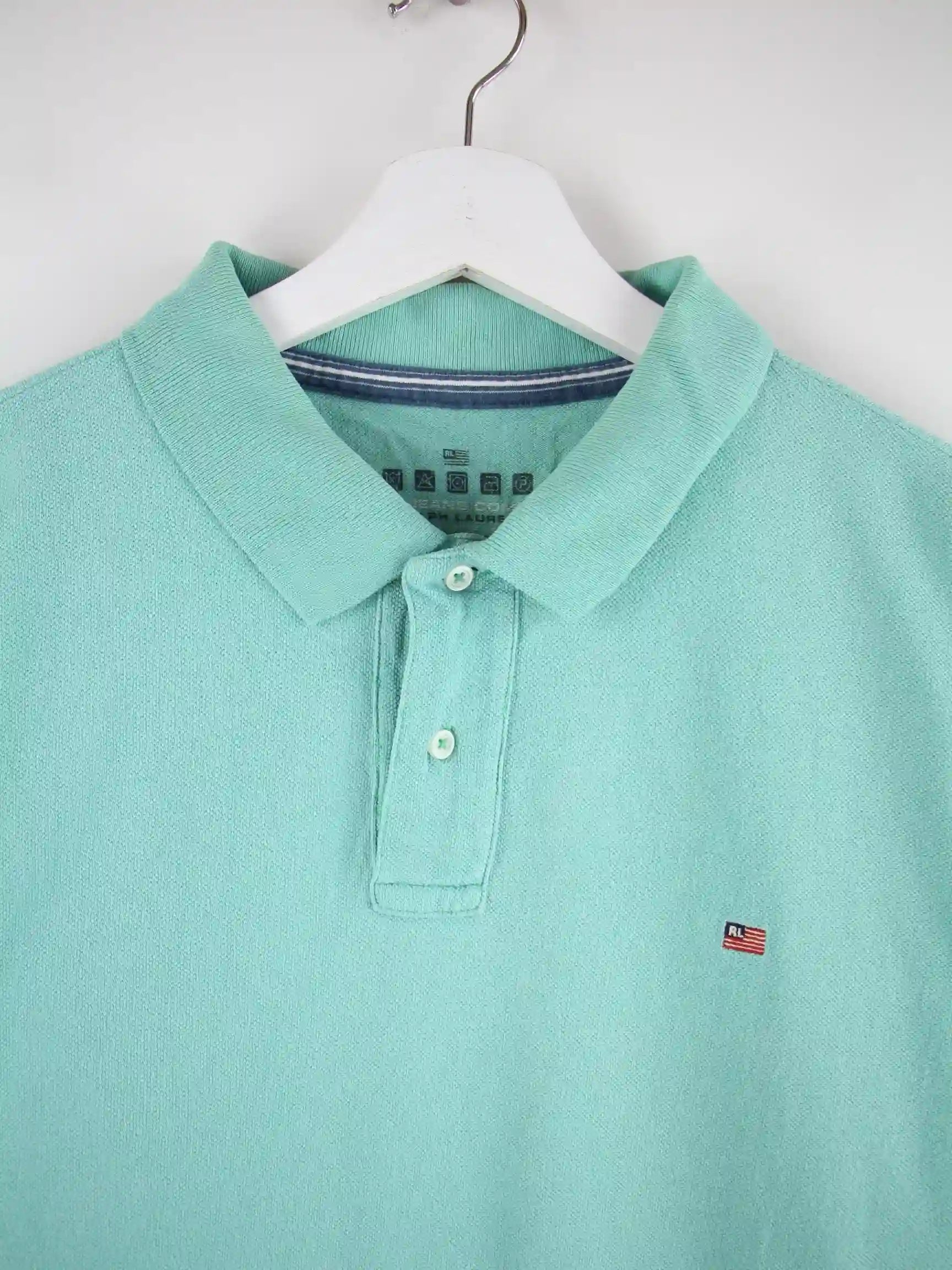 Poloshirt der Marke Ralph Lauren in Größe XL. Es ist aus Baumwolle produziert und in Türkis bei uns vorrätig.