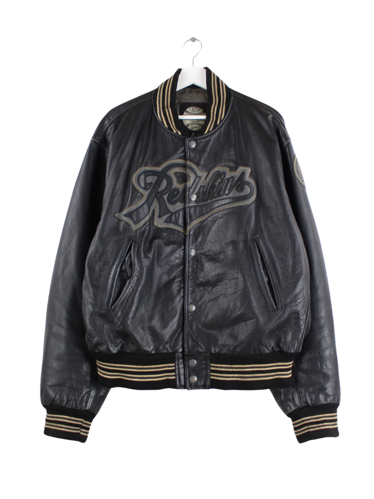 Schwarze Jacke mit Stick der Marke Redskins aus den 90'ern in Größe XXL. Sie ist aus Leder produziert und in sehr gutem Zustand bei uns vorrätig.