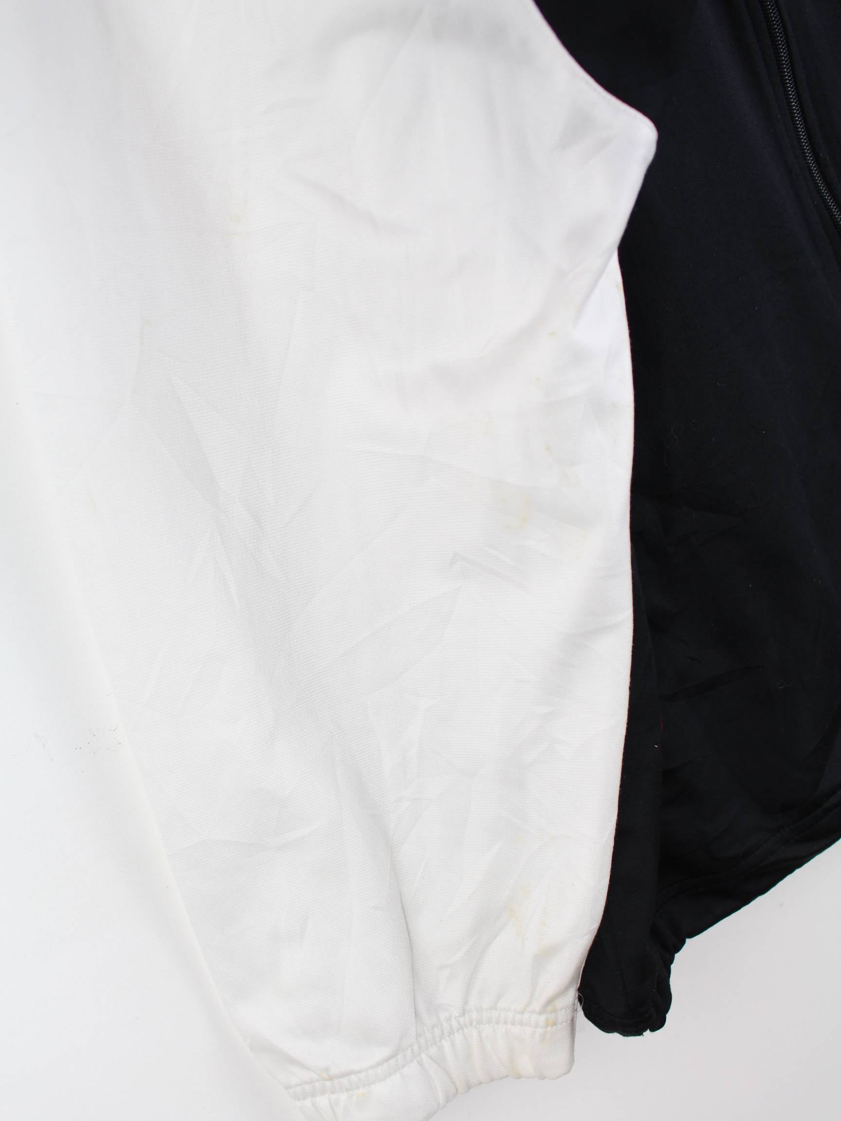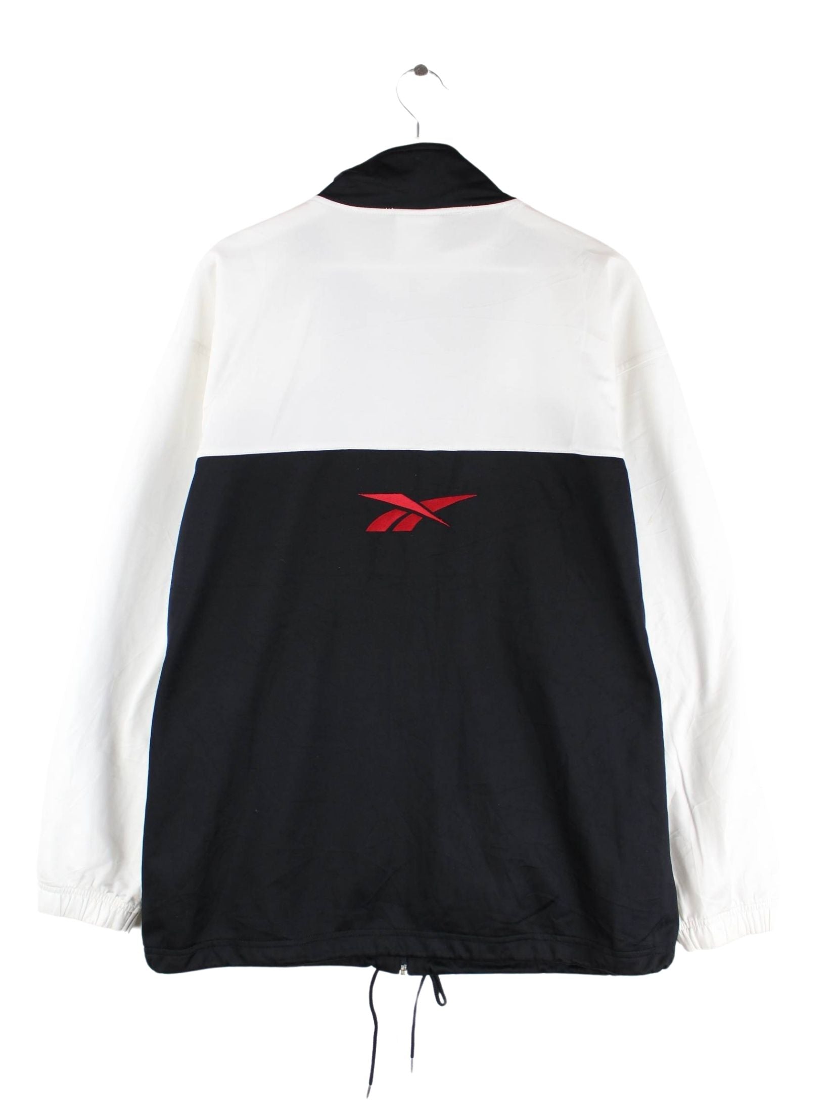 Schwarze Trainingsjacke mit gestickten Motiven aus dem Hause Reebok in Größe XL. Sie ist aus Synthetik . Den Zustand würden wir als 'In Ordnung' bezeichnen (vergl. Bilder).