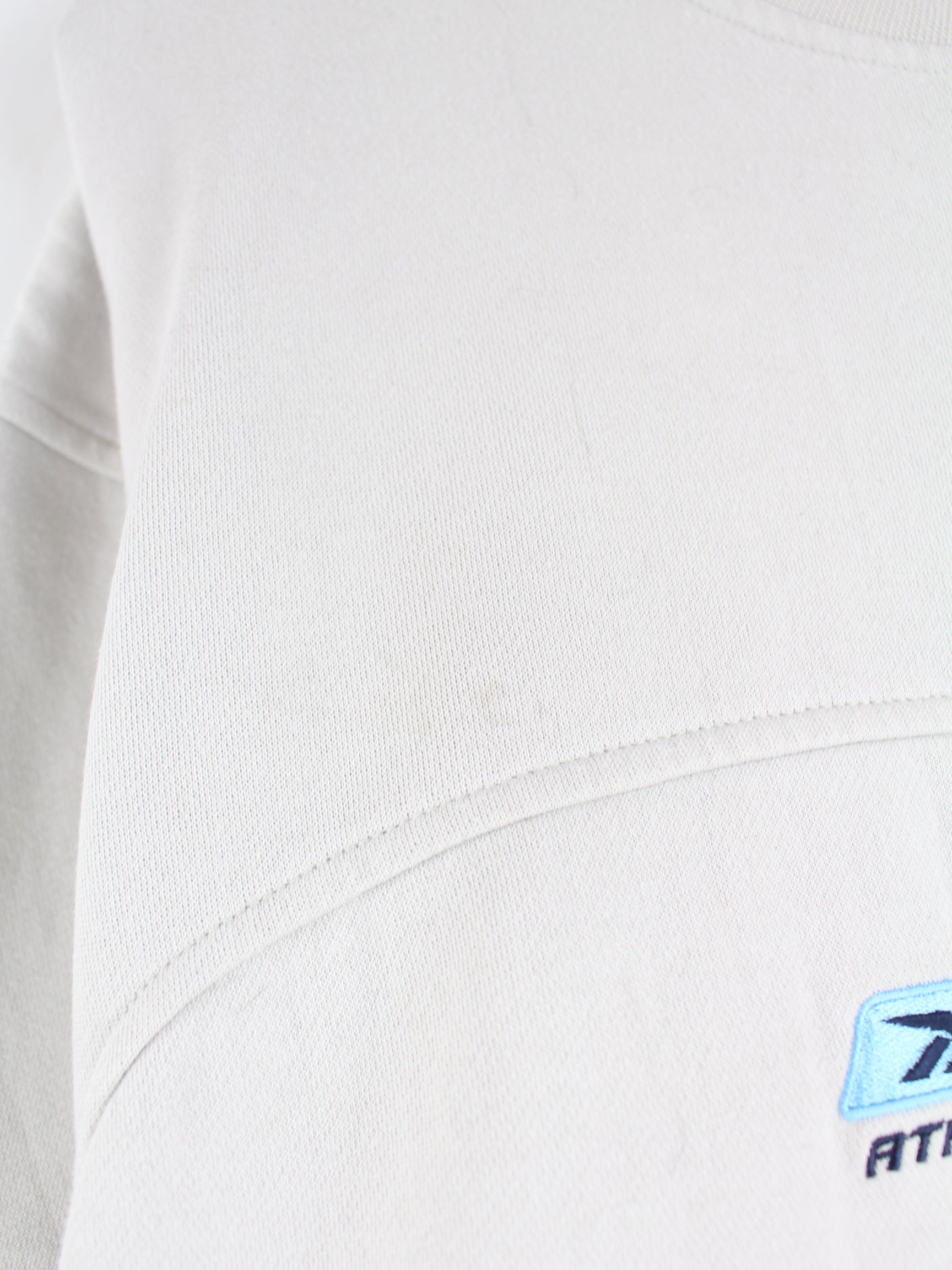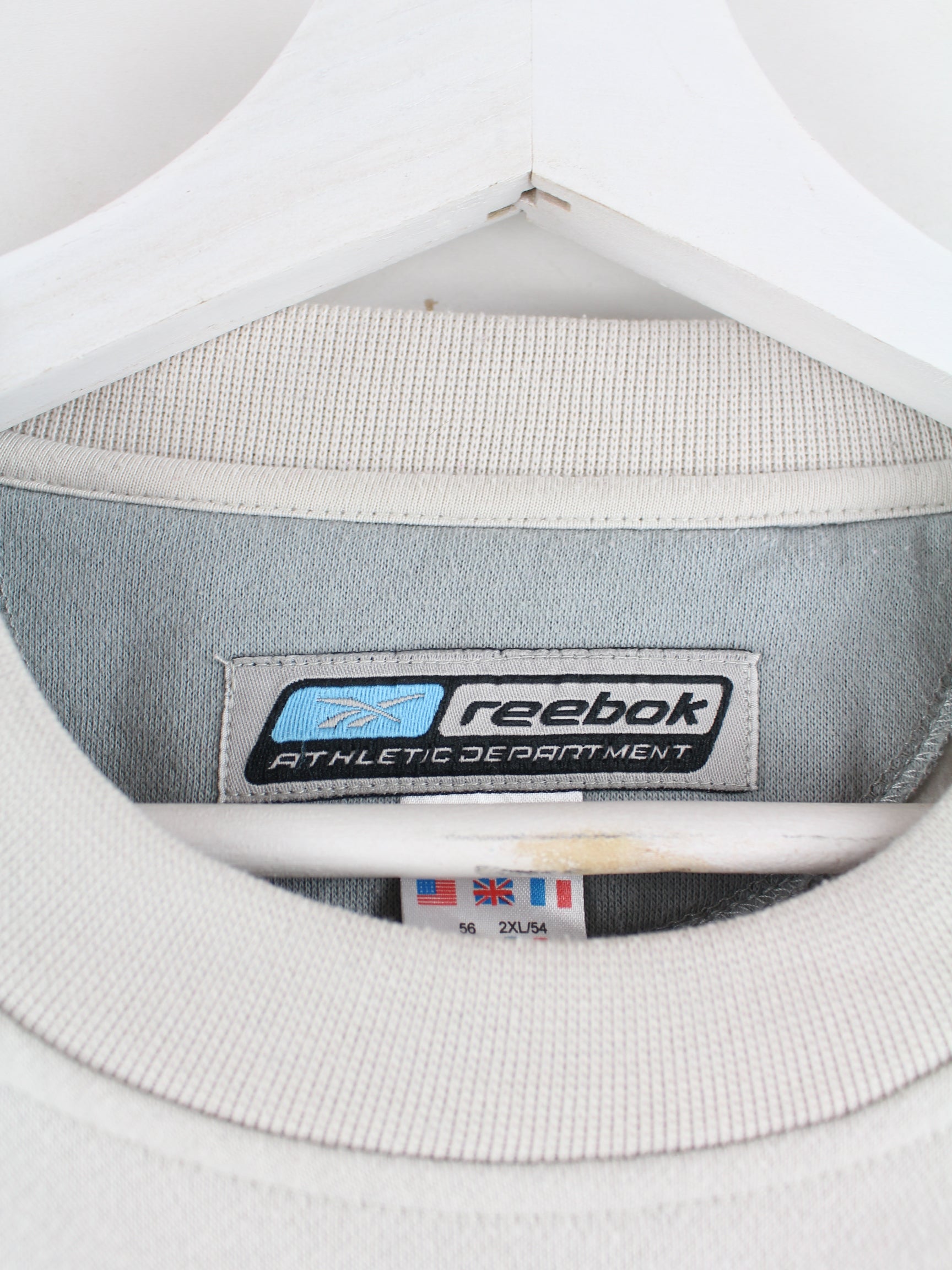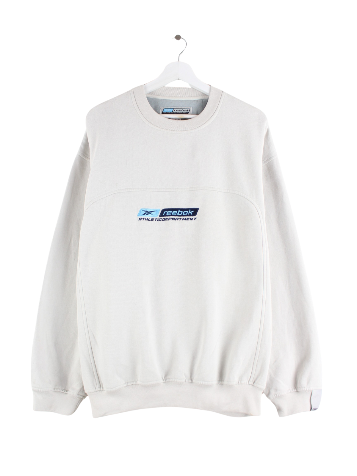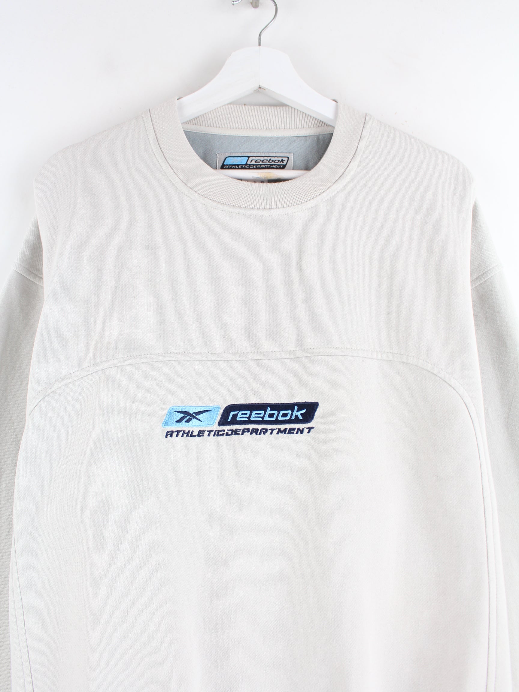 Sweater aus dem Hause Reebok mit Stick in Größe XL aus den 90'ern. Er ist aus einer Baumwollmischung gefertigt und in Beige im Bestand.