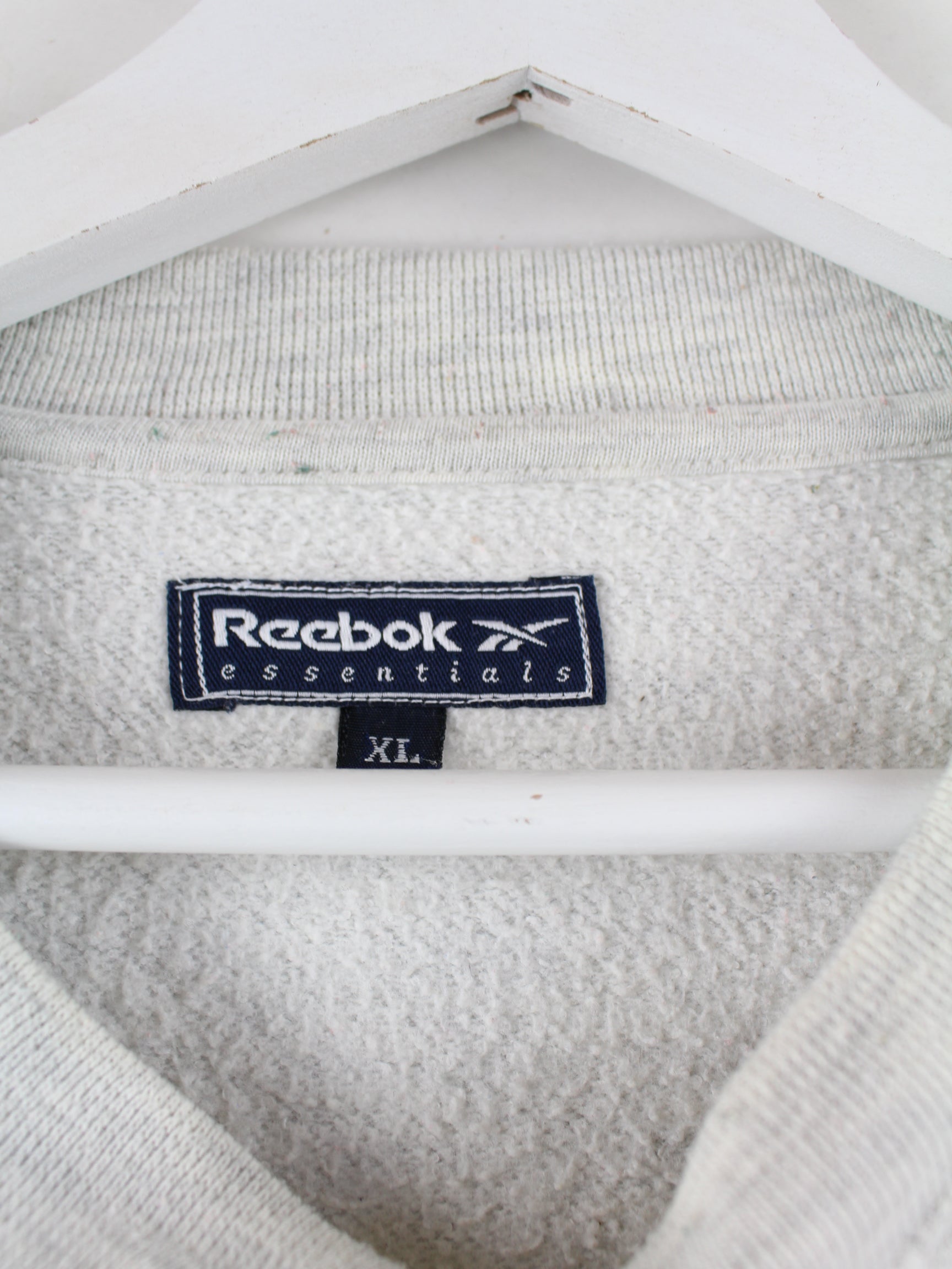 Sweater der Marke Reebok mit Stickereien in Größe XL aus den 90'ern. Er ist aus einer Baumwollmischung hergestellt und in Grau zu haben.
