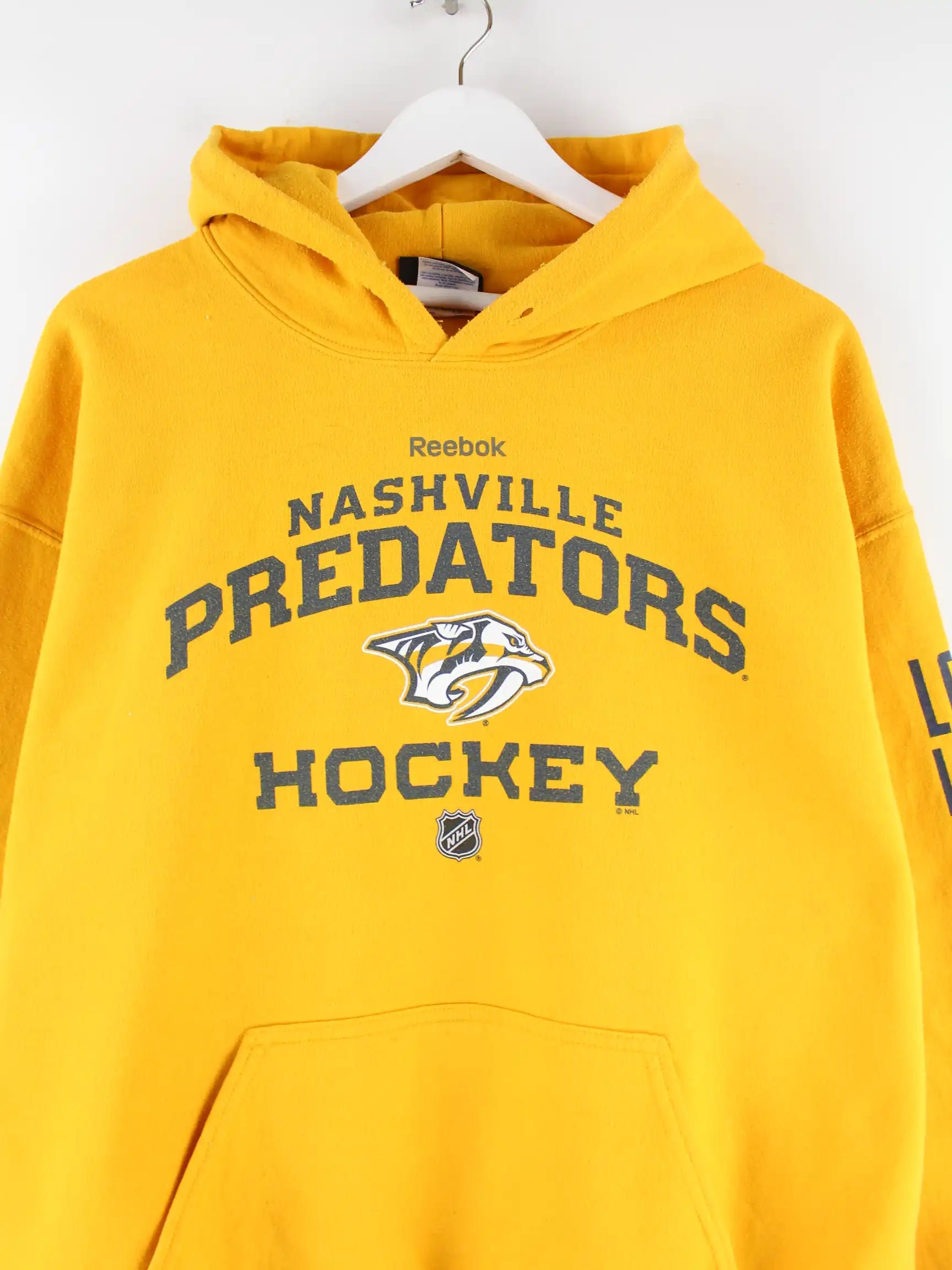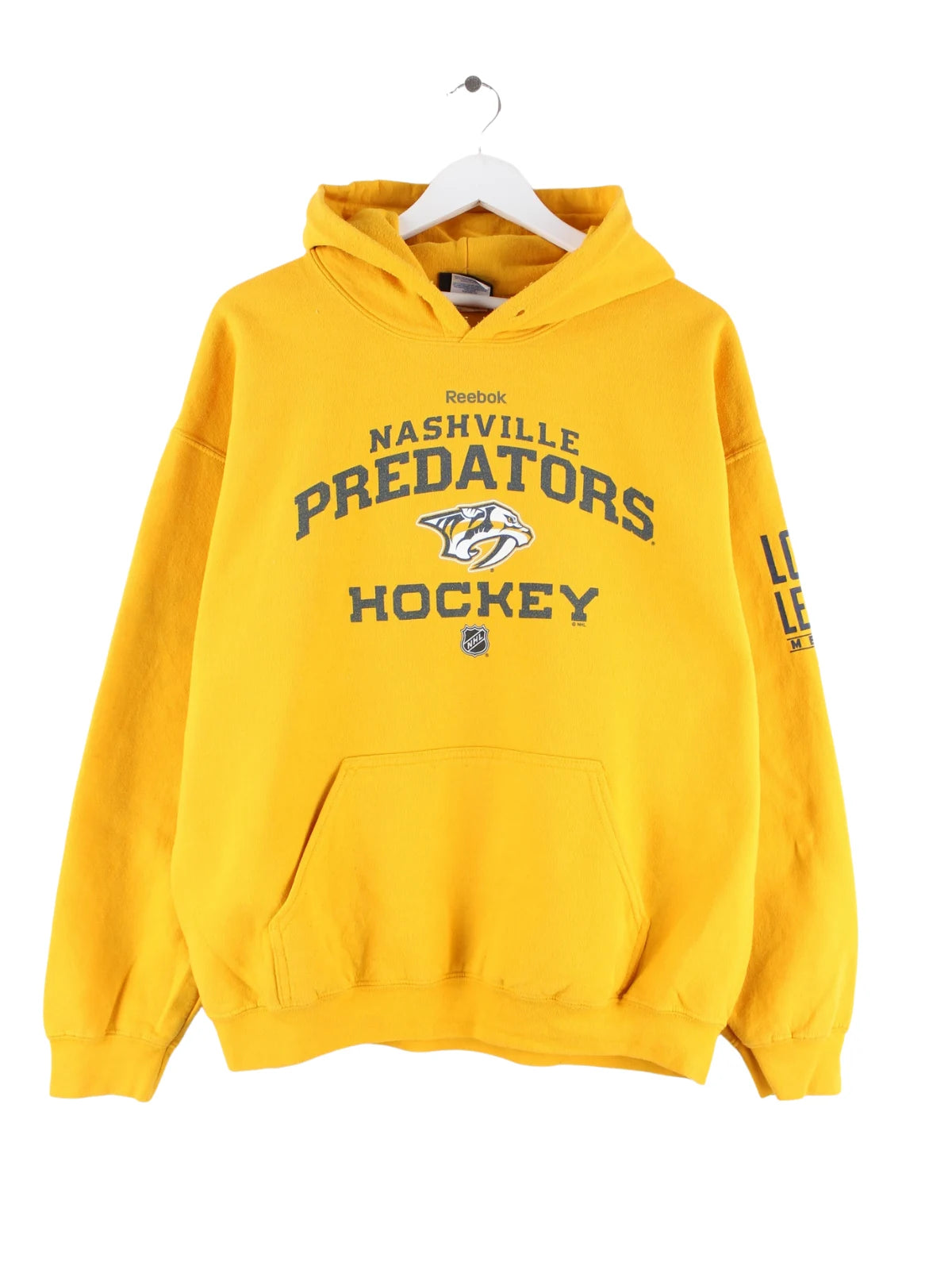 Gelber Hoodie vom Brand Reebok in Größe L. Er ist aus einer Baumwollmischung und in gutem Zustand in Stock. Mit tollem Predators Print.