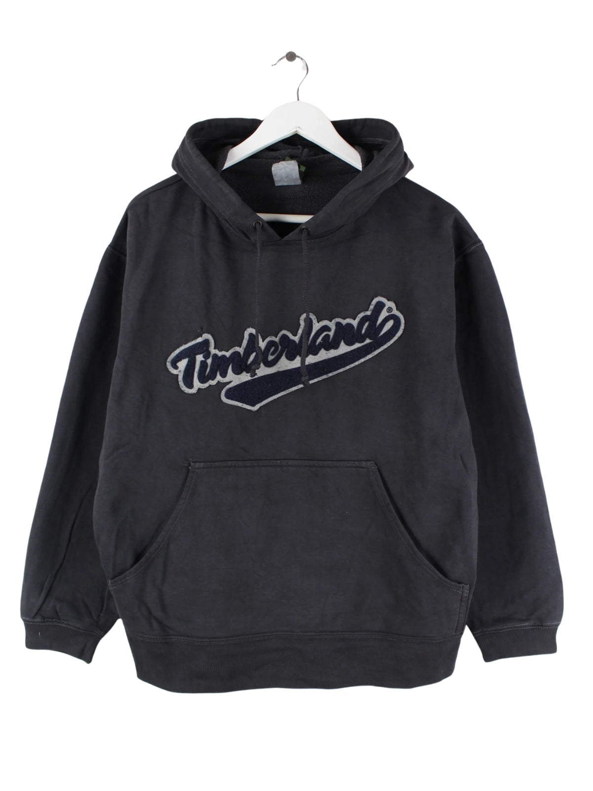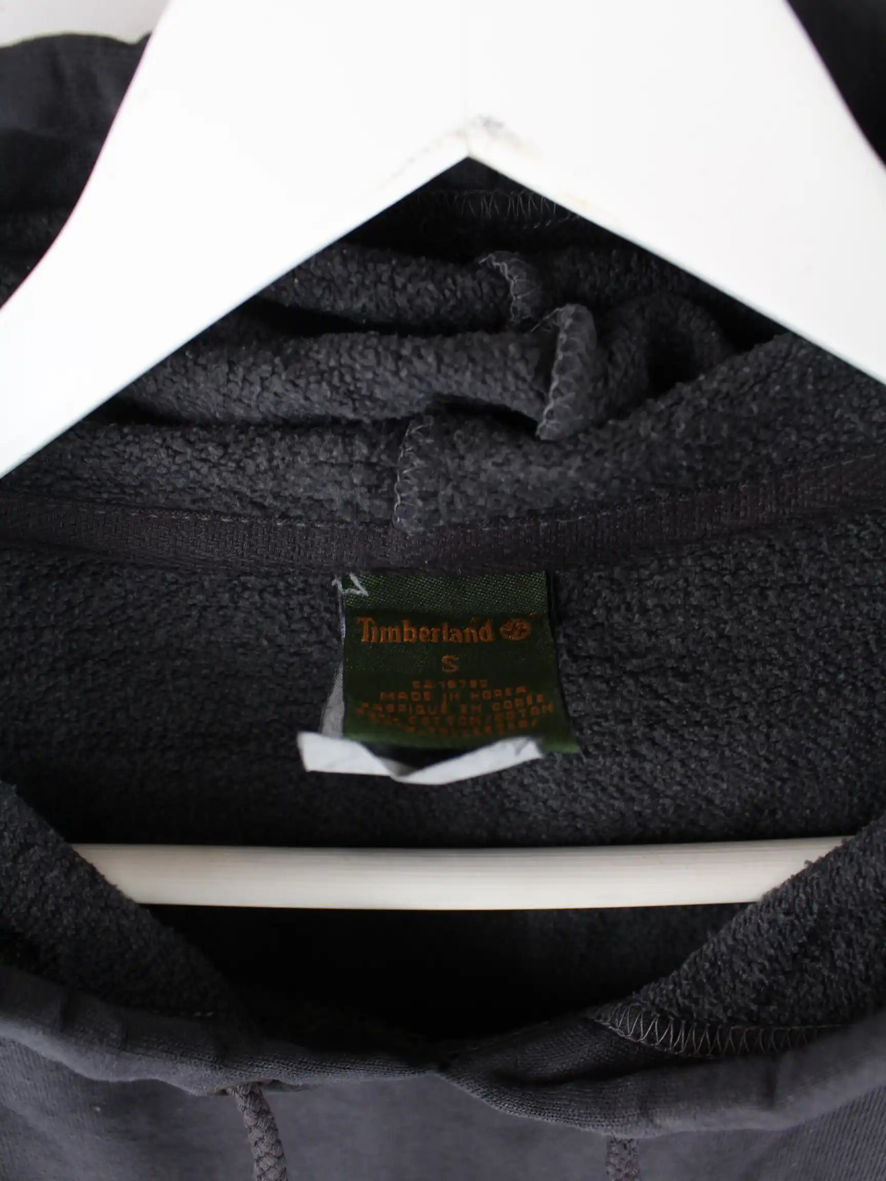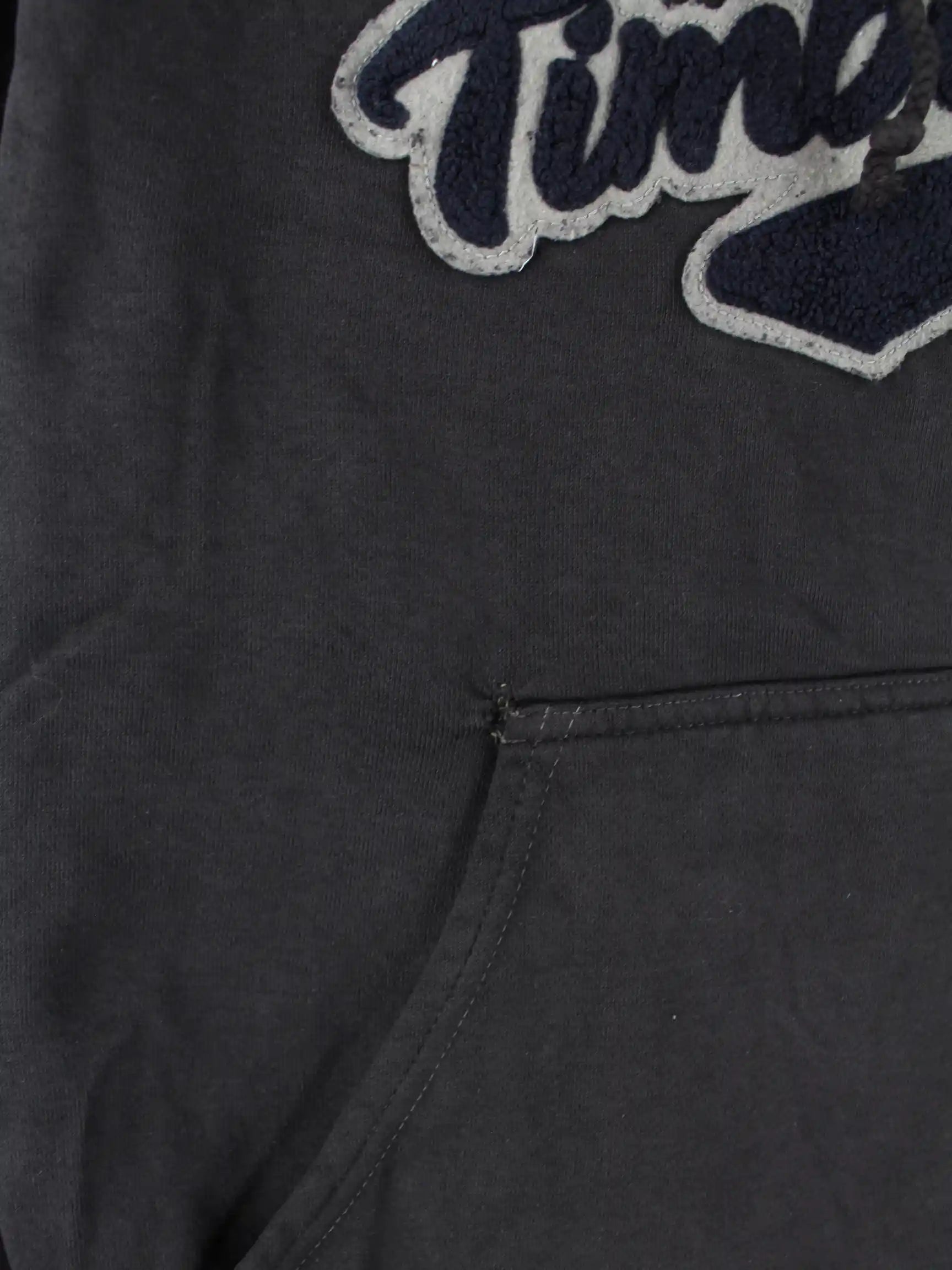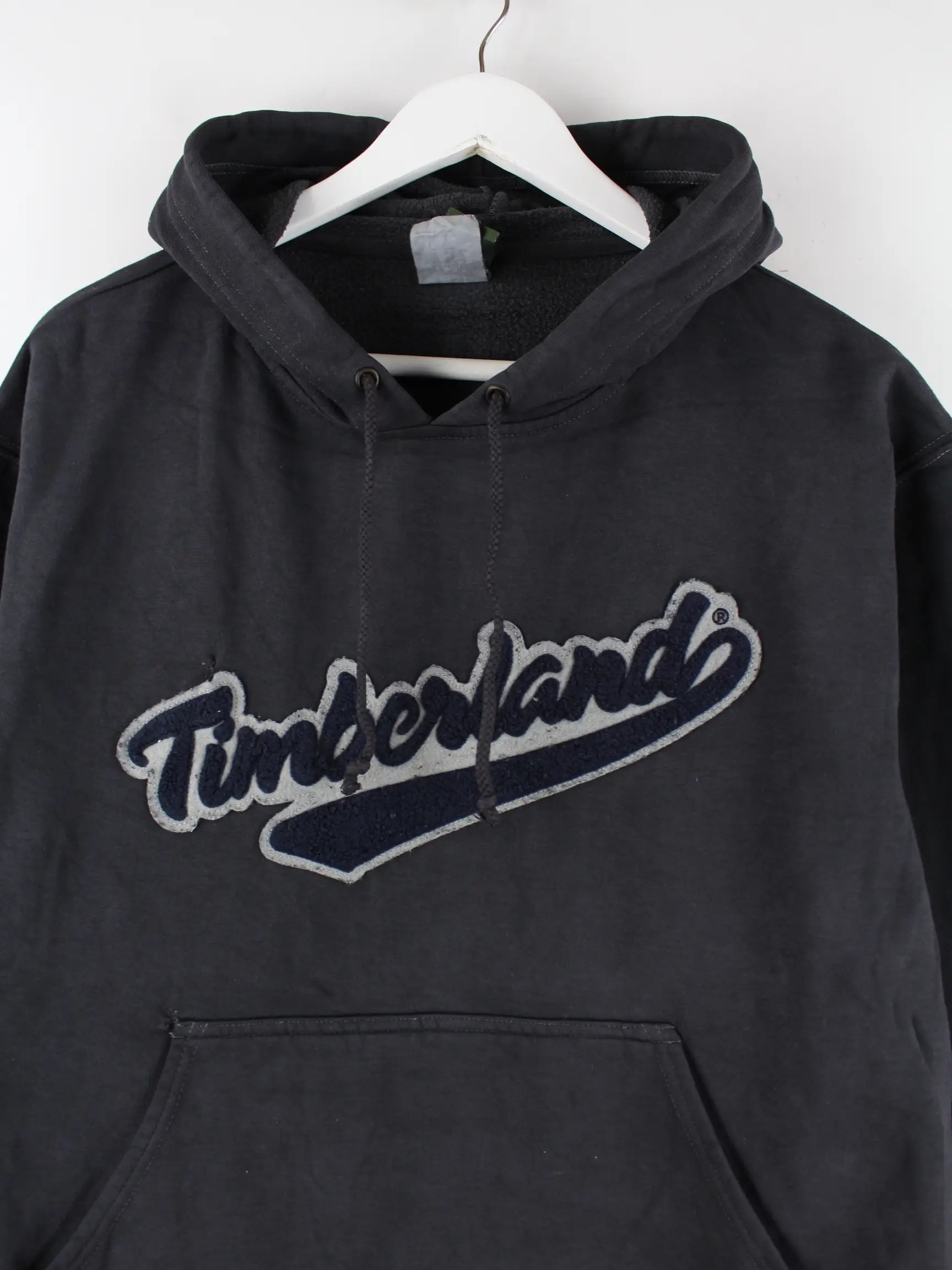 Grauer Hoodie mit Stickereien der Marke Timberland in Größe S. Er ist aus einer Baumwollmischung angefertigt und in gutem Zustand zu haben.