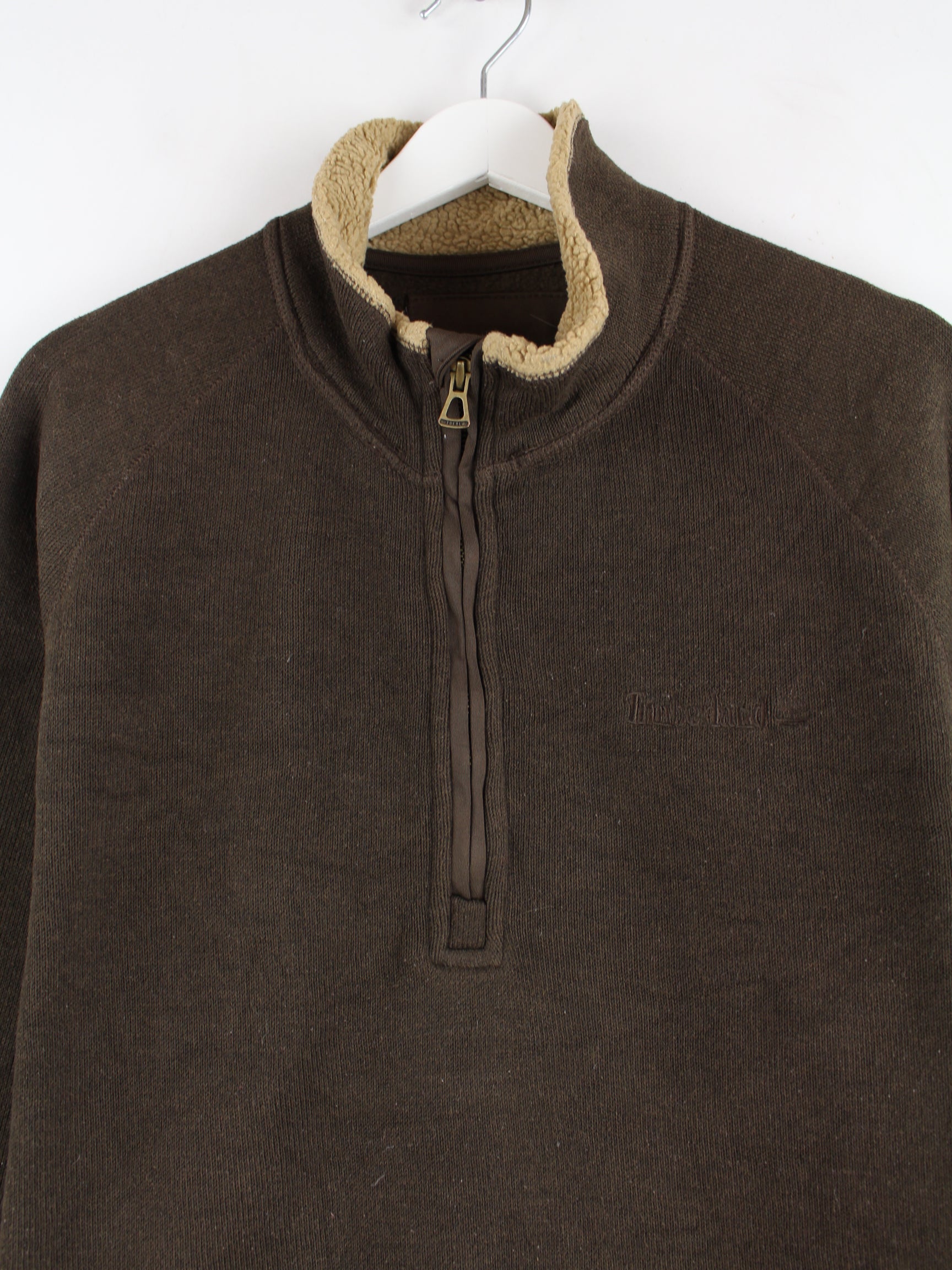 Pullover der Marke Timberland mit kurzem Reißverschluß in Größe L. Er ist aus Baumwolle angefertigt und in Braun bei uns zu bekommen.
