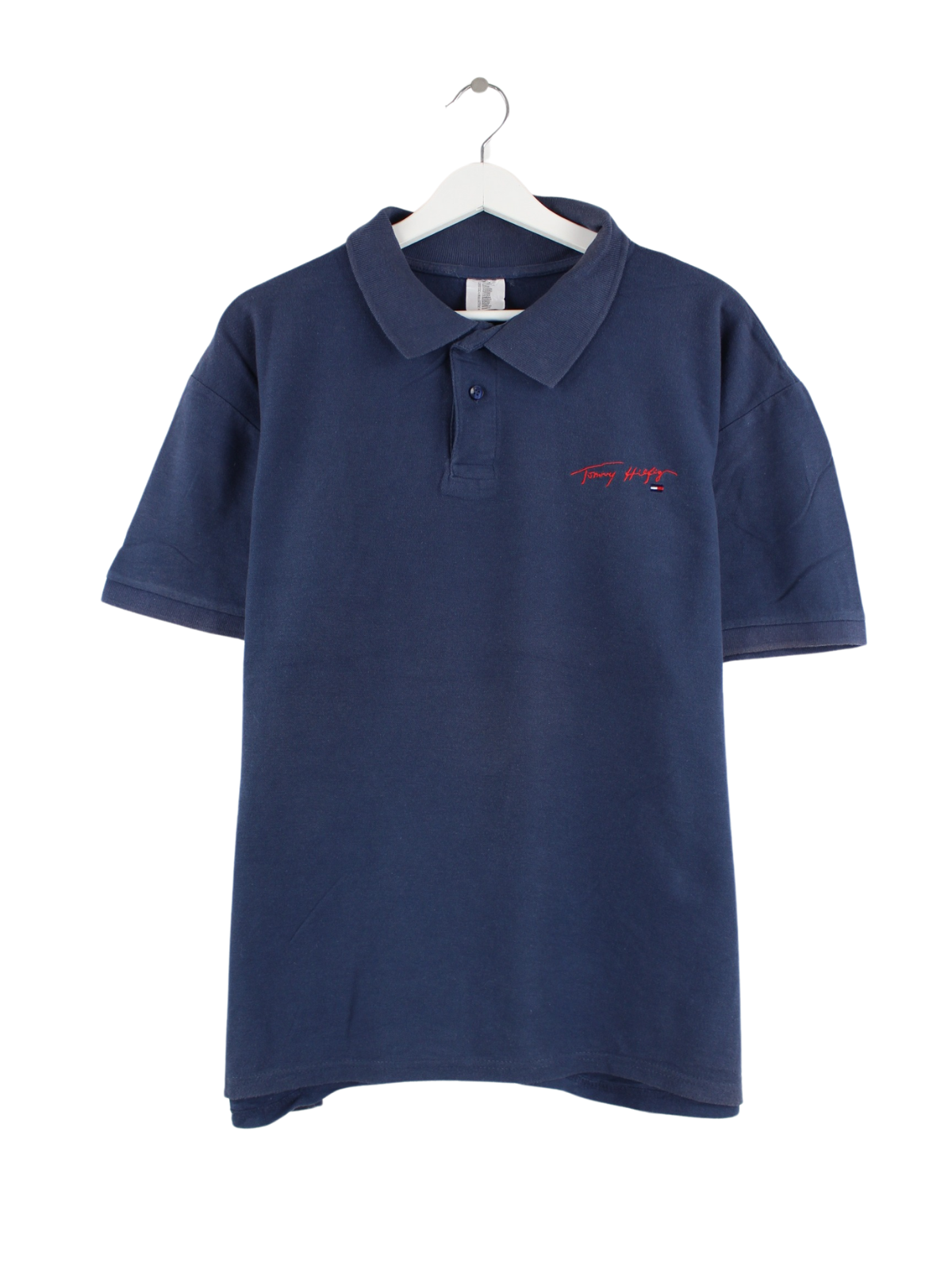 Blaues Poloshirt mit gestickten Motiven des Labels Tommy Hilfiger in Größe S. Es ist aus Baumwolle und in sehr gutem Zustand im Angebot.