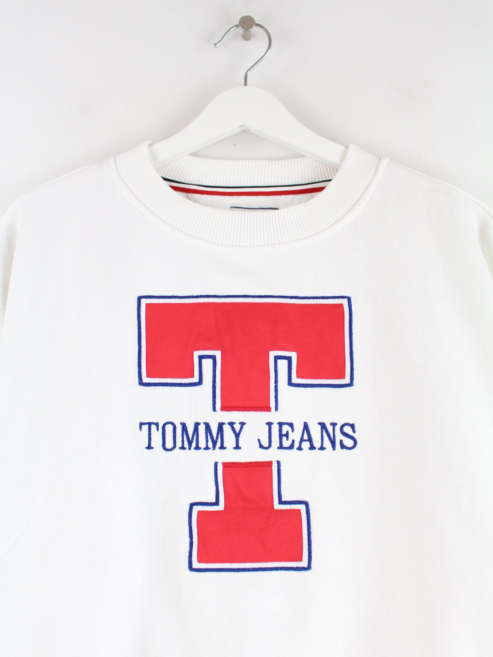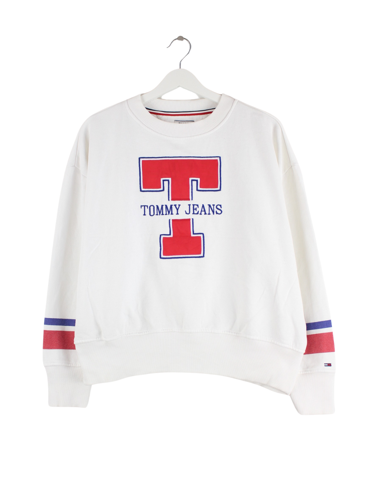 Sweater vom Brand Tommy Hilfiger mit gestickten Motiven in Größe M. Er ist aus einer Baumwollmischung gemacht und in Weiß in Stock.
