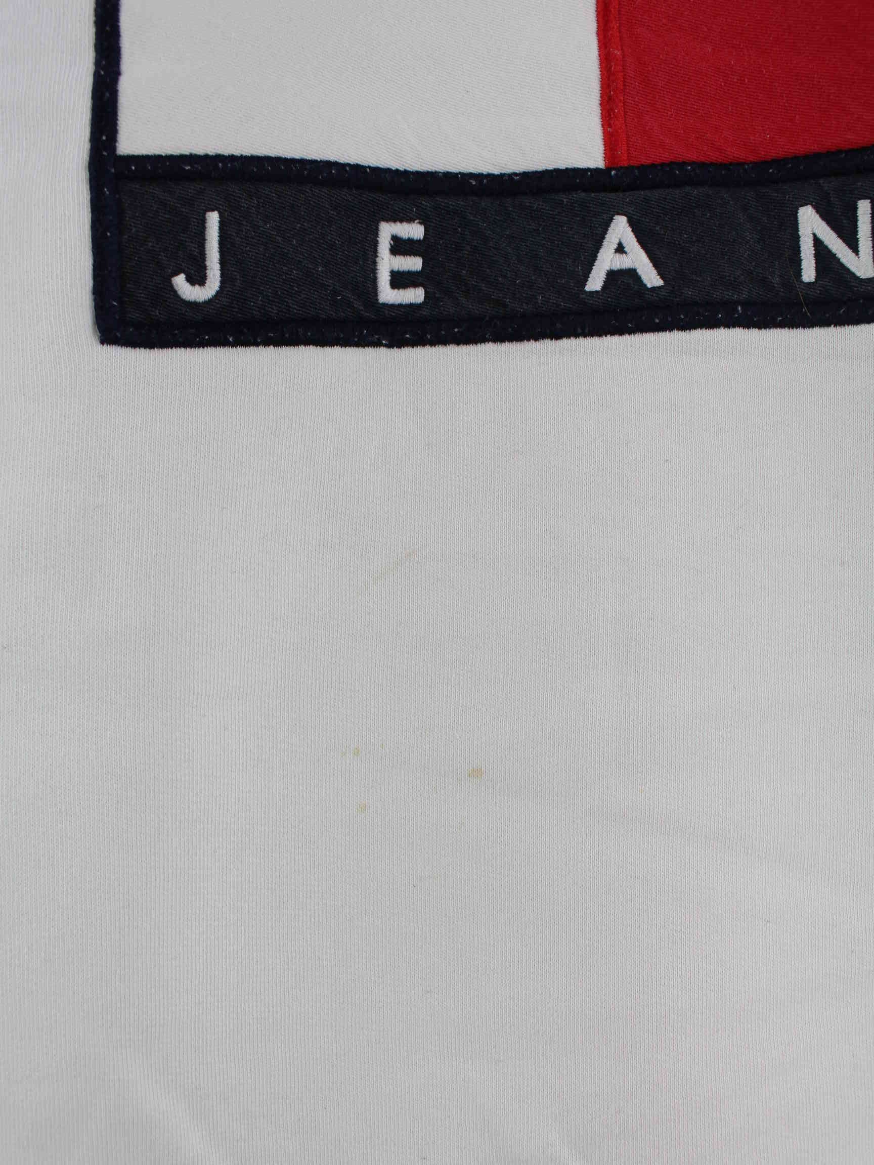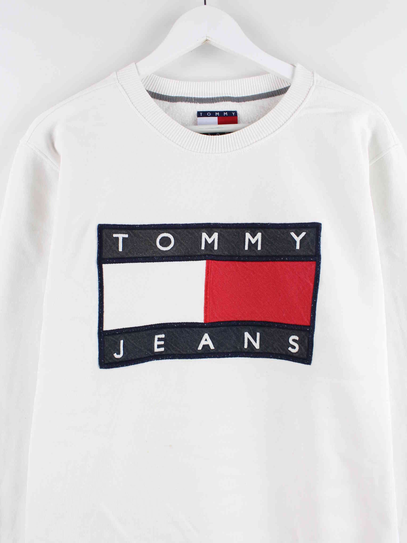 Sweater der Marke Tommy Hilfiger mit gesticktem Logo in Größe L. Er ist aus einer Baumwollmischung und in Weiß auf Lager.
