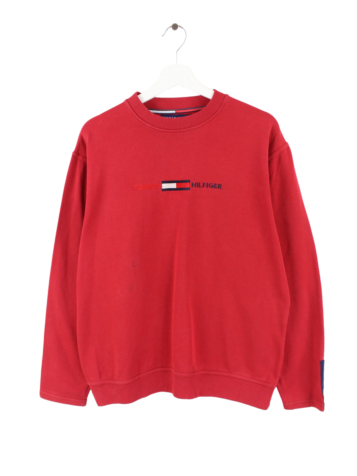 Roter Tommy Hilfiger Sweater mit aufgesticktem Logo.
