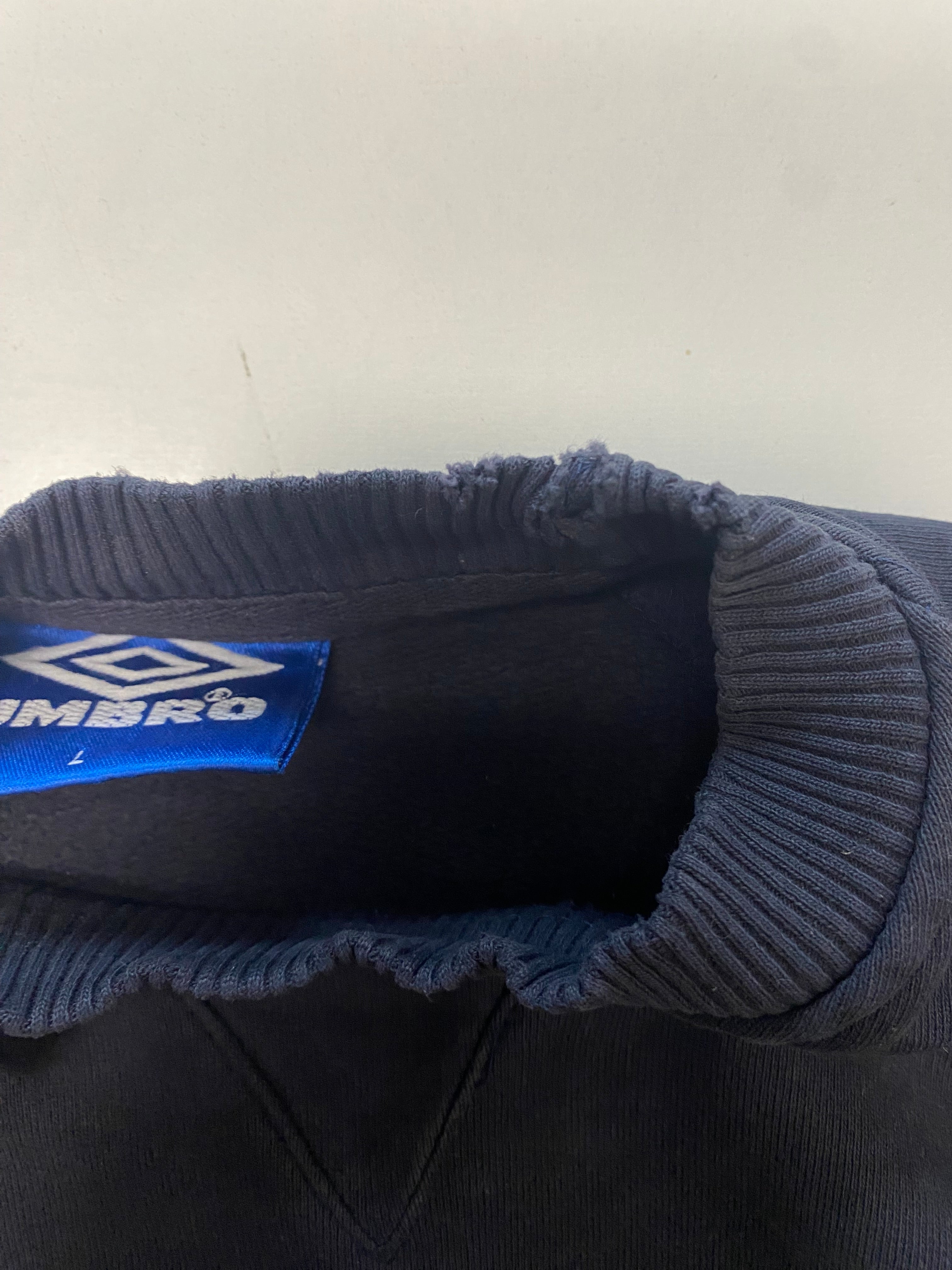 Schwarzer Sweater mit gesticktem Logo der Marke Umbro aus den 90'ern in Größe L. Er ist aus einer Baumwollmischung hergestellt bei uns vorrätig