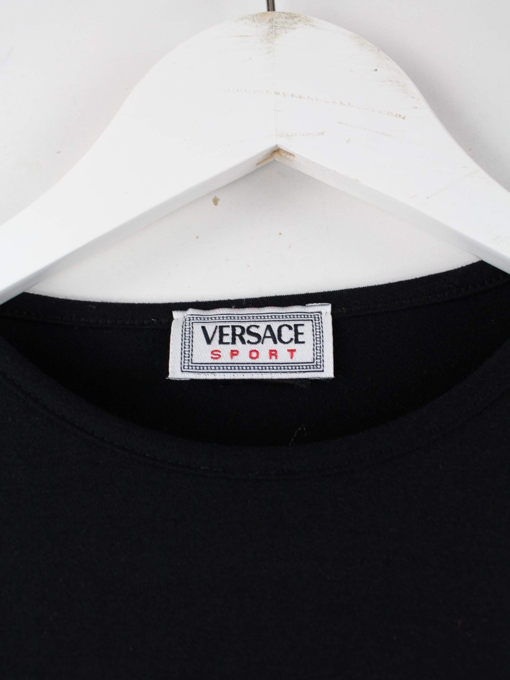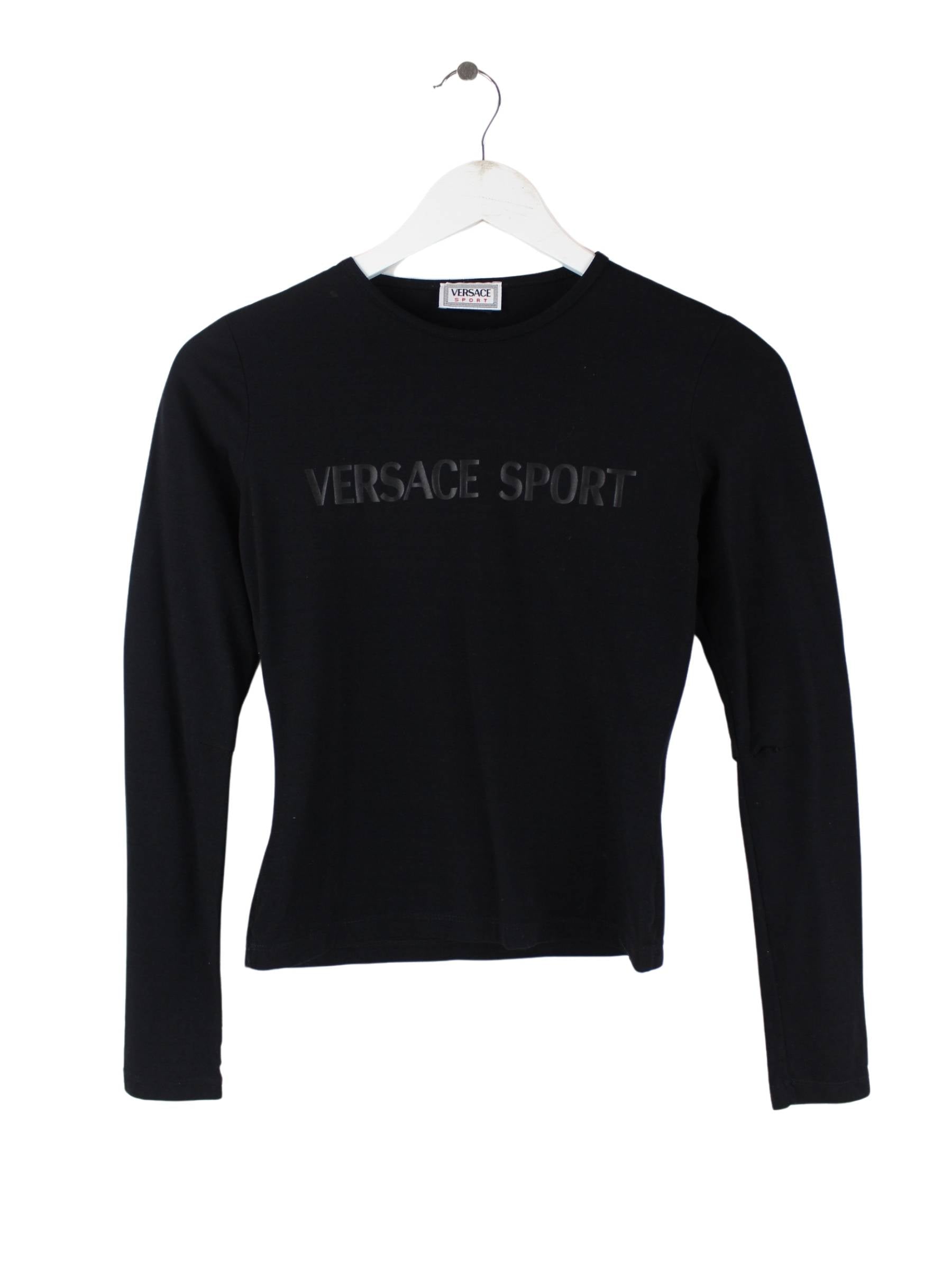Schwarzes Sweatshirt vom Label Versace in Größe M. Es ist aus einer Synthetikmischung und in sehr gutem Zustand vorrätig. Mit schönem Print.