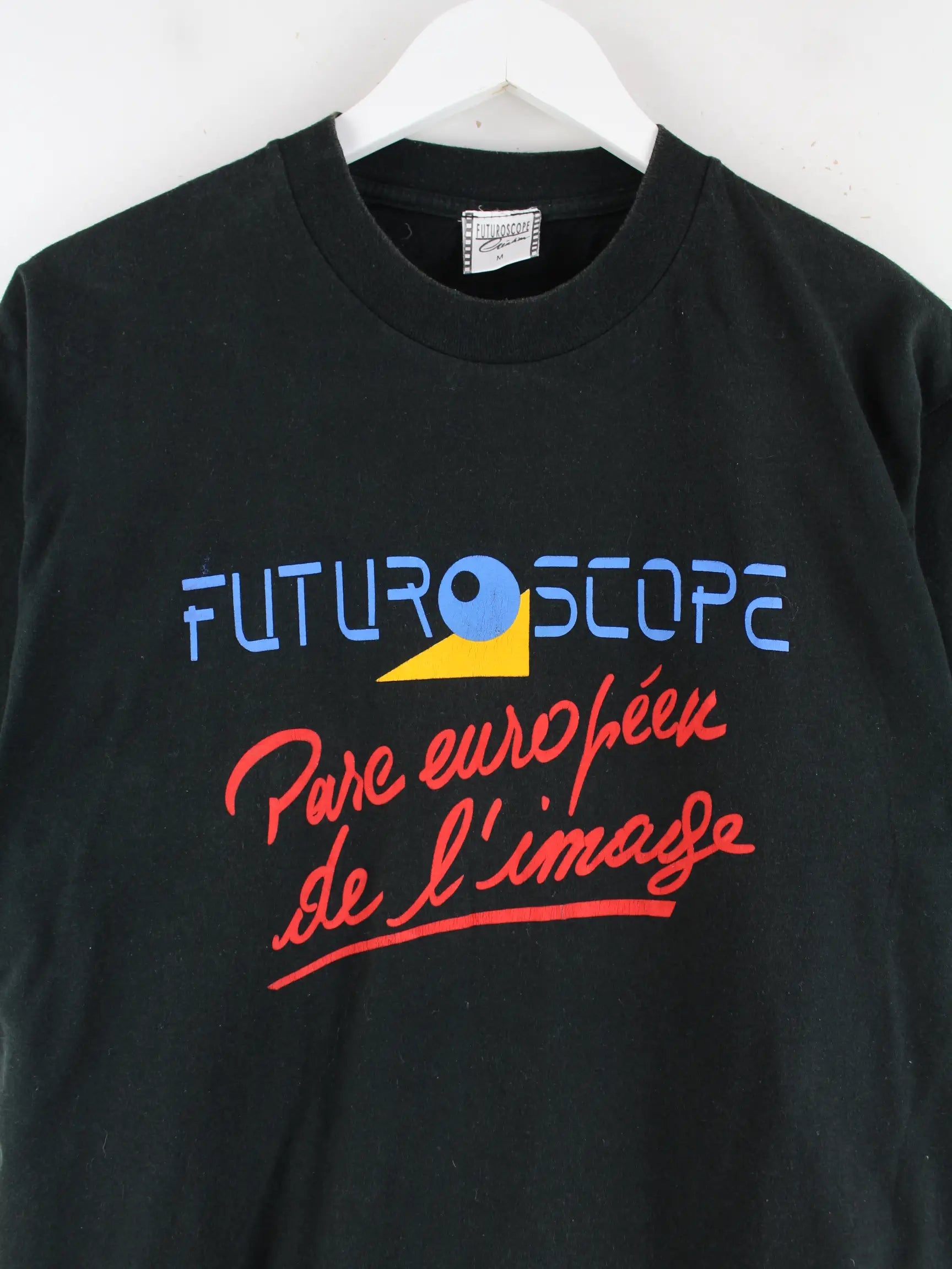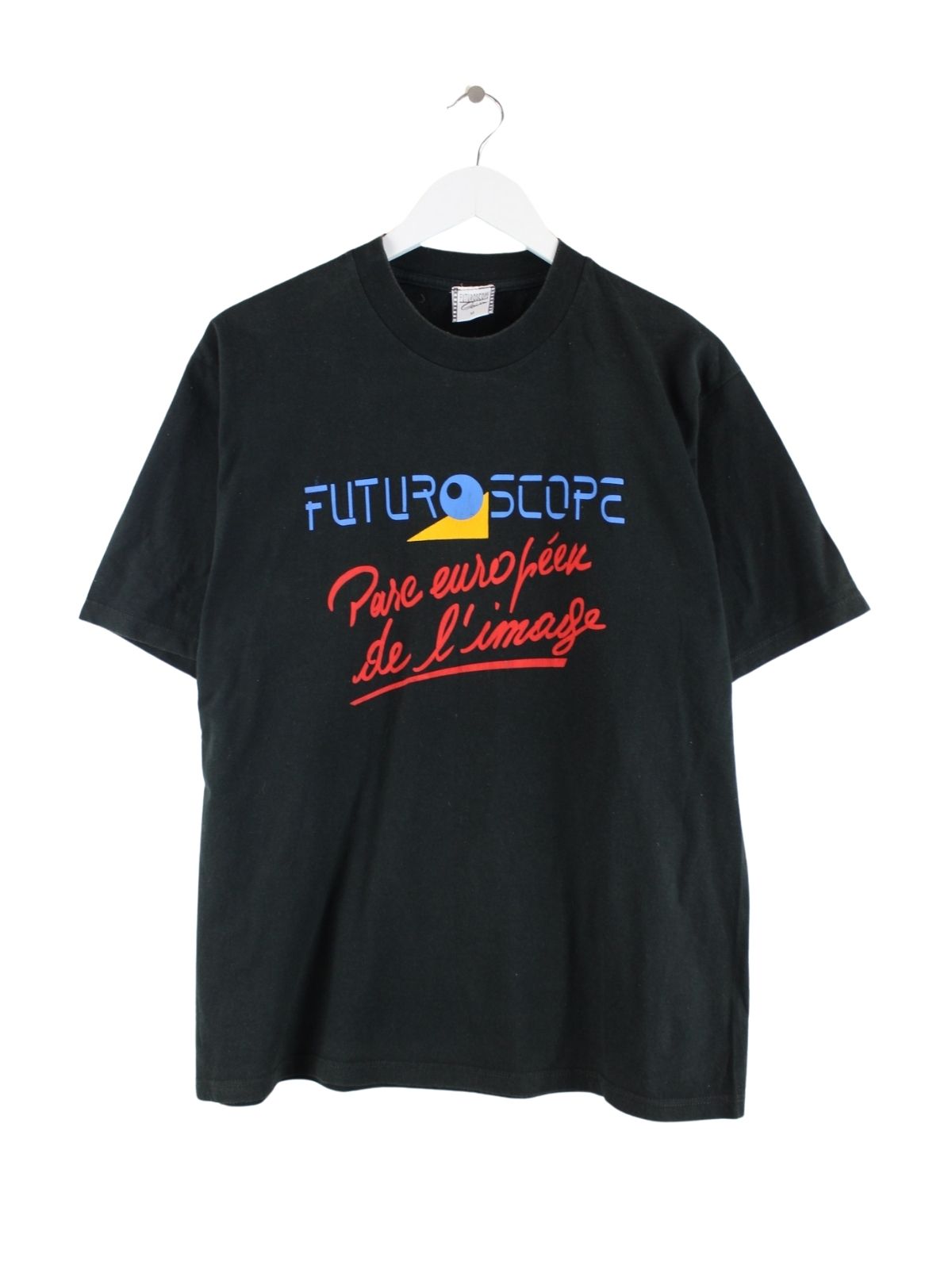 Vintage T-Shirt in Größe M. Es ist aus Baumwolle und in Schwarz vorrätig. Mit schickem Futuroscope Print.