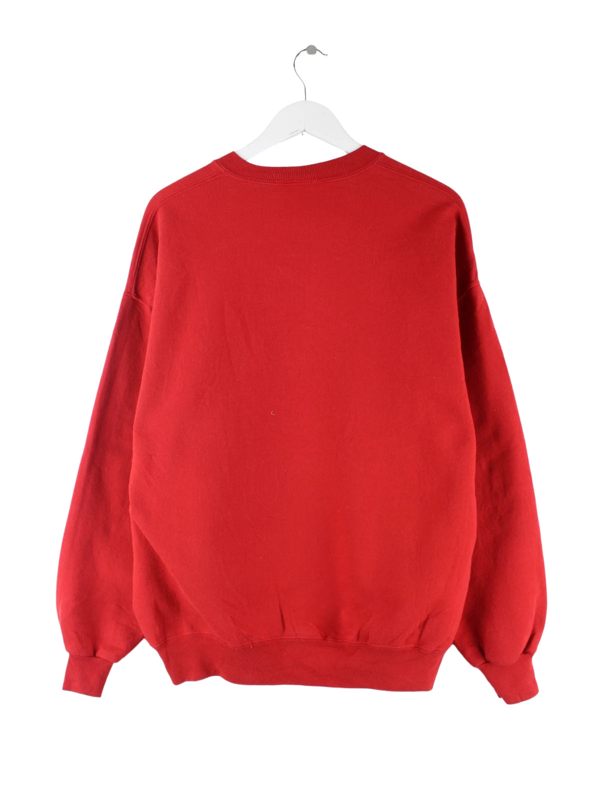 Roter Vintage Sweater mit gesticktem Logo in Größe XL. Er ist aus einer Baumwollmischung angefertigt und in sehr gutem Zustand lieferbar.