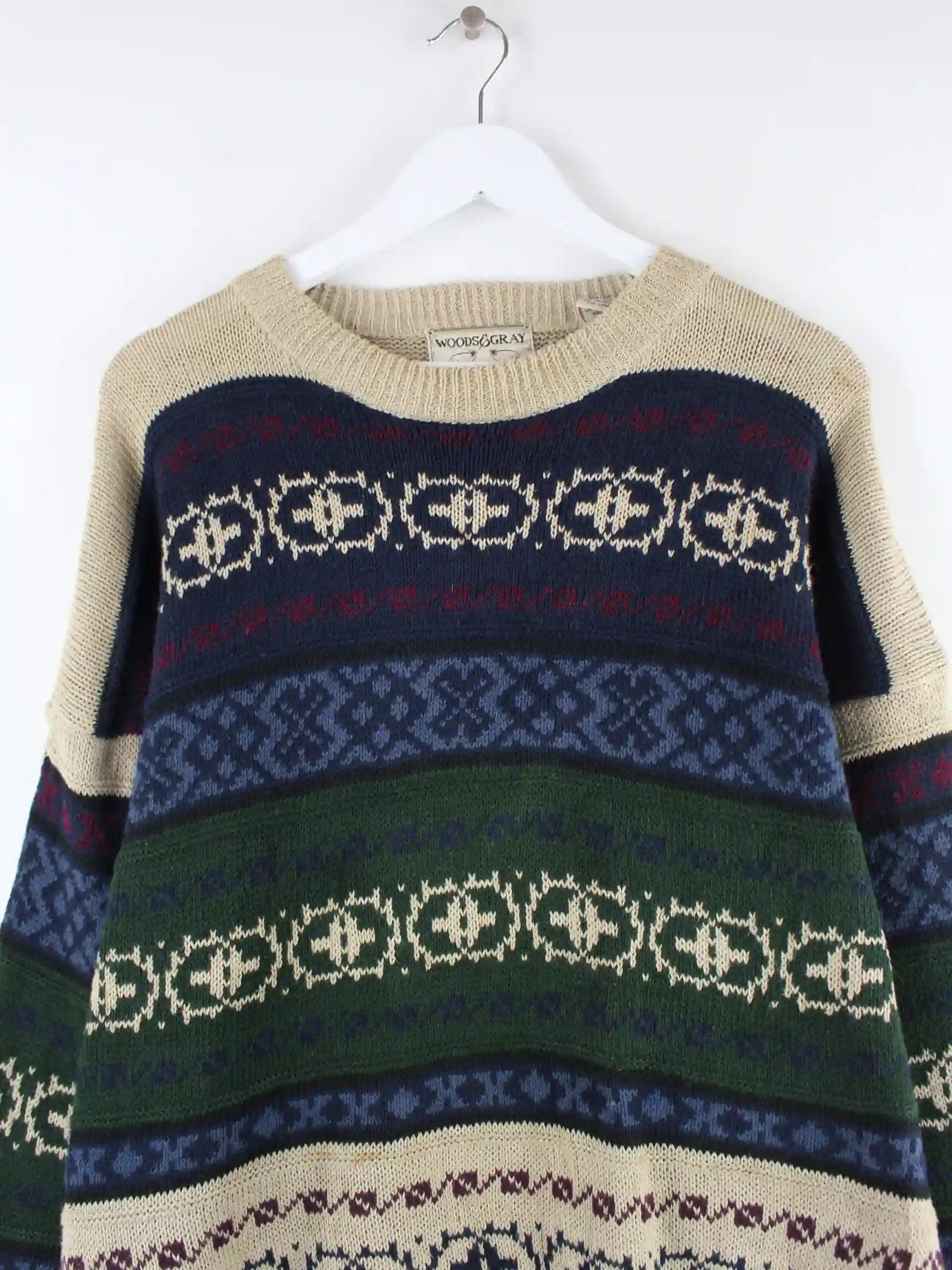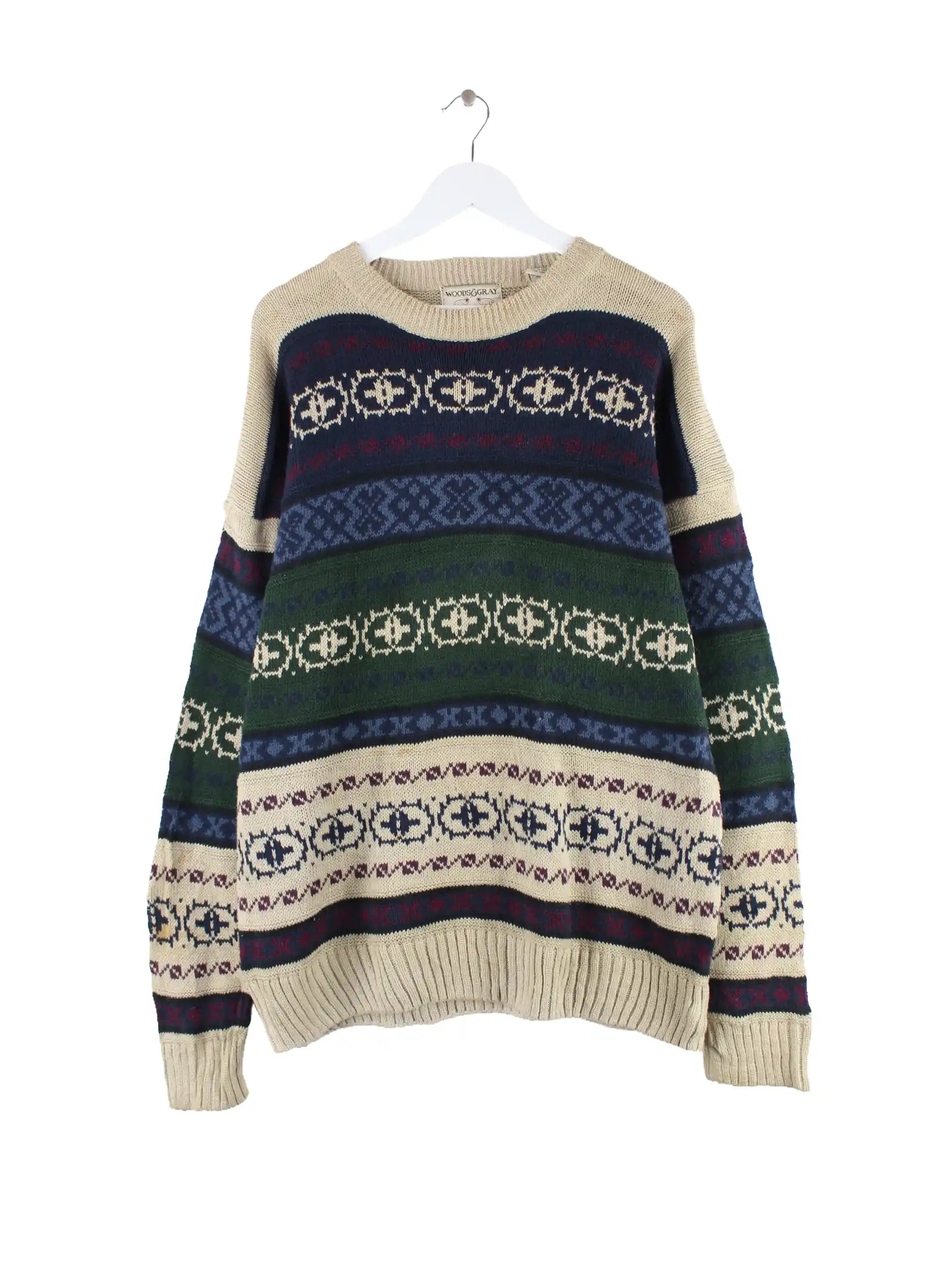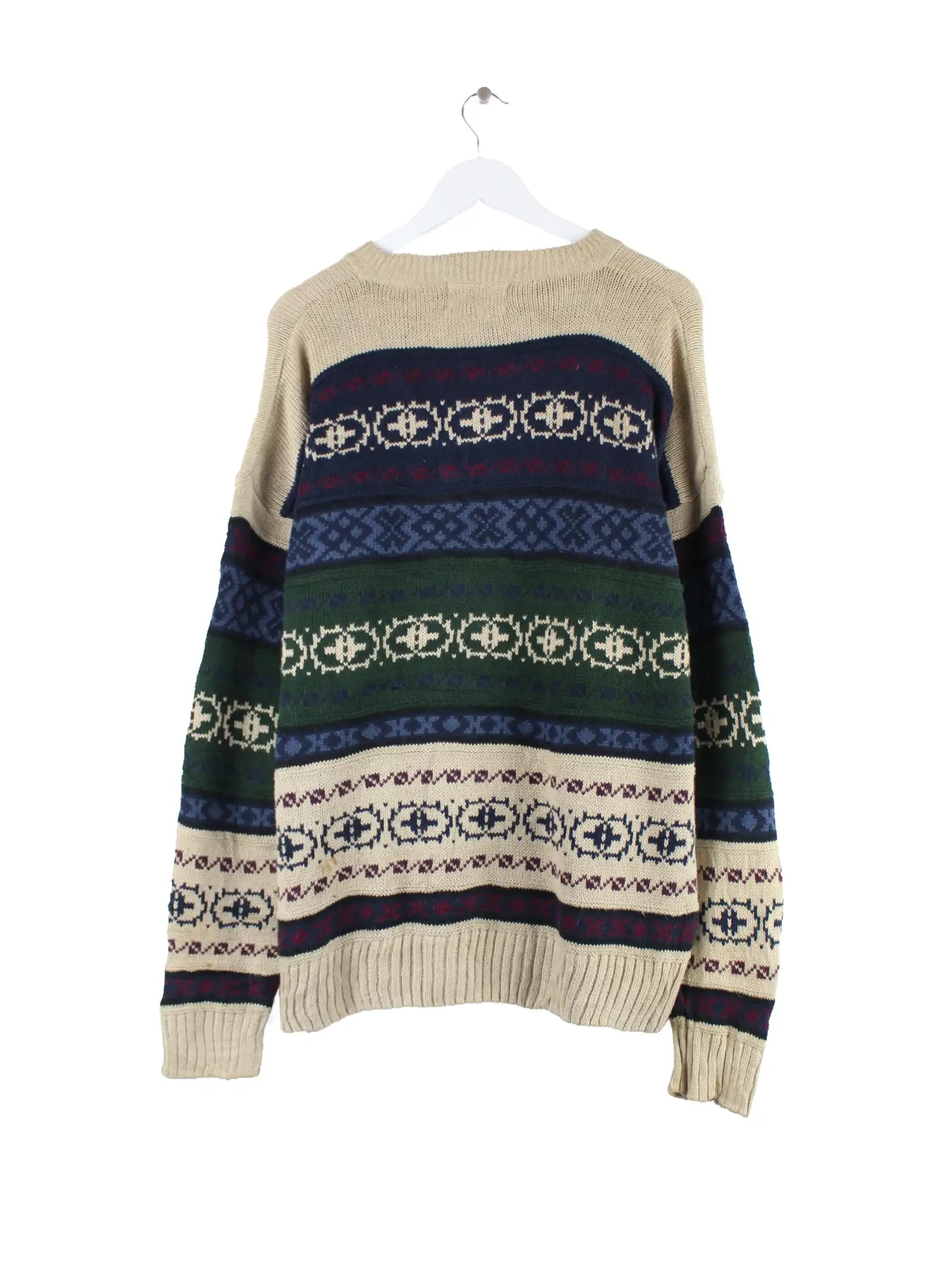 Mehrfarbiger Vintage Pullover in Größe L. Er ist aus einer Baumwollmischung angefertigt. Den Zustand würden wir als 'In Ordnung' bezeichnen (vergl. Bilder).