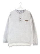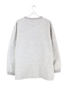 Grauer Vintage Sweater mit gesticktem Logo in Größe L. Er ist aus einer Baumwollmischung angefertigt und in sehr gutem Zustand zu haben.