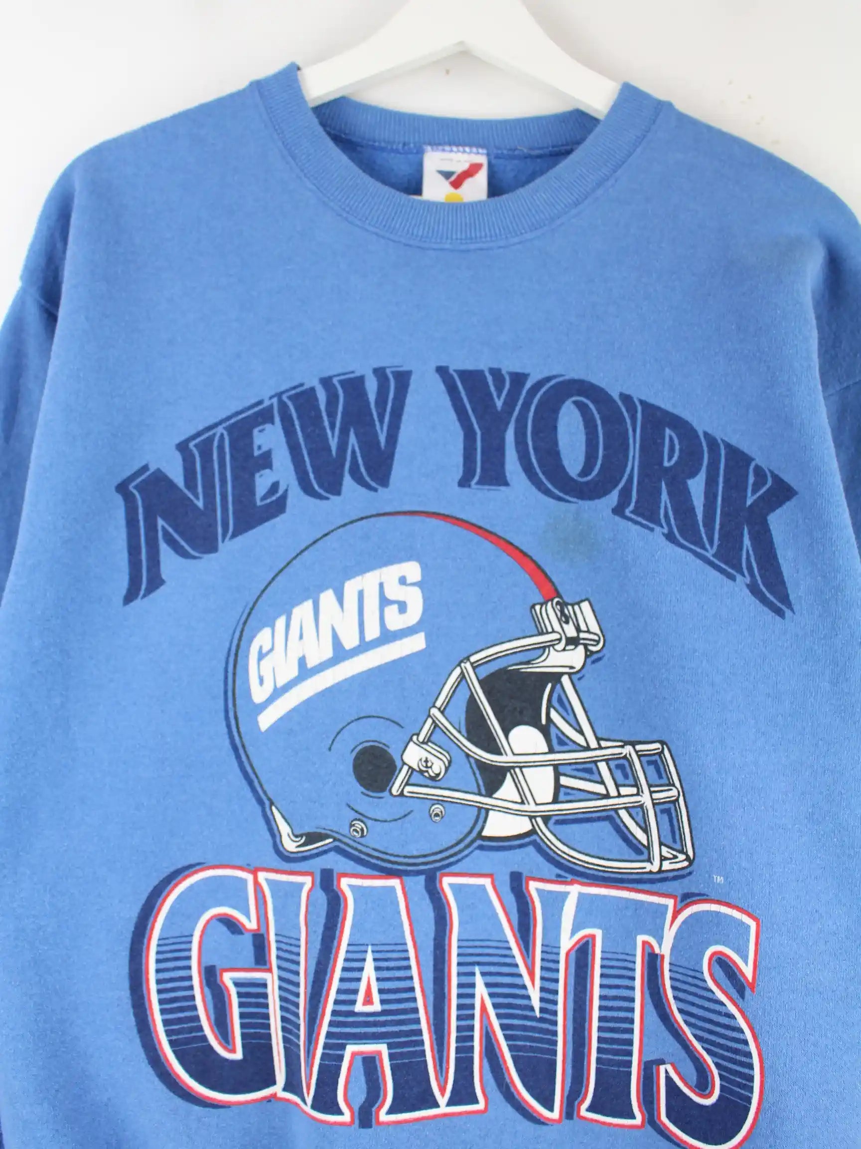 Blauer Vintage Sweater in Größe M. Er ist aus einer Baumwollmischung angefertigt. Den Zustand würden wir als 'In Ordnung' bezeichnen (vergl. Bilder).Mit chiquem Giants Print.