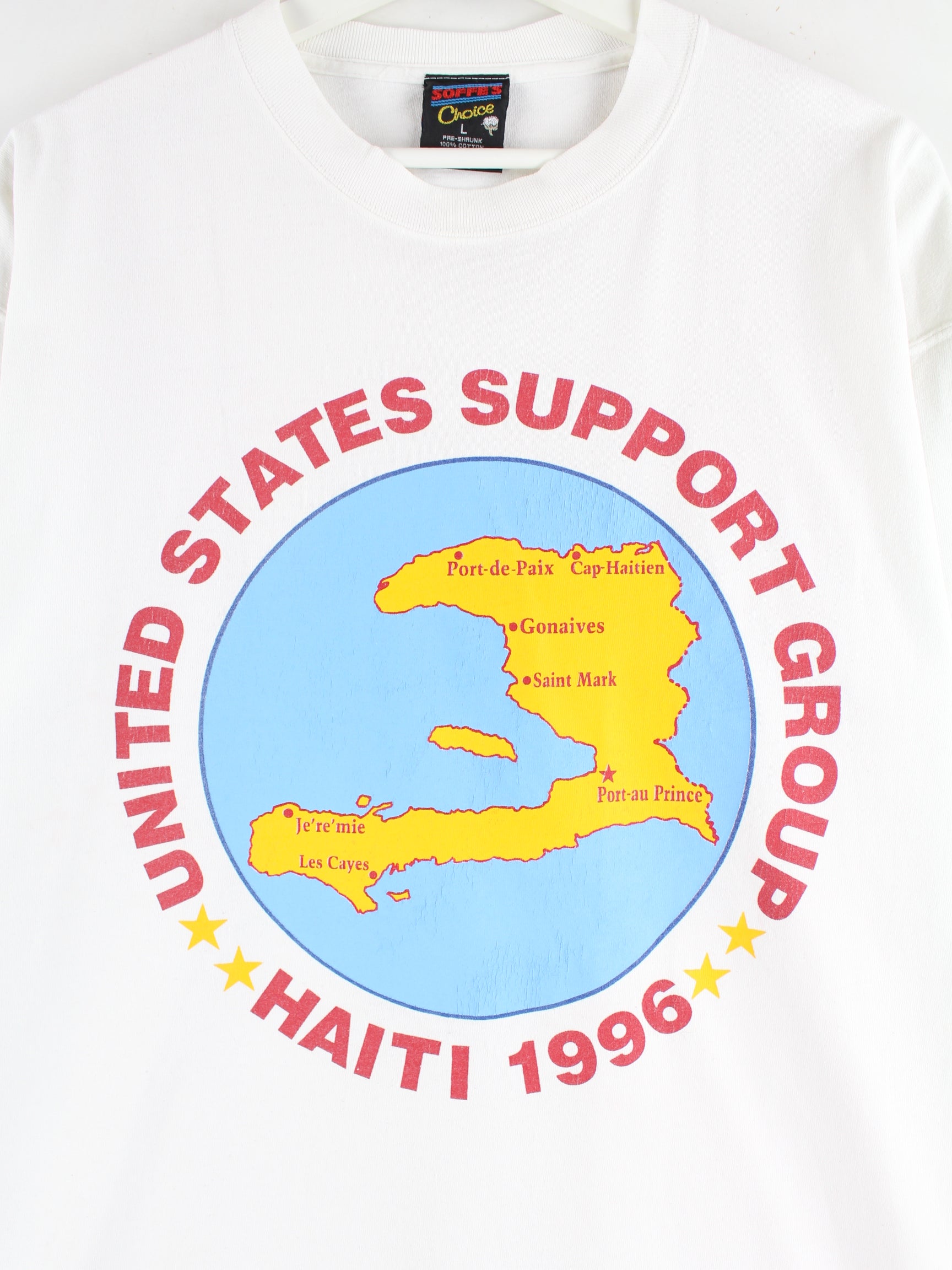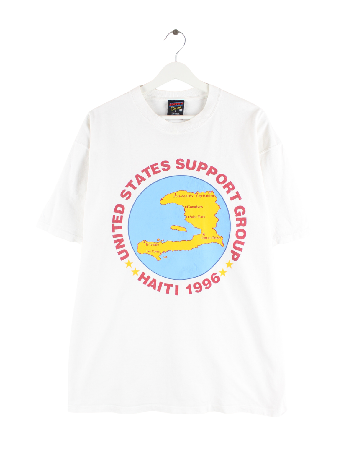 Weißes Vintage T-Shirt in Größe L. Es ist aus einer Baumwollmischung gefertigt und in sehr gutem Zustand zu bekommen. Mit tollem Haiti Print.