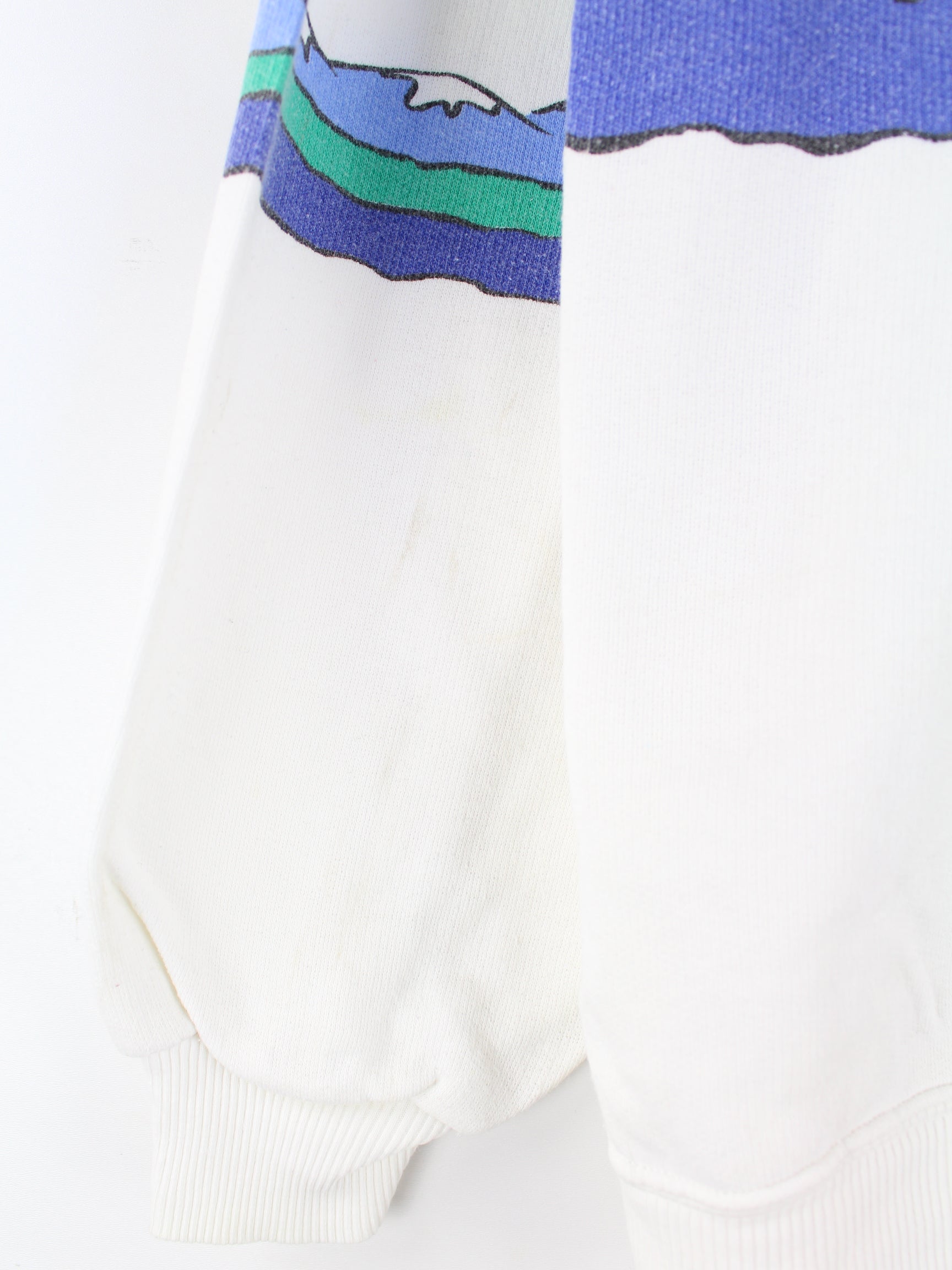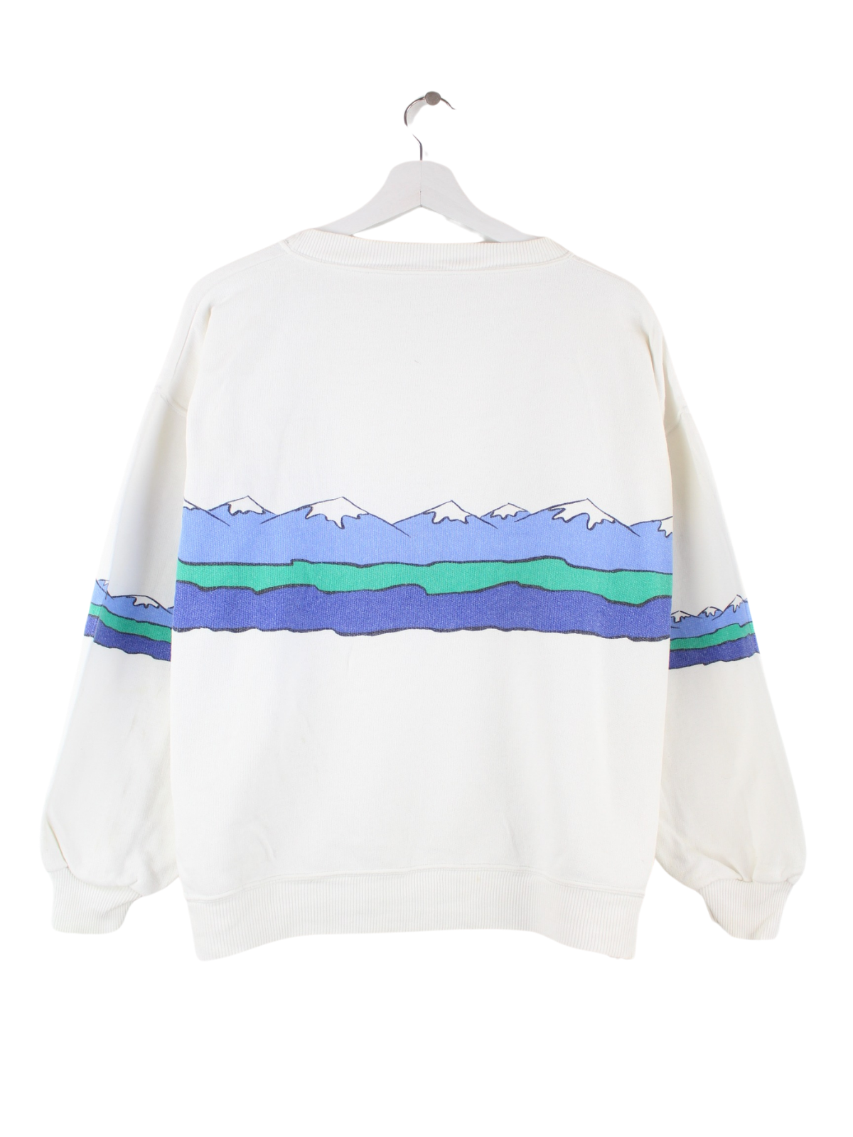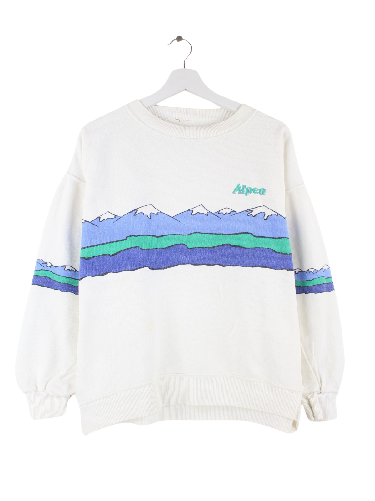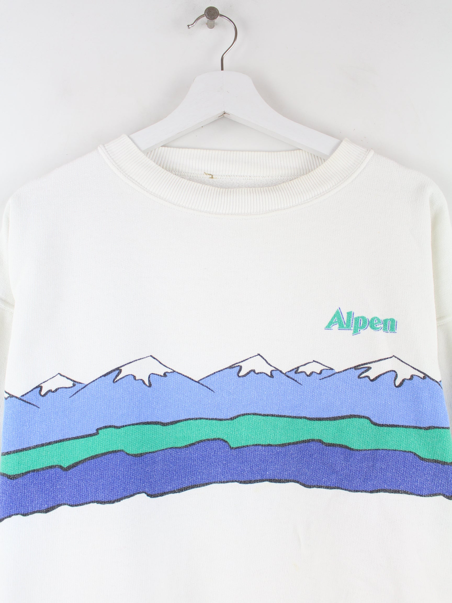 Weißer Vintage Sweater aus den 80'ern in Größe L. Er ist aus einer Baumwollmischung und in gutem Zustand bei uns zu bekommen. Mit schönem Alpen Print.