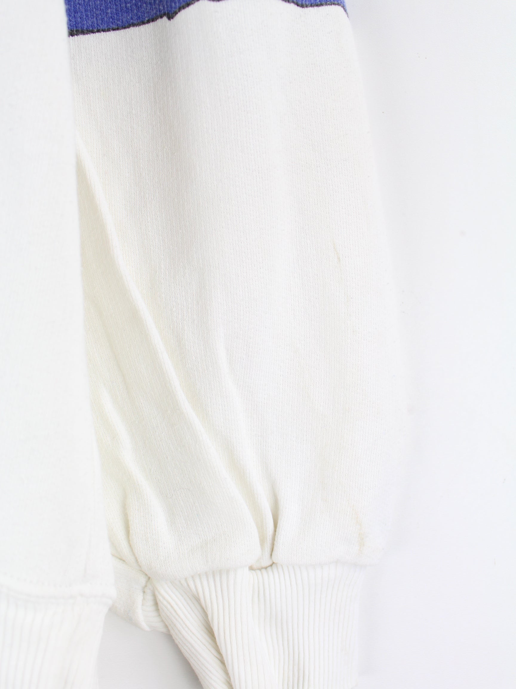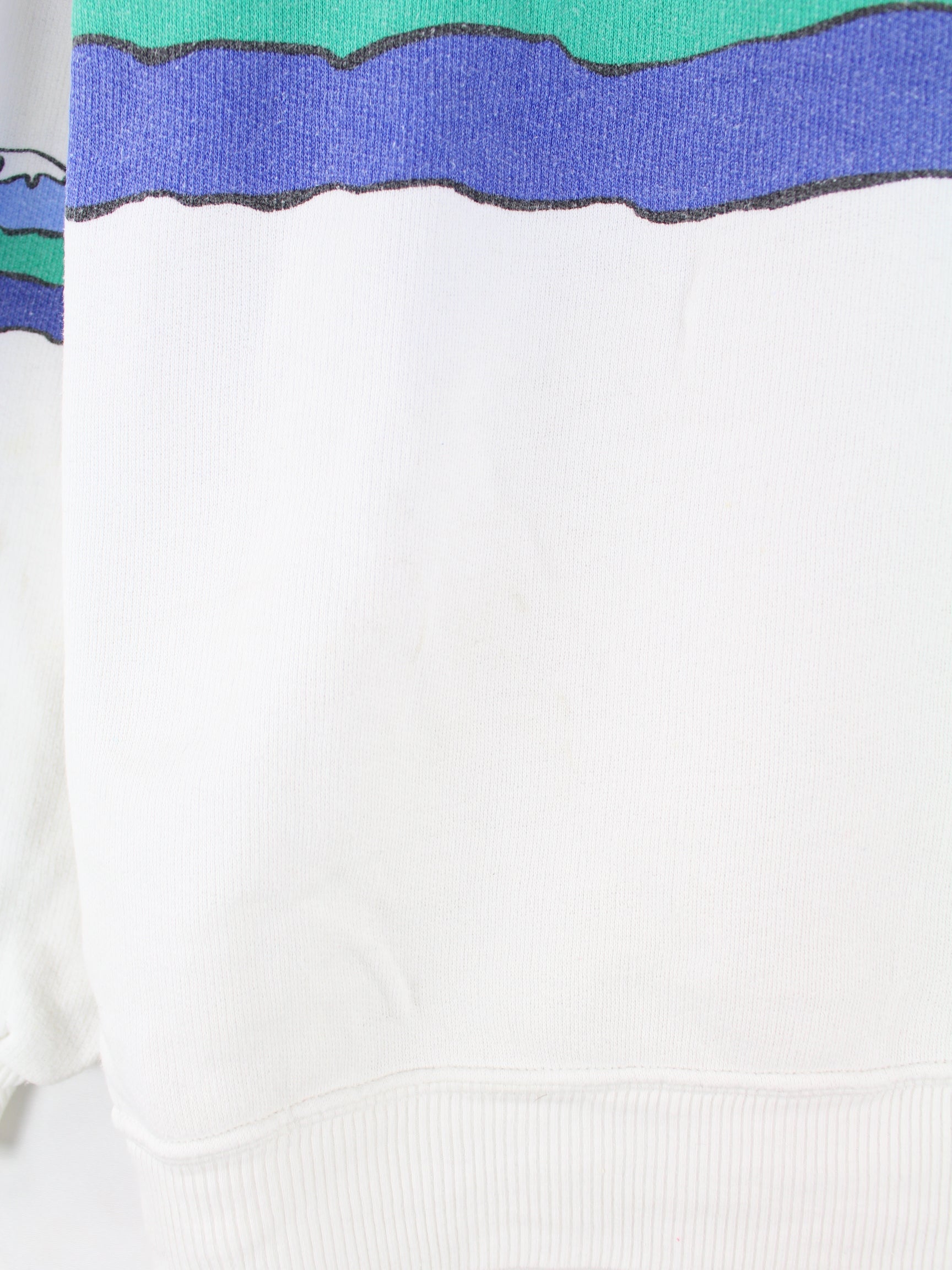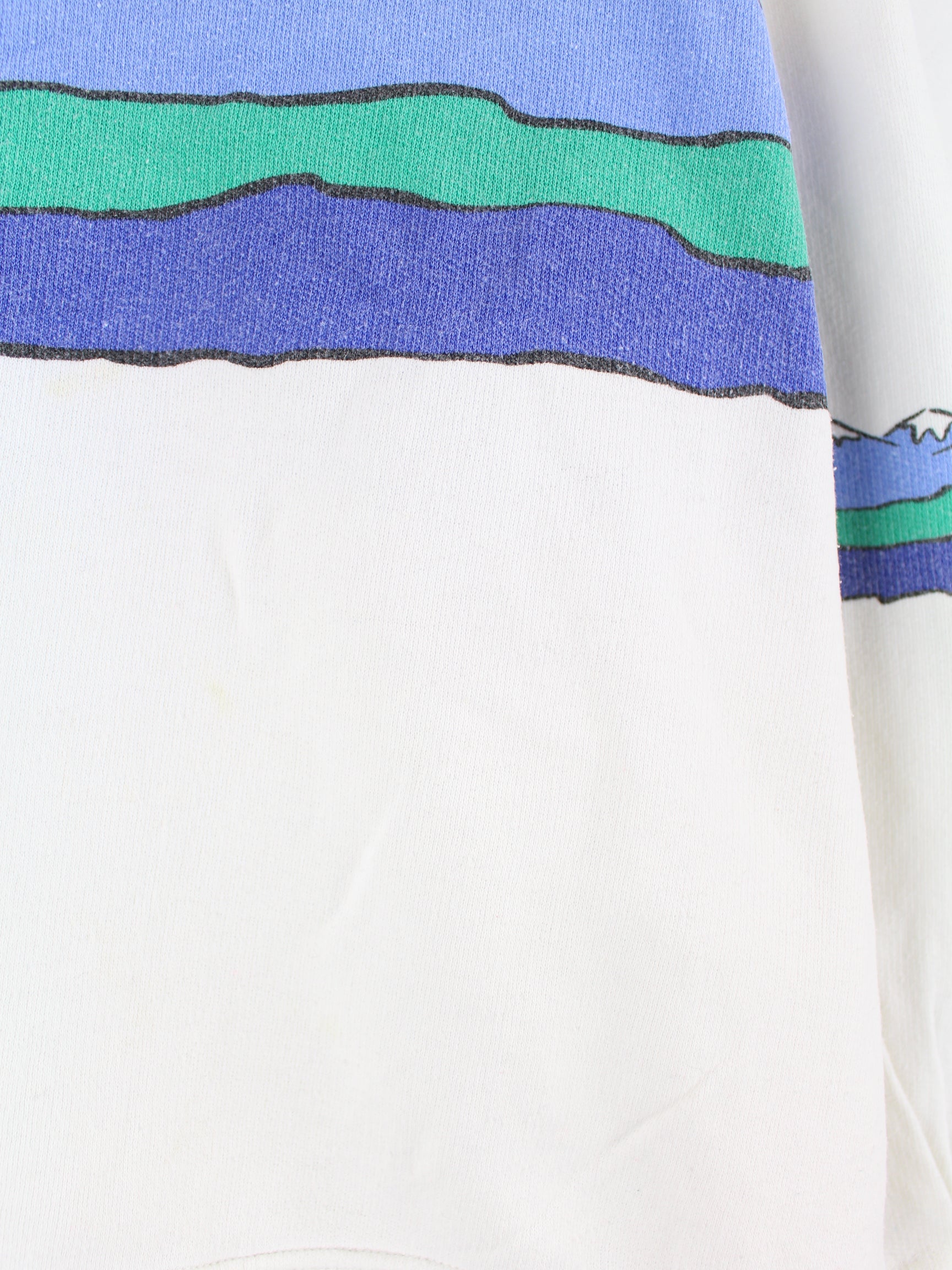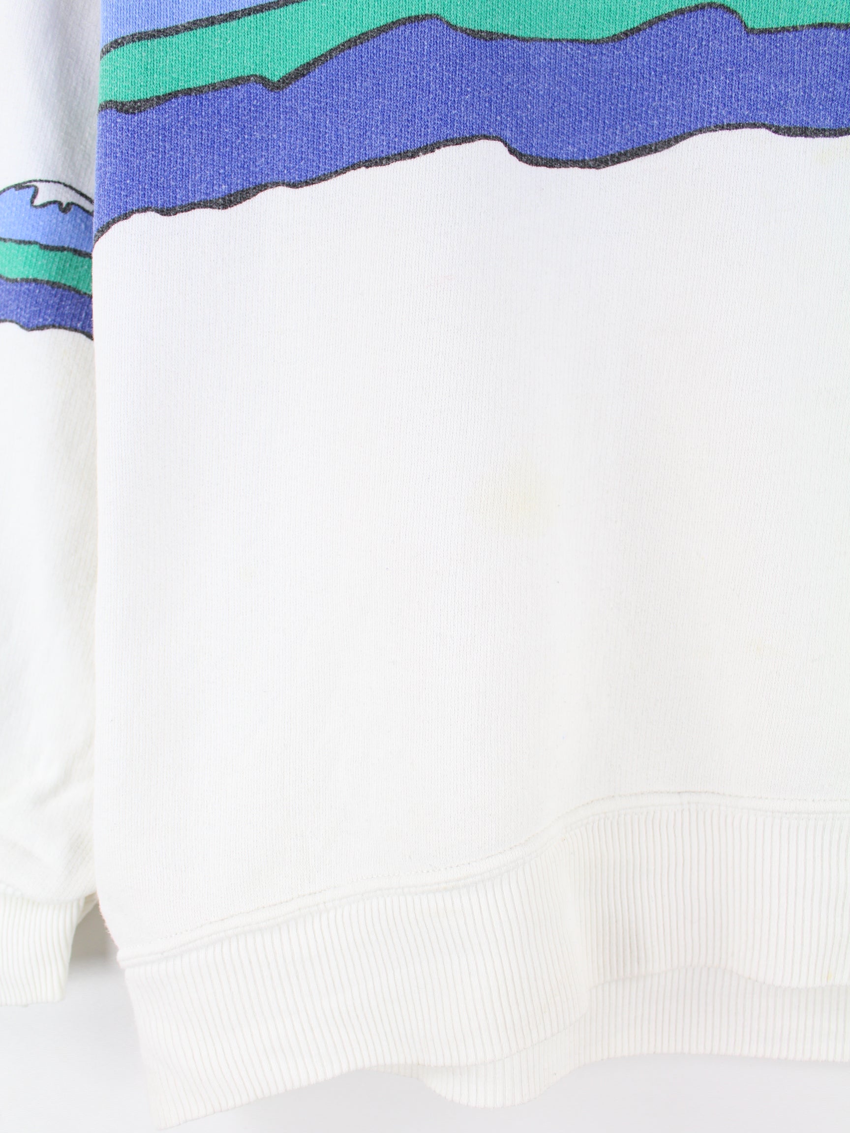 Weißer Vintage Sweater aus den 80'ern in Größe L. Er ist aus einer Baumwollmischung und in gutem Zustand bei uns zu bekommen. Mit schönem Alpen Print.