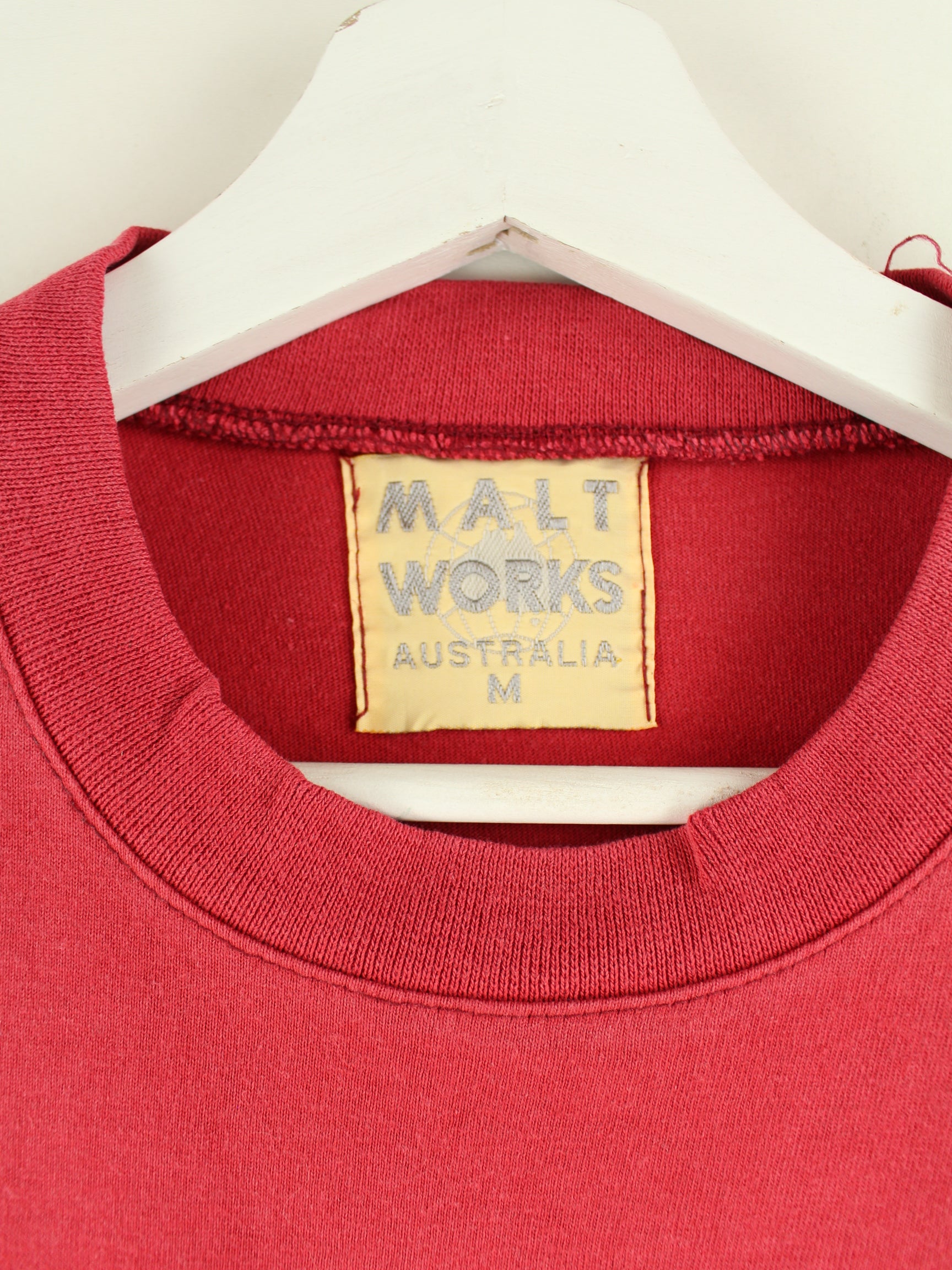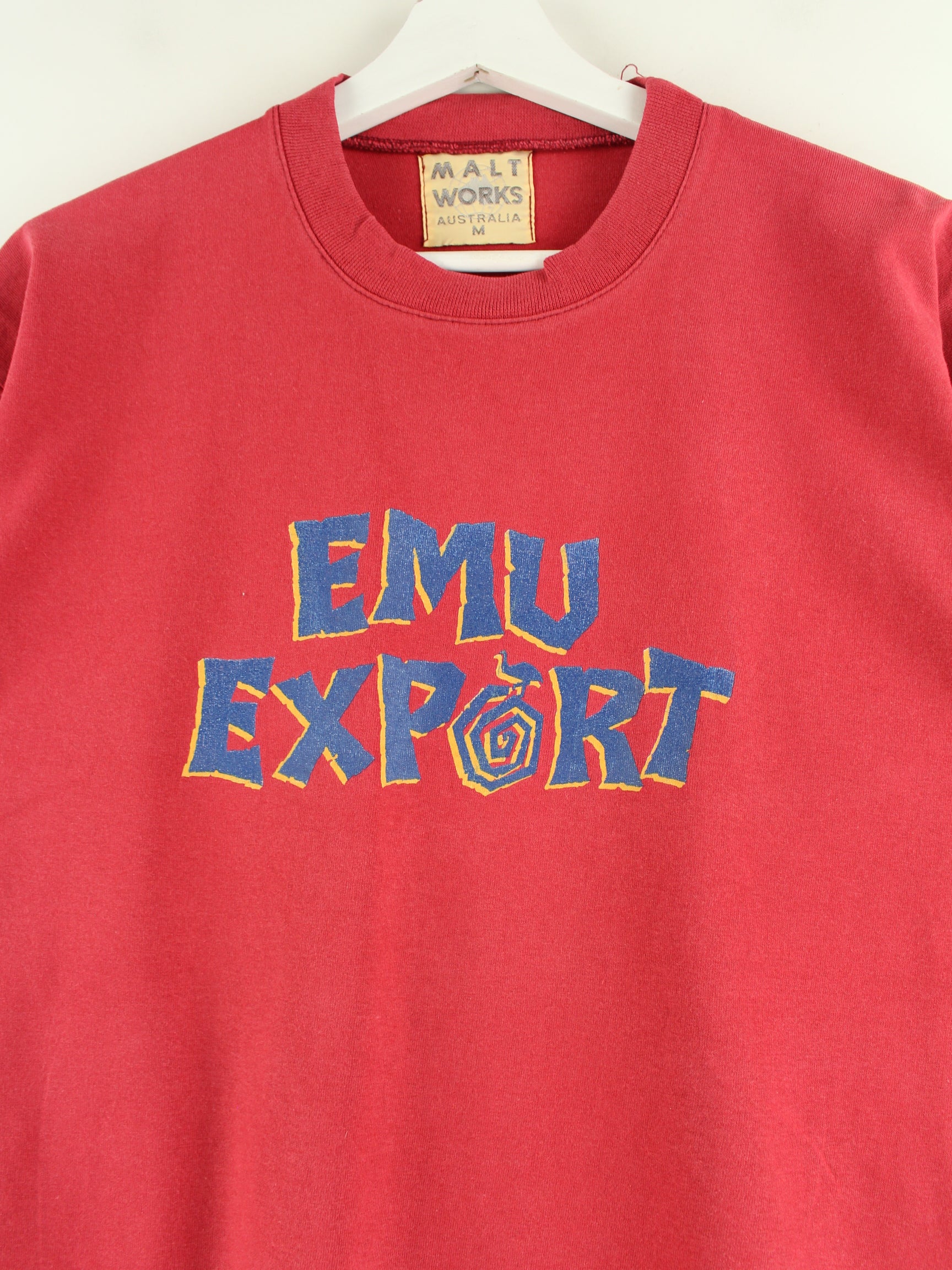 Rotes Vintage Single Stitch Emu Export T-Shirt aus den 80'ern in Größe M. Es ist aus einer Baumwollmischung produziert und in gutem Zustand auf Lager.
