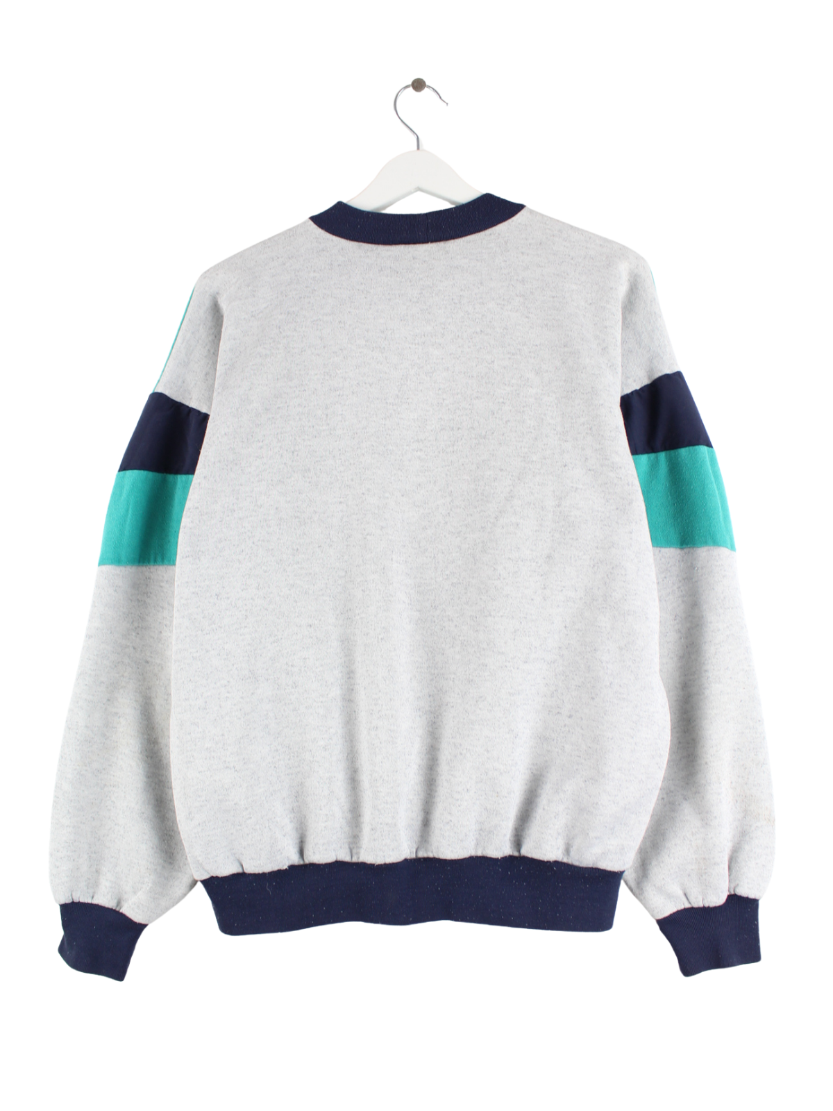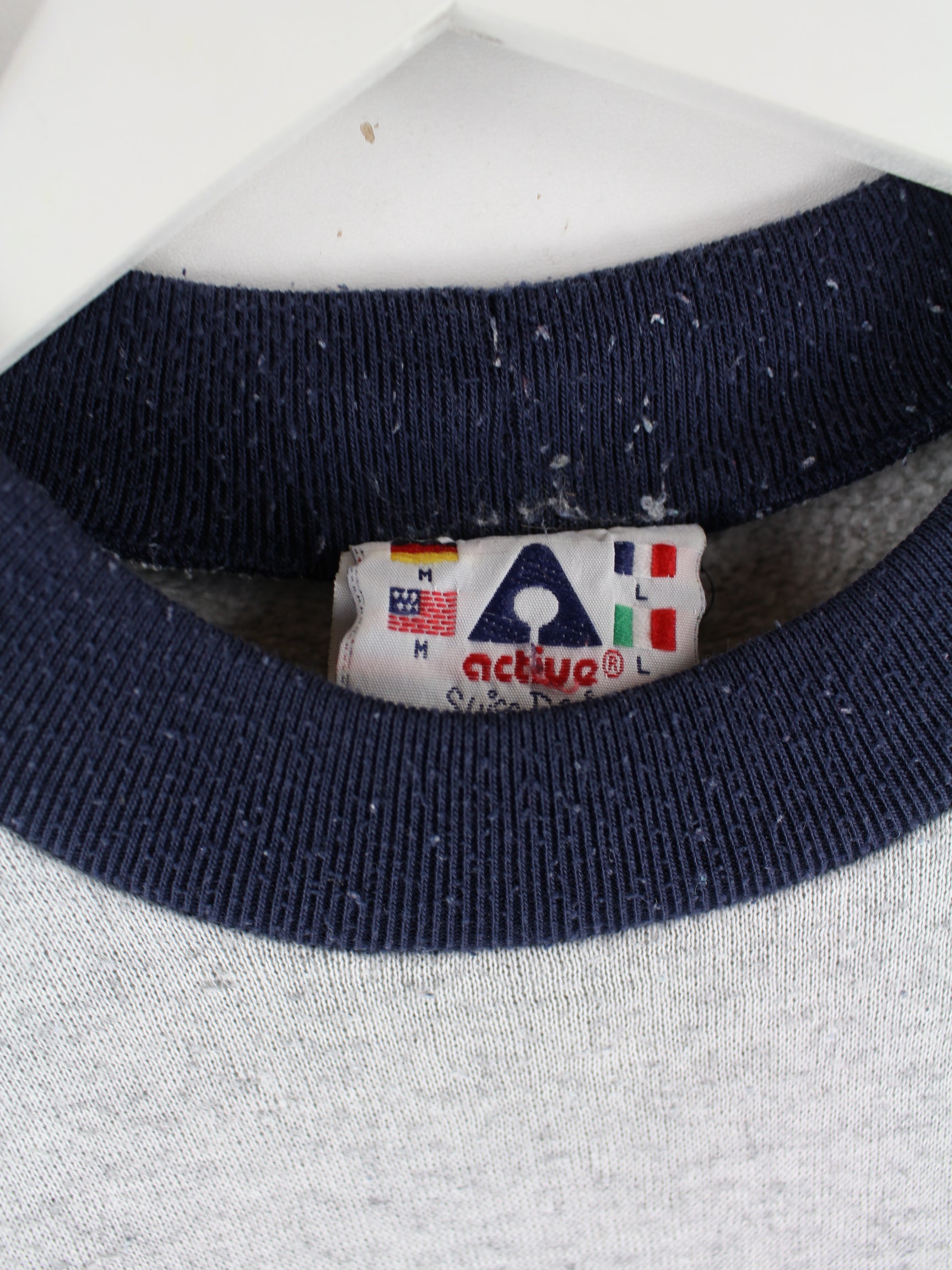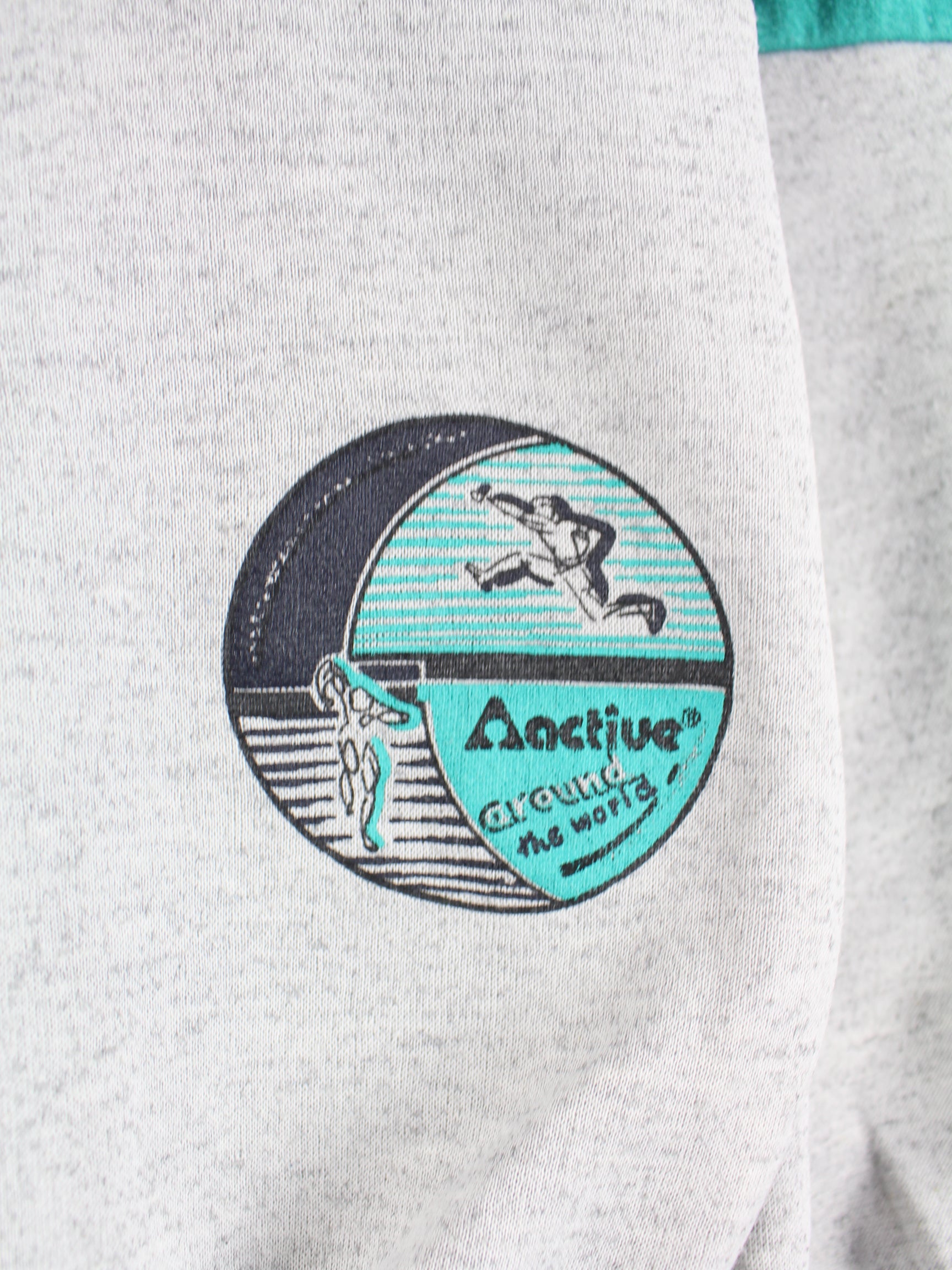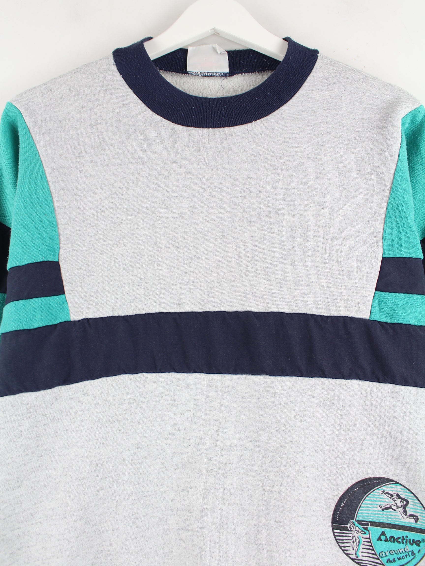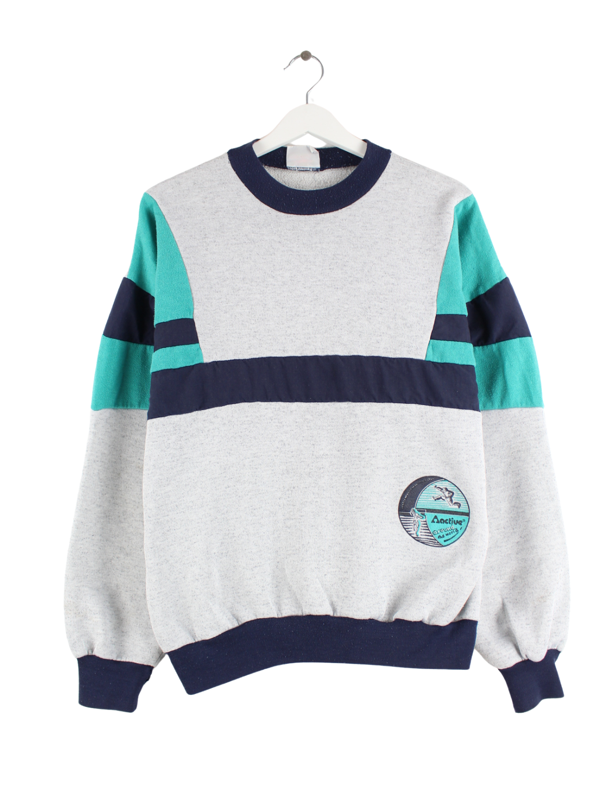 Grauer Vintage Sweater aus den 90'ern in Größe S. Er ist aus einer Baumwollmischung gemacht und in gutem Zustand auf Lager. Mit tollem Active Print.
