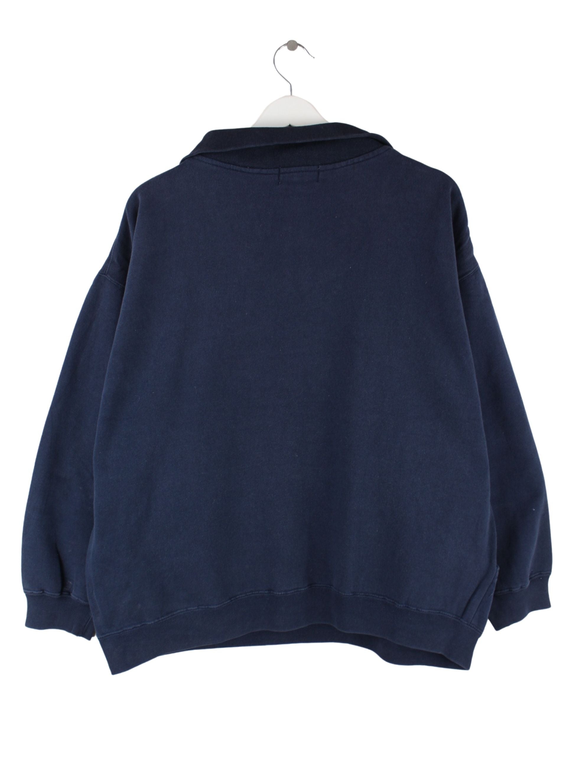 Vintage Sweater mit gesticktem Logo und half Zip in Größe M aus den 90'ern. Er ist aus einer Baumwollmischung hergestellt und in Blau lieferbar.